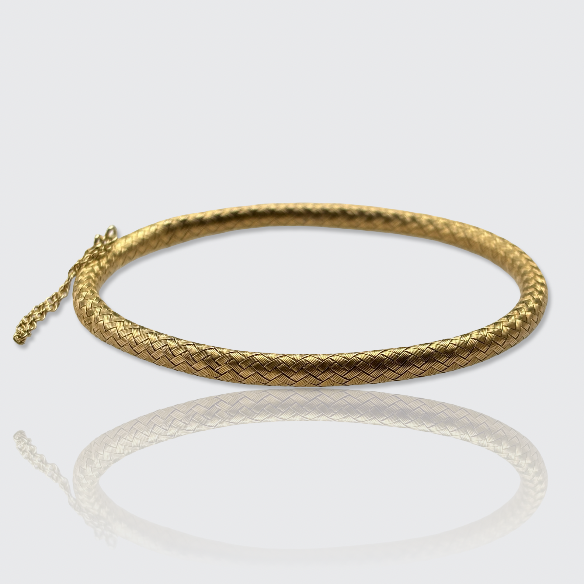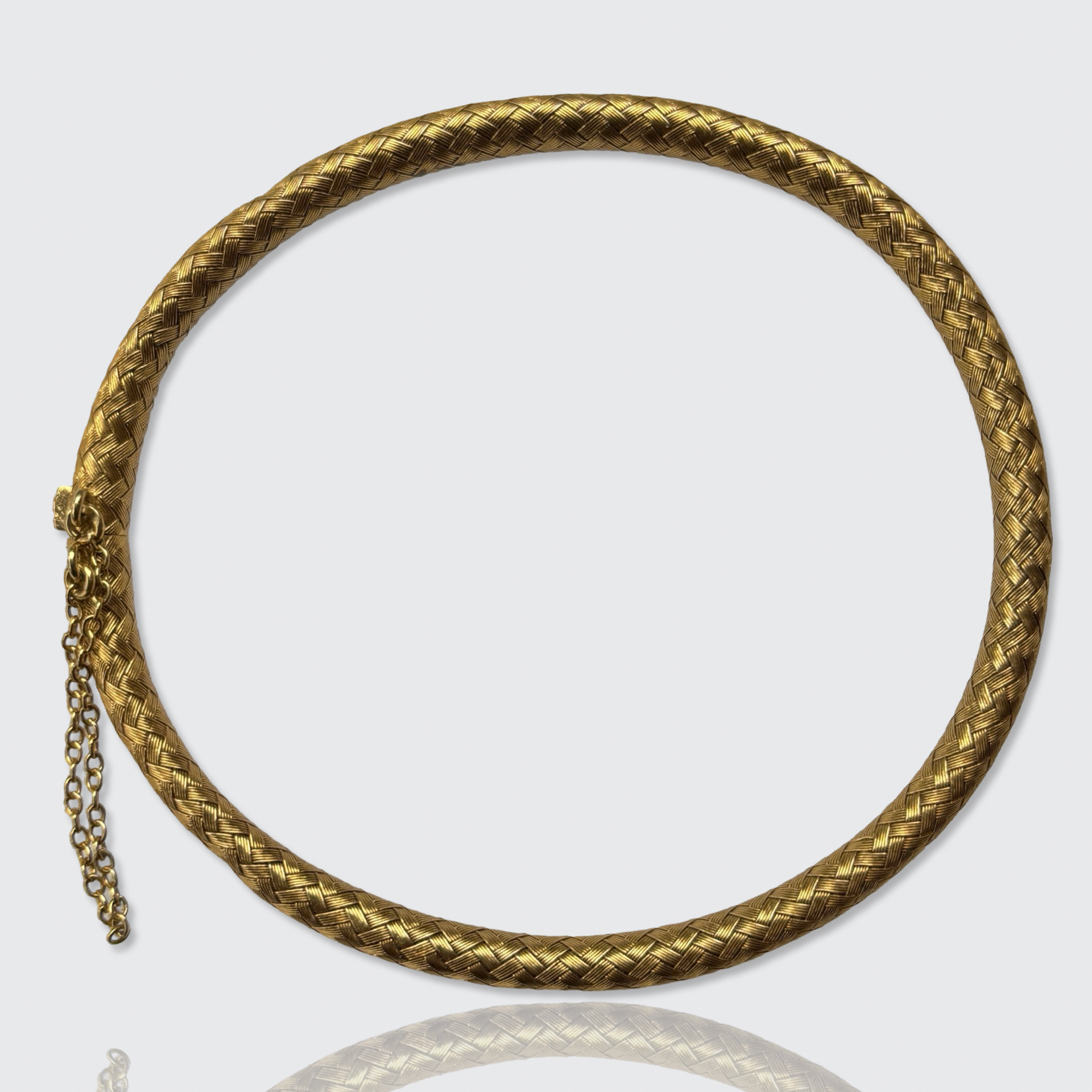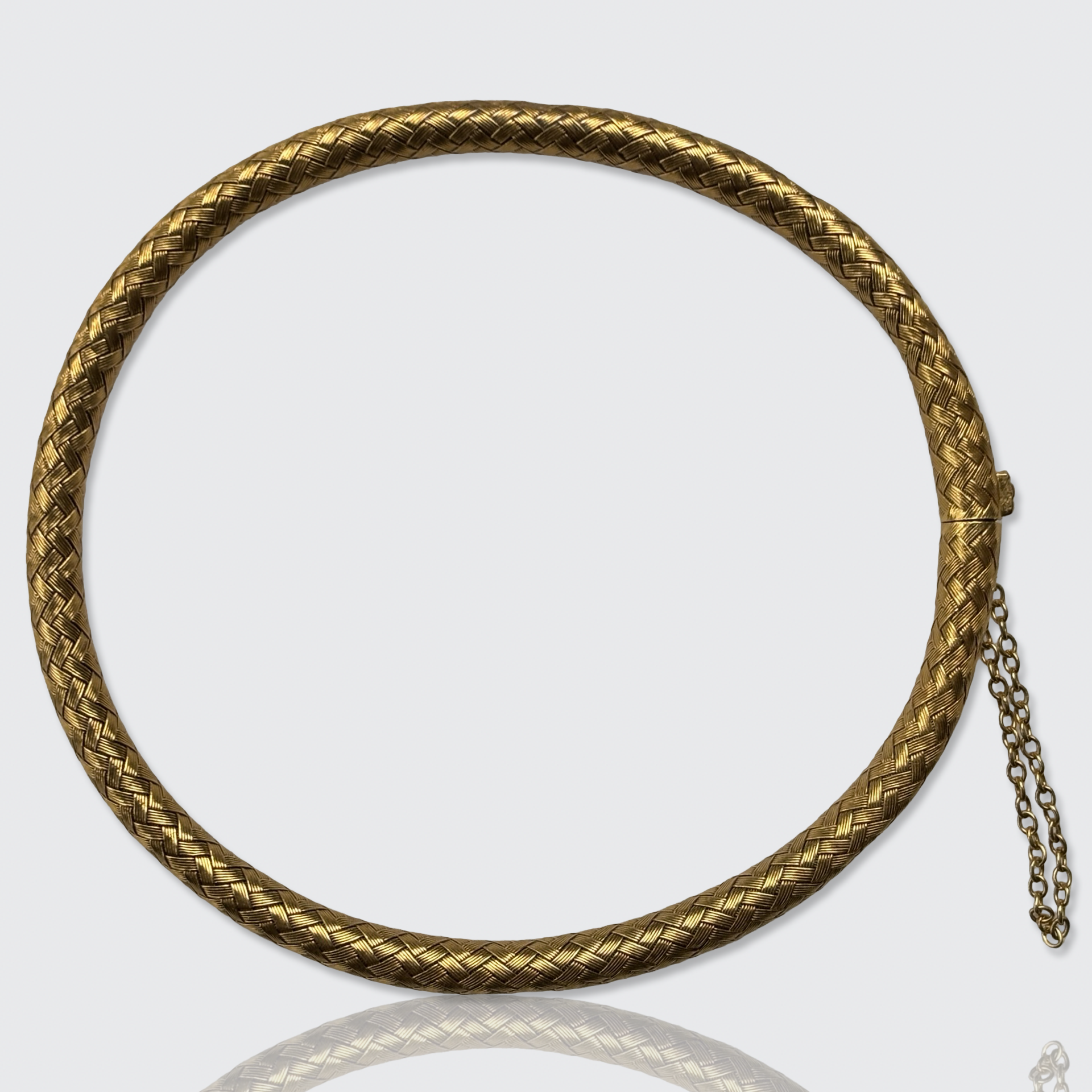 This stunningly well-made 18k gold bracelet is crafted from braided gold wires that form a hollow, flexible tube, making it very comfortable to wear. It is fitted with a safety chain, to prevent it from slipping off unnoticed.