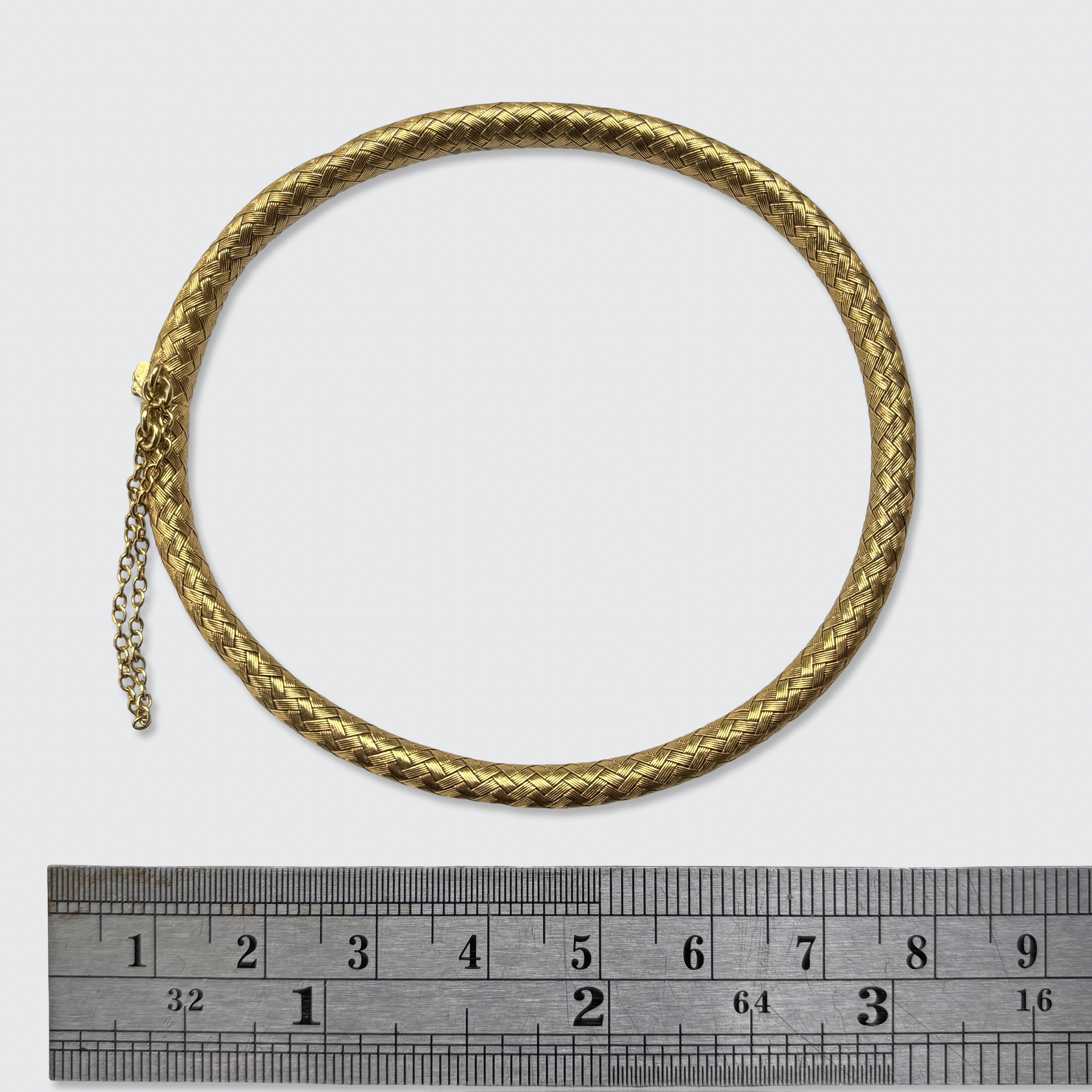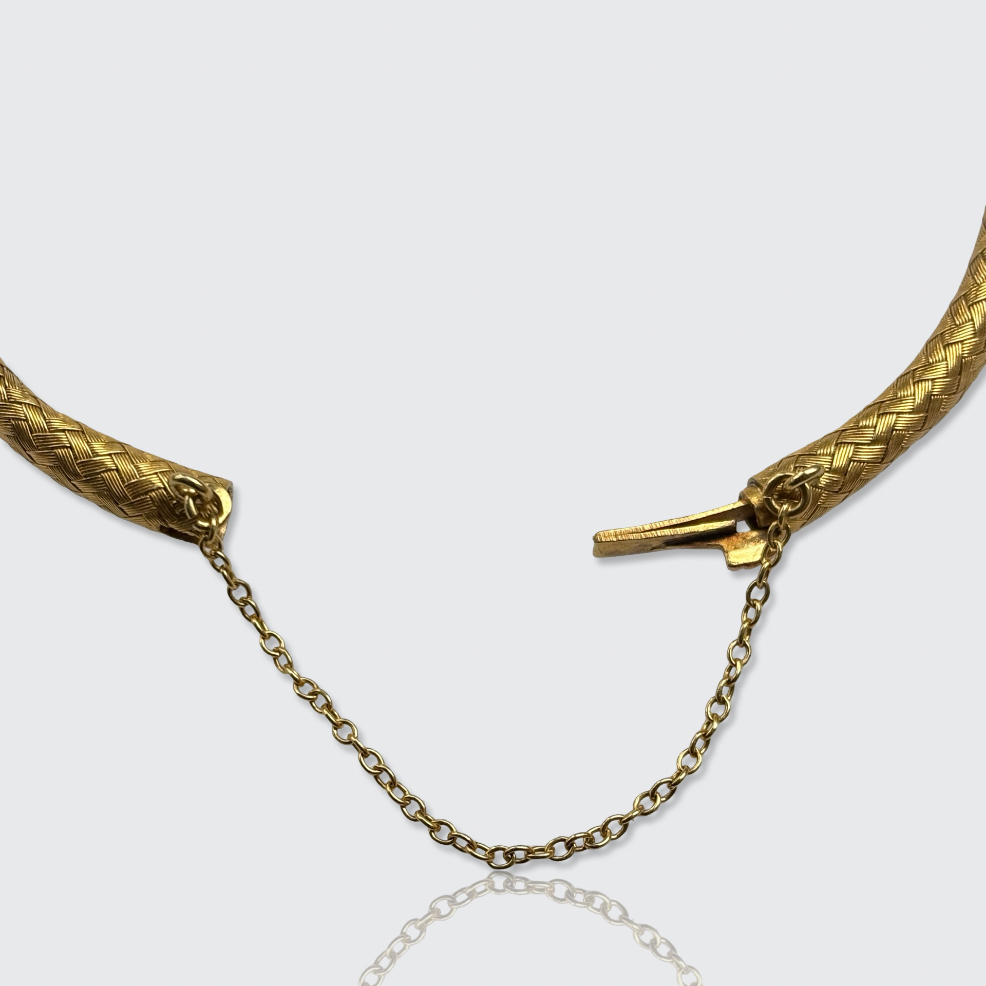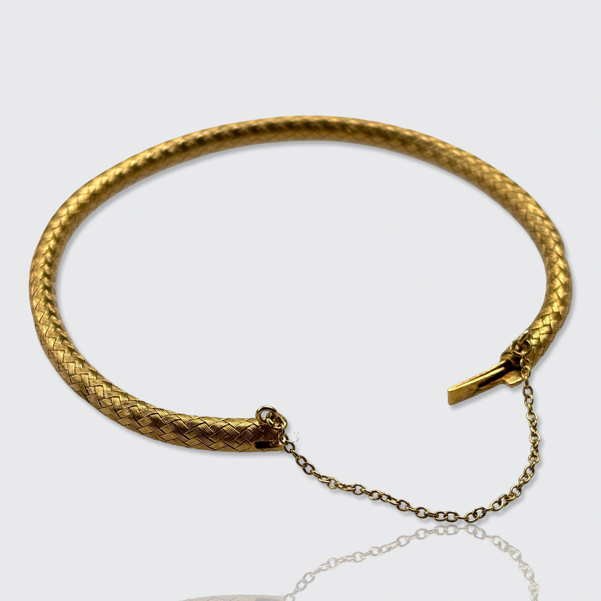 This stunningly well-made 18k gold bracelet is crafted from braided gold wires that form a hollow, flexible tube, making it very comfortable to wear. It is fitted with a safety chain, to prevent it from slipping off unnoticed.