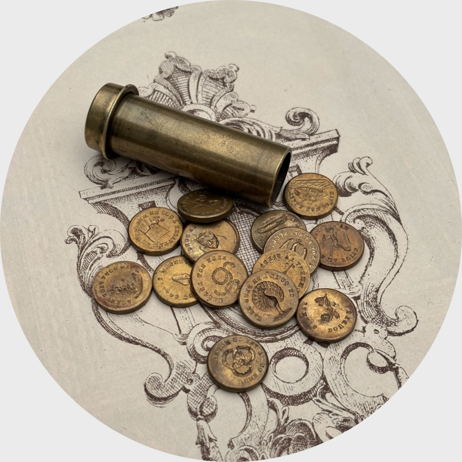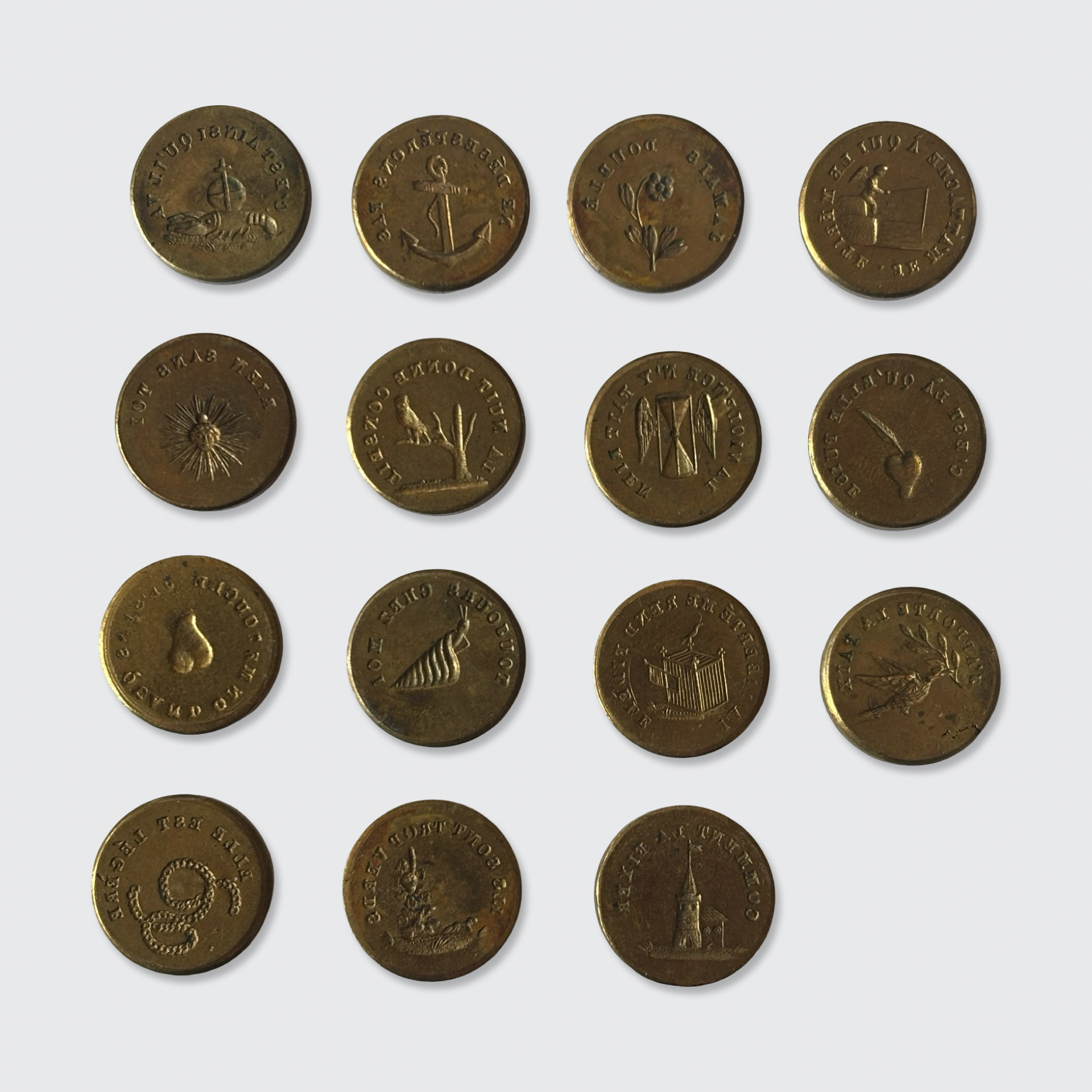 Inside are fifteen brass double-sided seals, giving thirty French mottoes to use. These are: