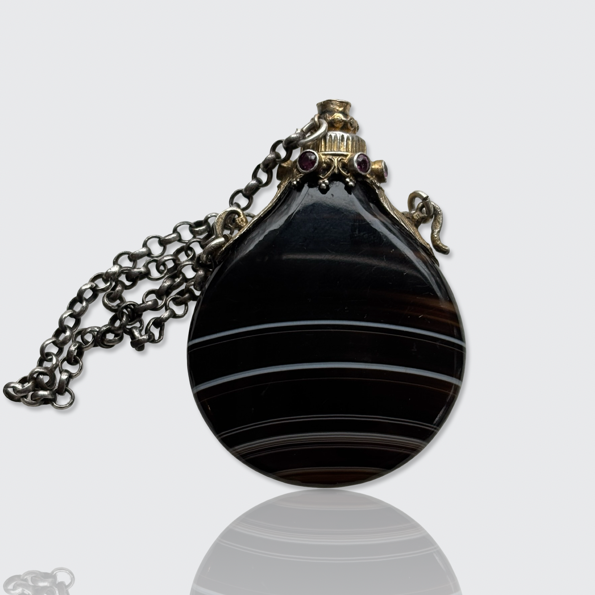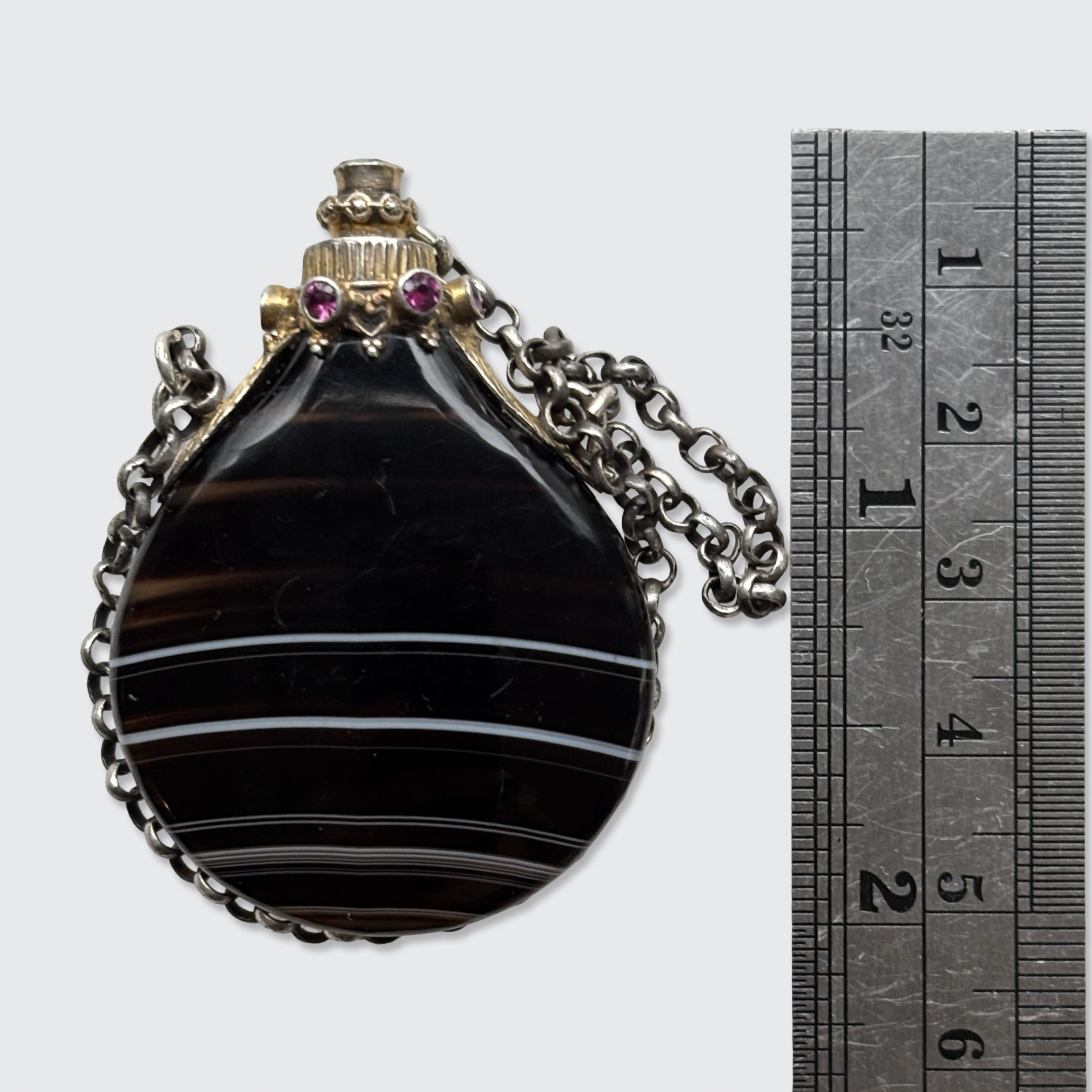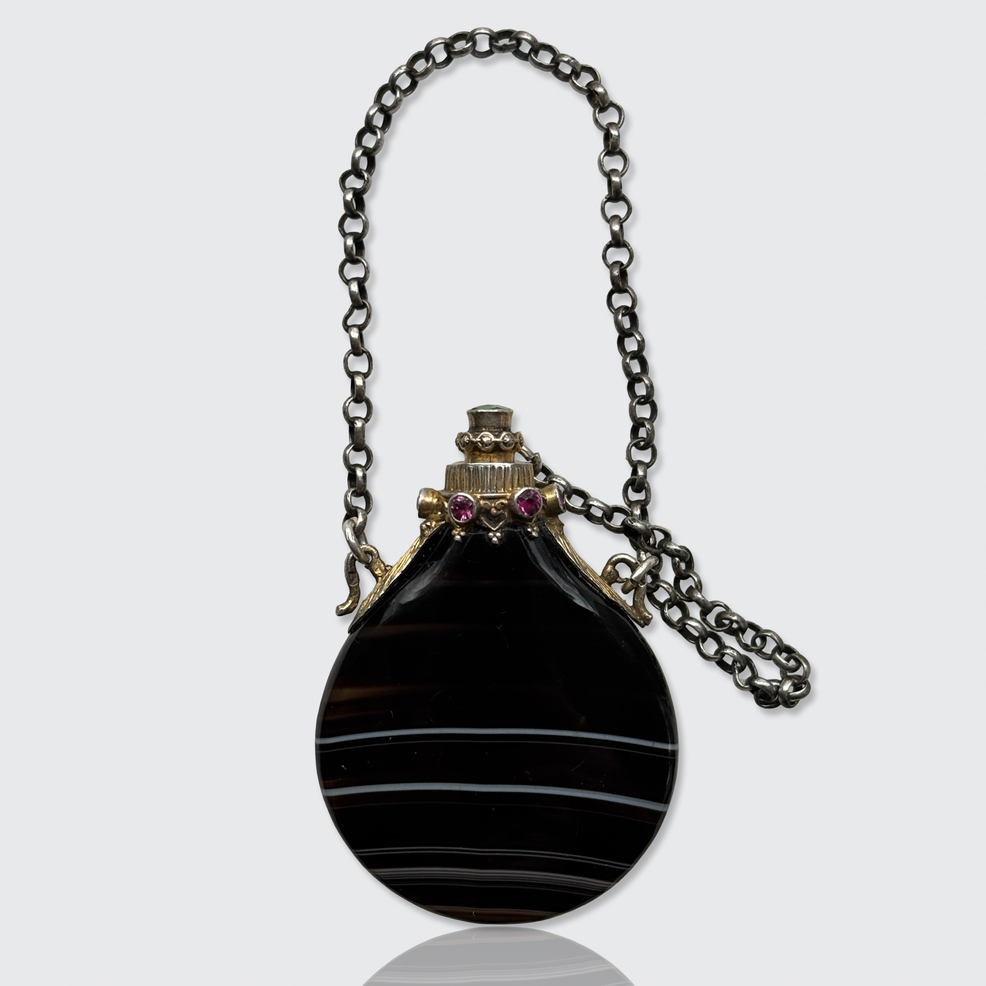 This round perfume flask is carved from a single piece of banded agate. Its silver mounting is set with six round-cut rubies, and the stopper is set with an emerald. The stopper is hung from a safety chain, and the bottle itself is also suspended from a chain. Originally it would have been worn on a chatelaine, a girlde hook that contained several practical items for everyday use.
