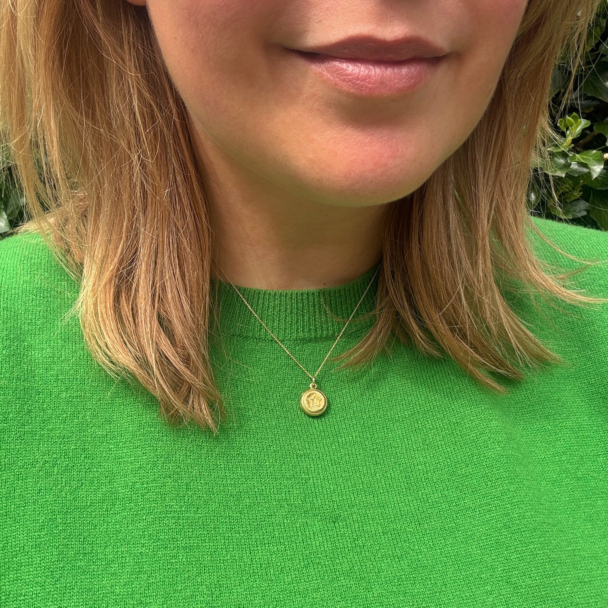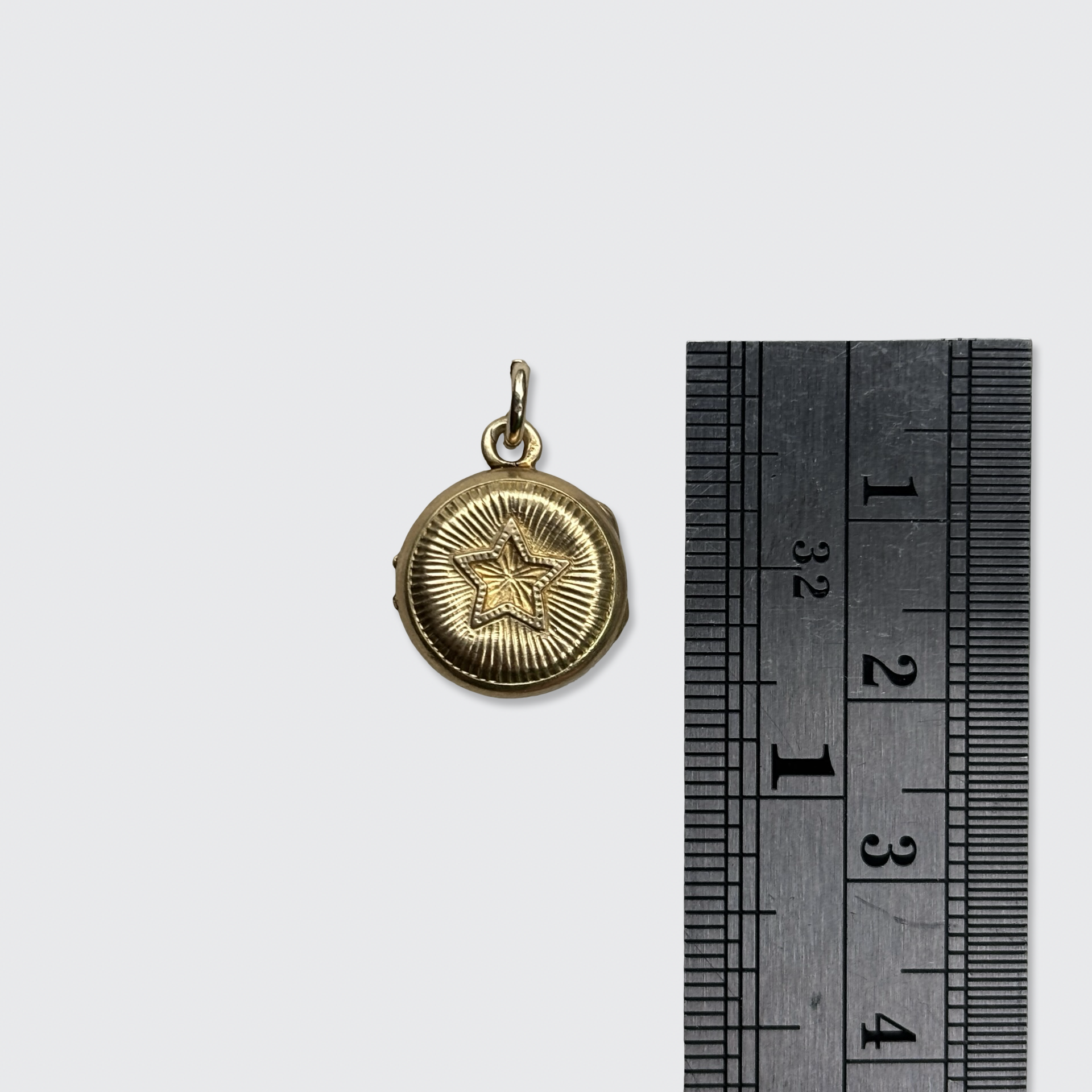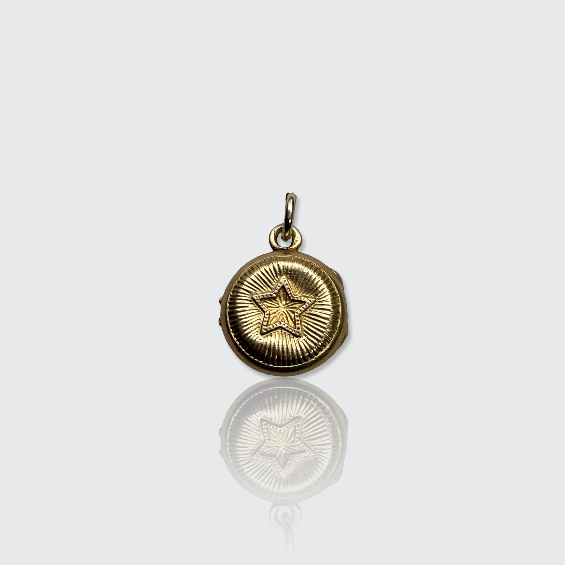 This adorable 18k gold round locket depicts a star on one side and an anchor, the symbol of hope, on the other. The inside contains a glass panel to store a picture or personal memento.