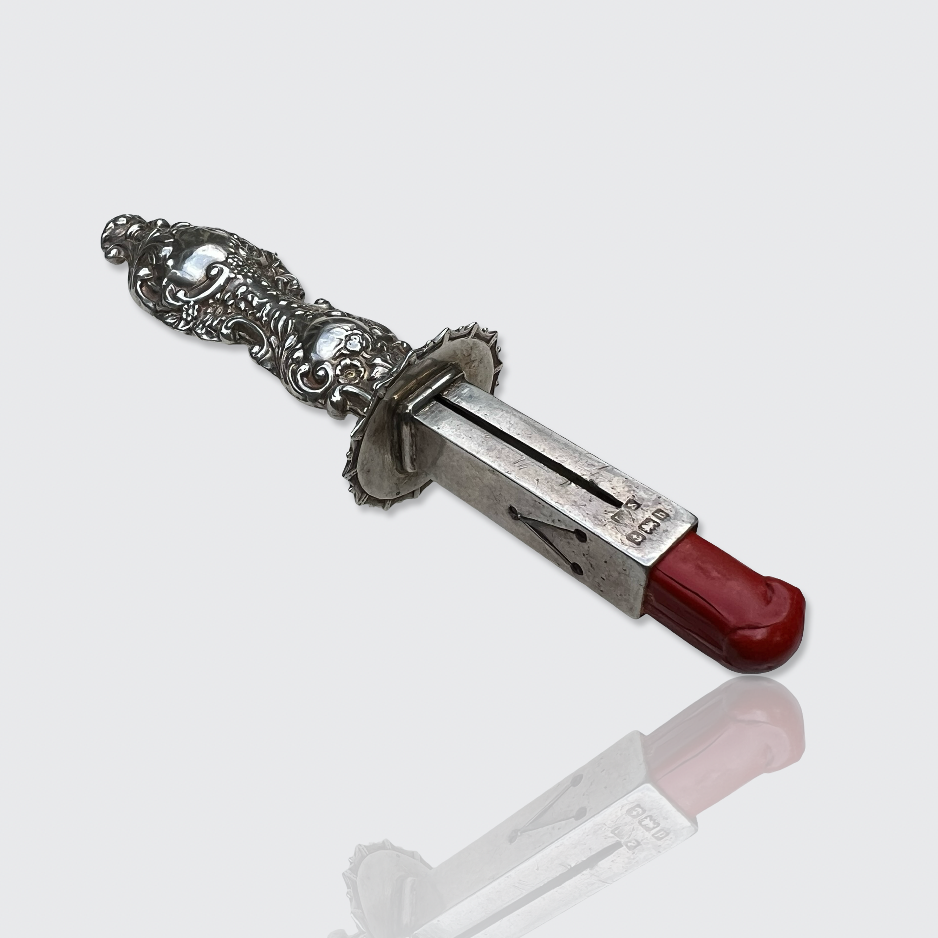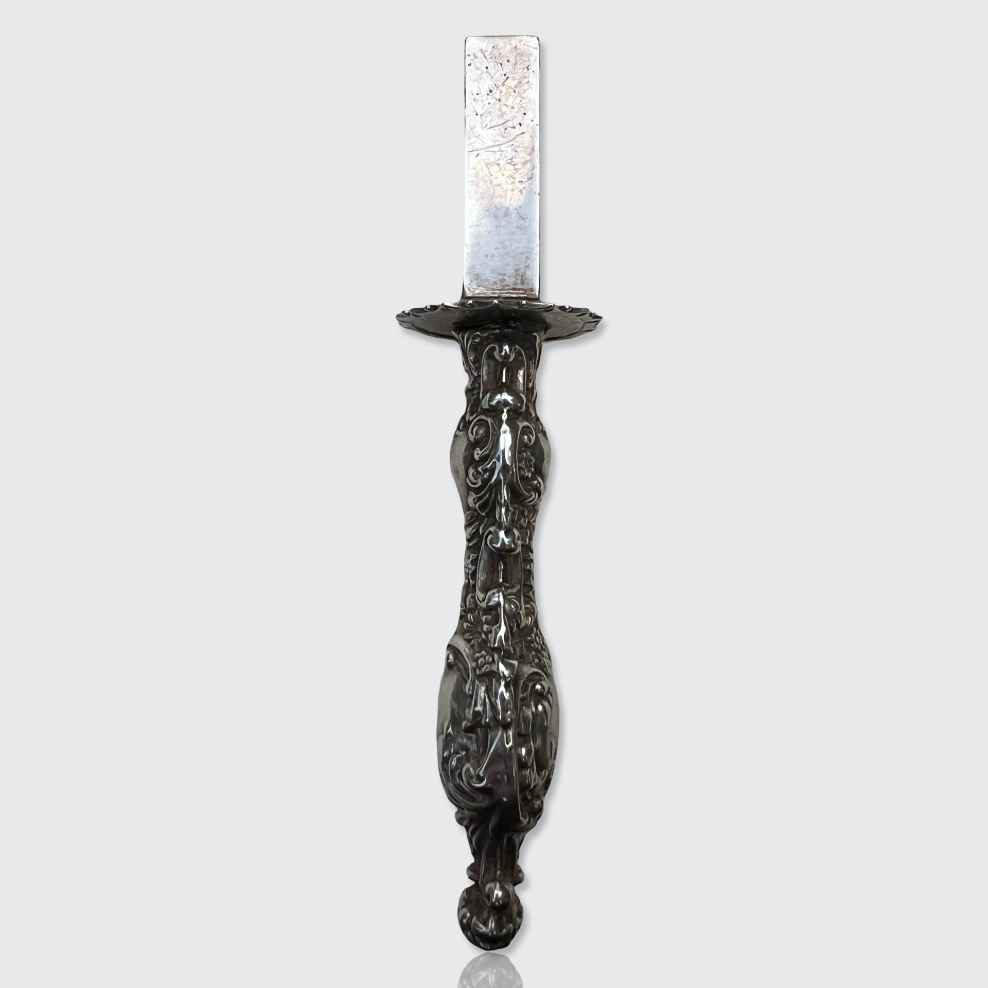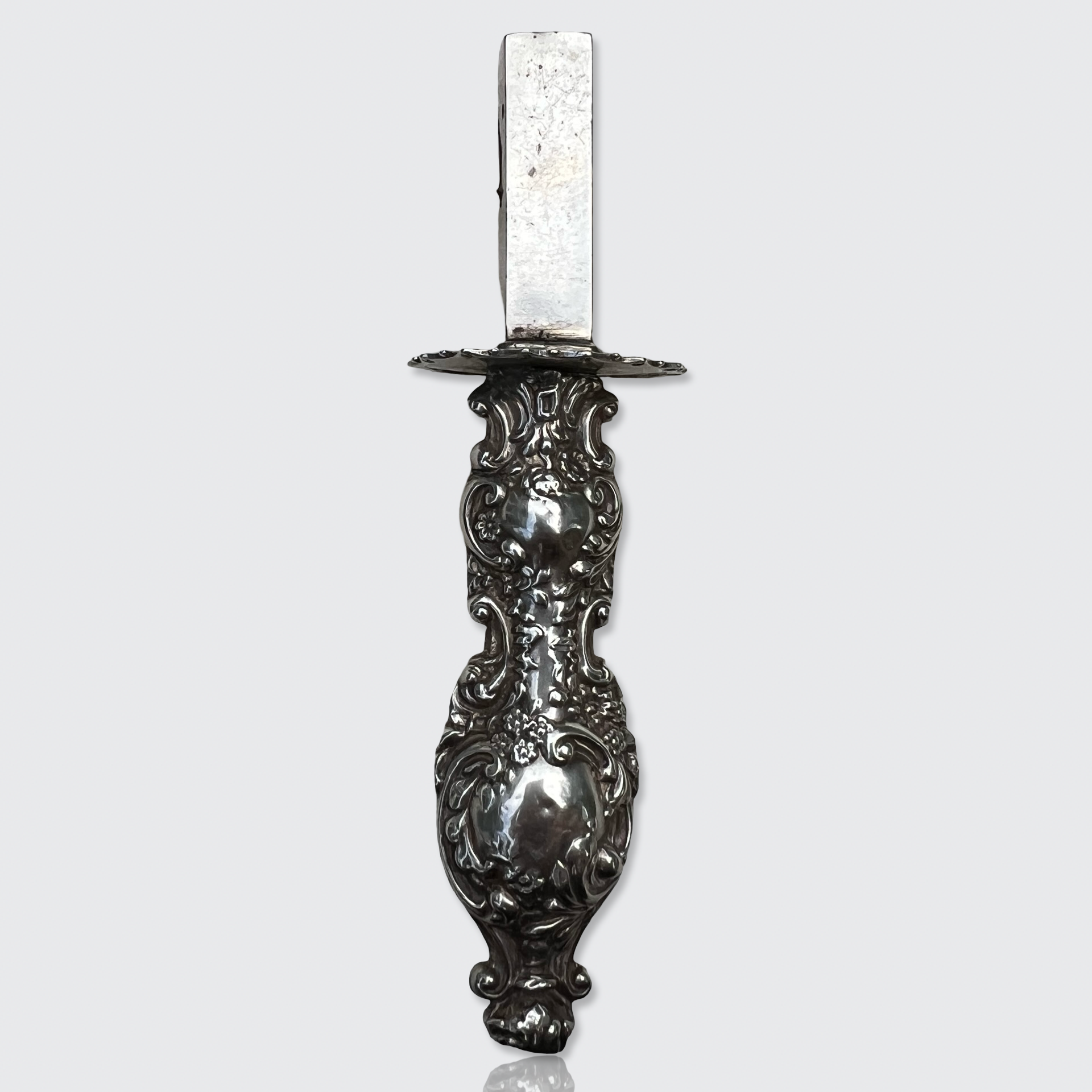 This sterling silver waxing seal holder is the perfect accessory for everyone who still enjoys sending handwritten letters! It is a nice, hefty accessory, with the grip decorated with an intricate scroll pattern.