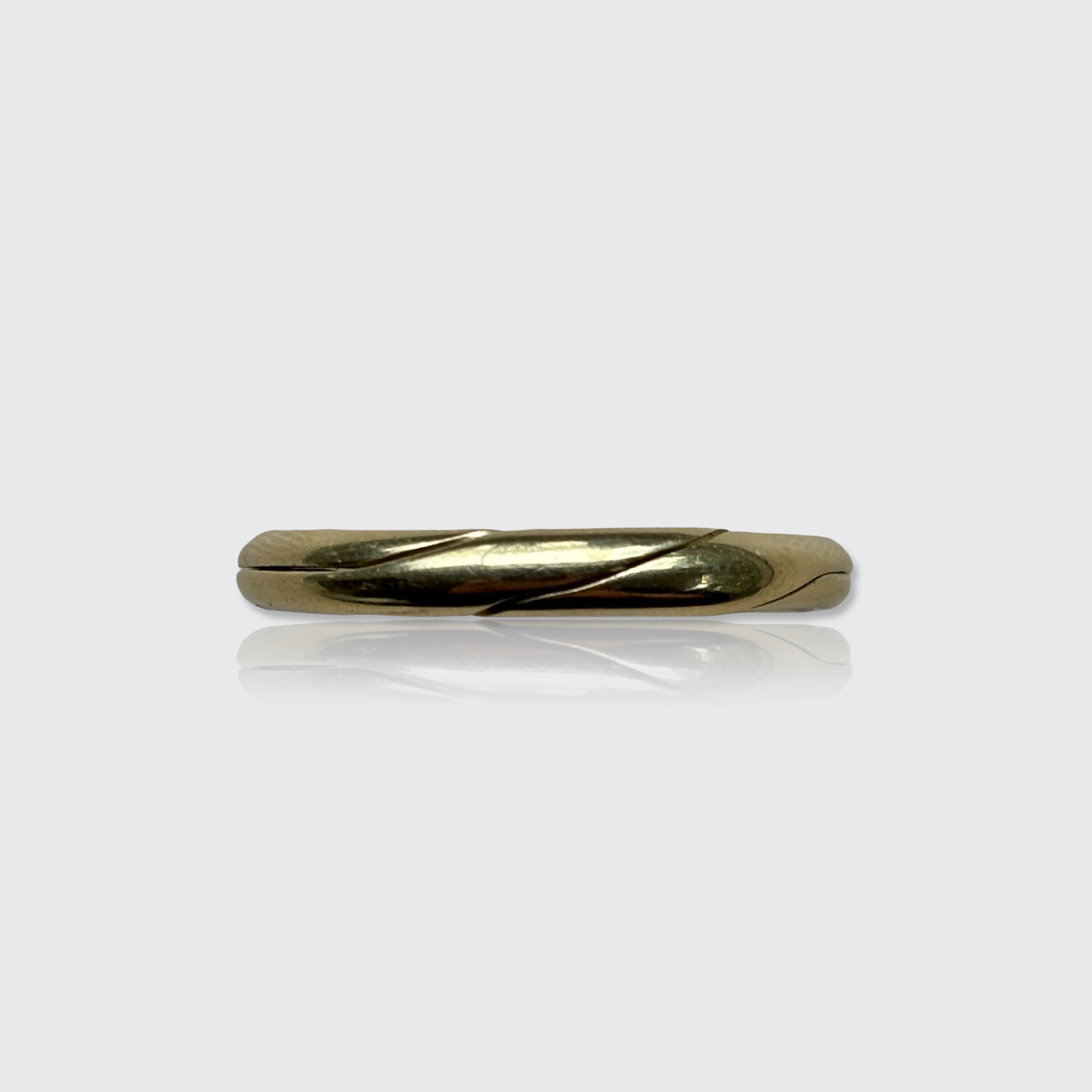 This yellow gold gimmel ring is made up of two separate bands, which have been designed to intertwine so that they can be worn united as a single ring. The name Gimmel originates from the Latin 'gemellus' meaning twin, and these rings were likely invented in the 15th Century and of French origin.