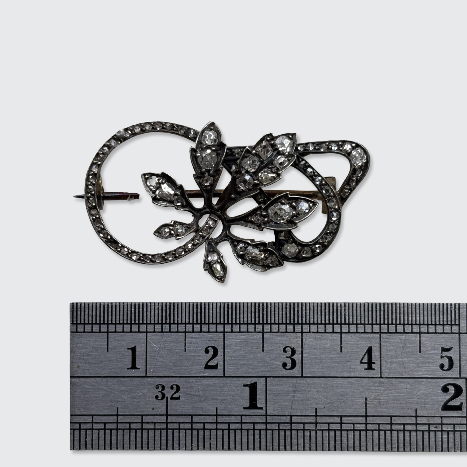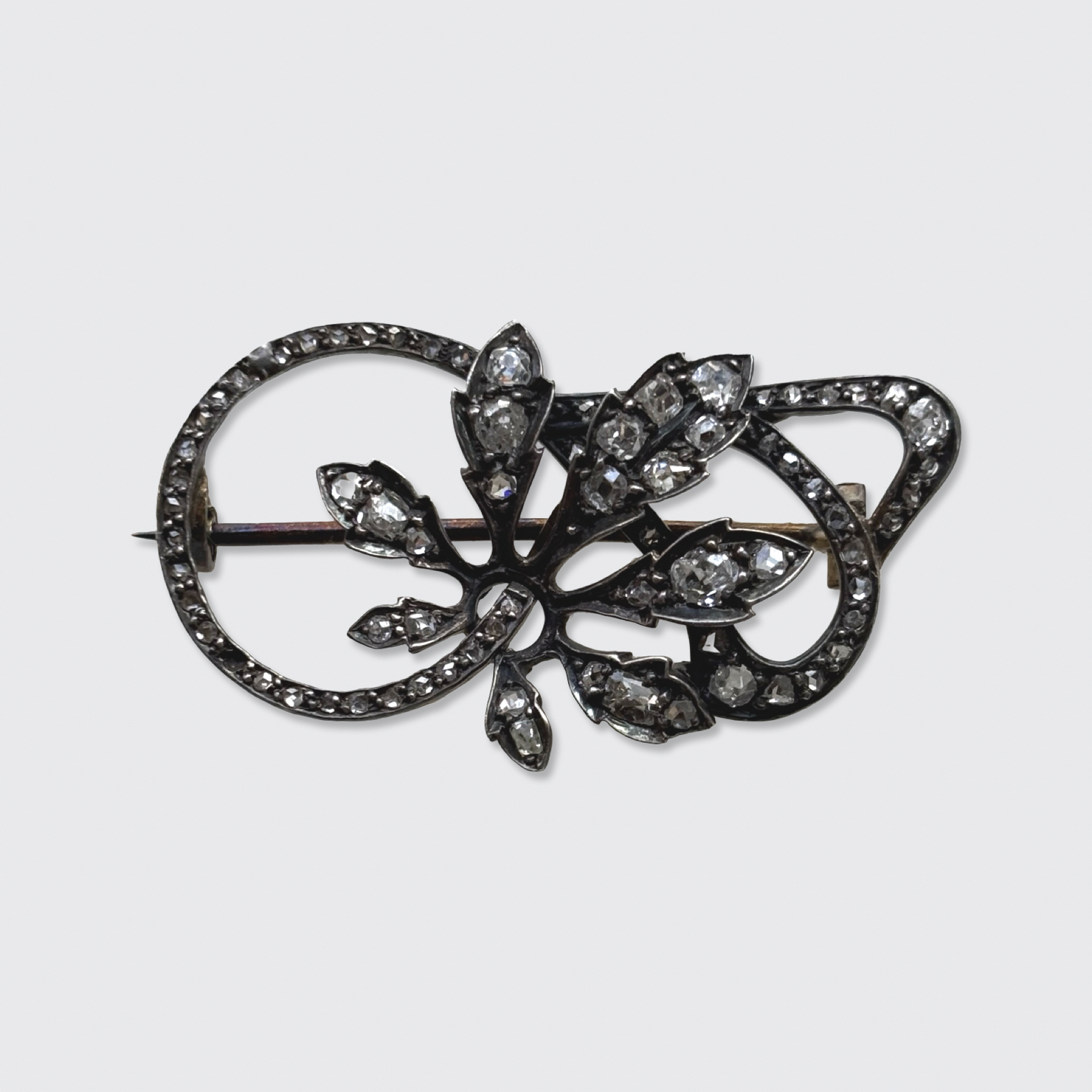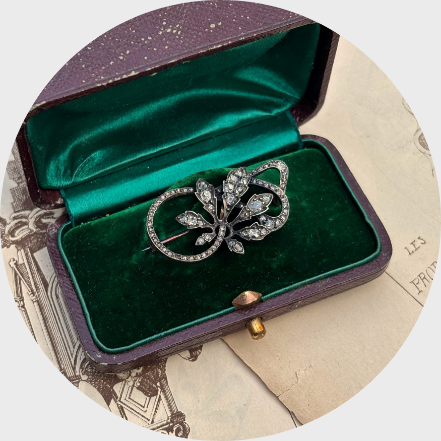 This pretty brooch from the late 1800s is shaped like a branch, which is studded with rose-cut diamonds in open settings, allowing light to pass through the stones.