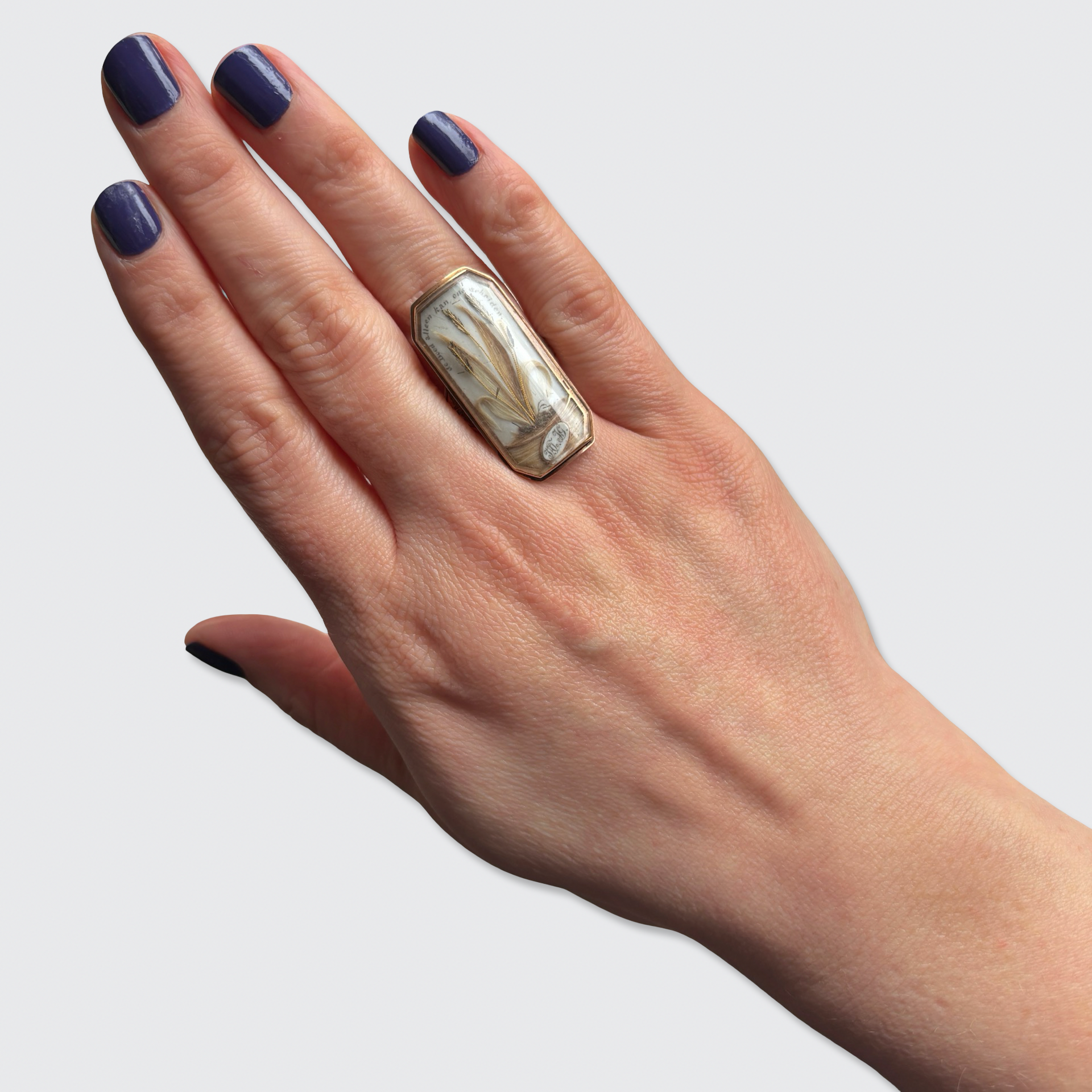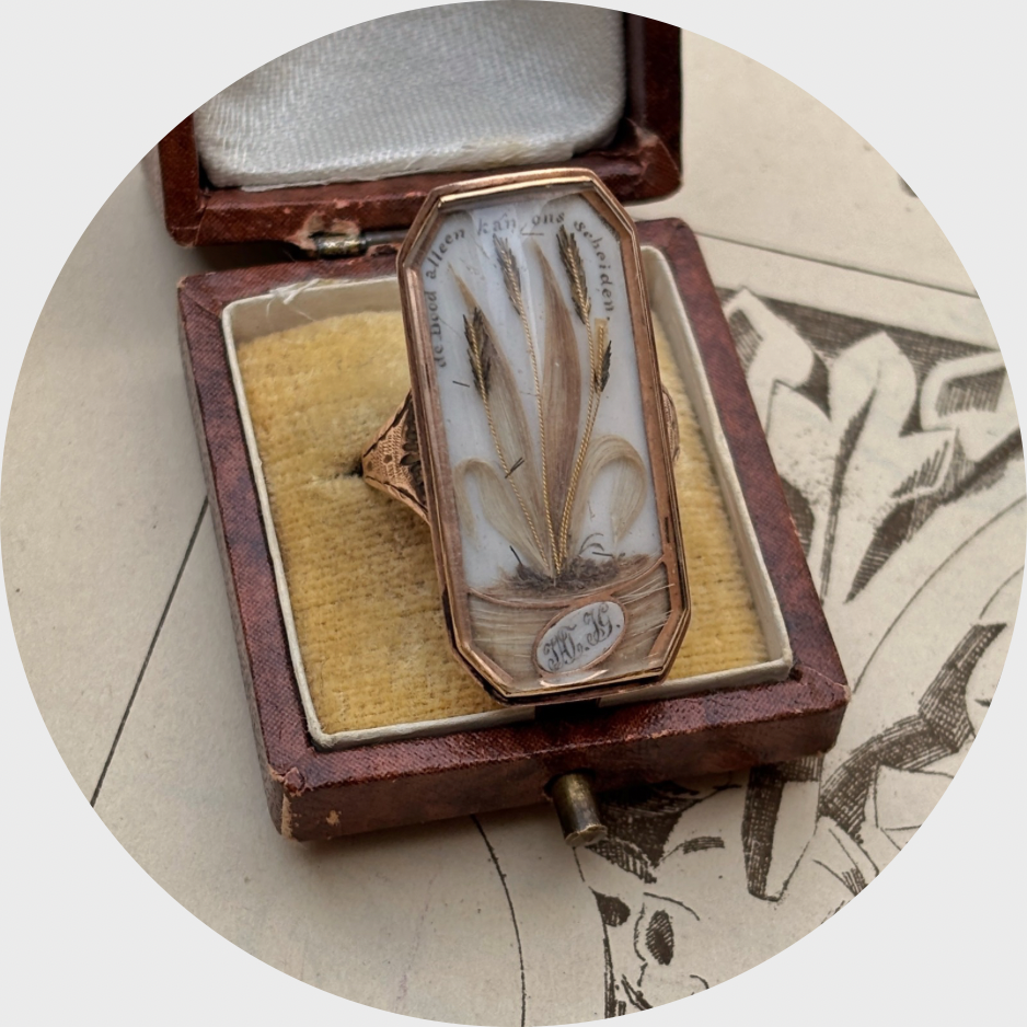 This stunning and rare memorial ring depicts three sheaves of wheat, created from human hair, under a domed glass panel. Above this depiction, one can read the Dutch sentence: 'De dood alleen kan ons scheiden' which translates to: 'Only death can do use part'. At the bottom, we can read two monograms, JHJ and JG.