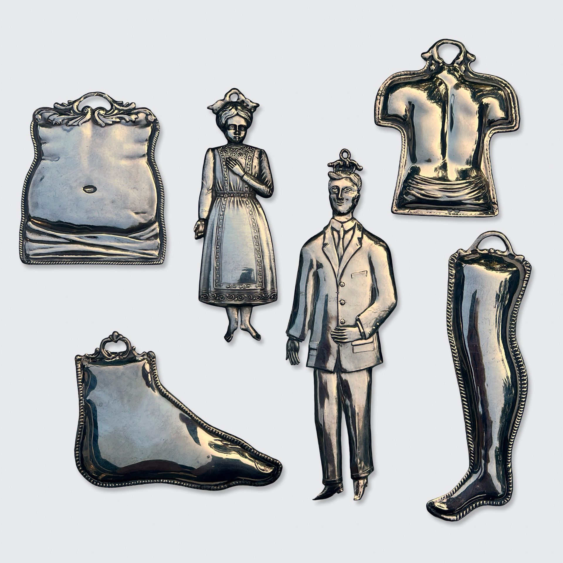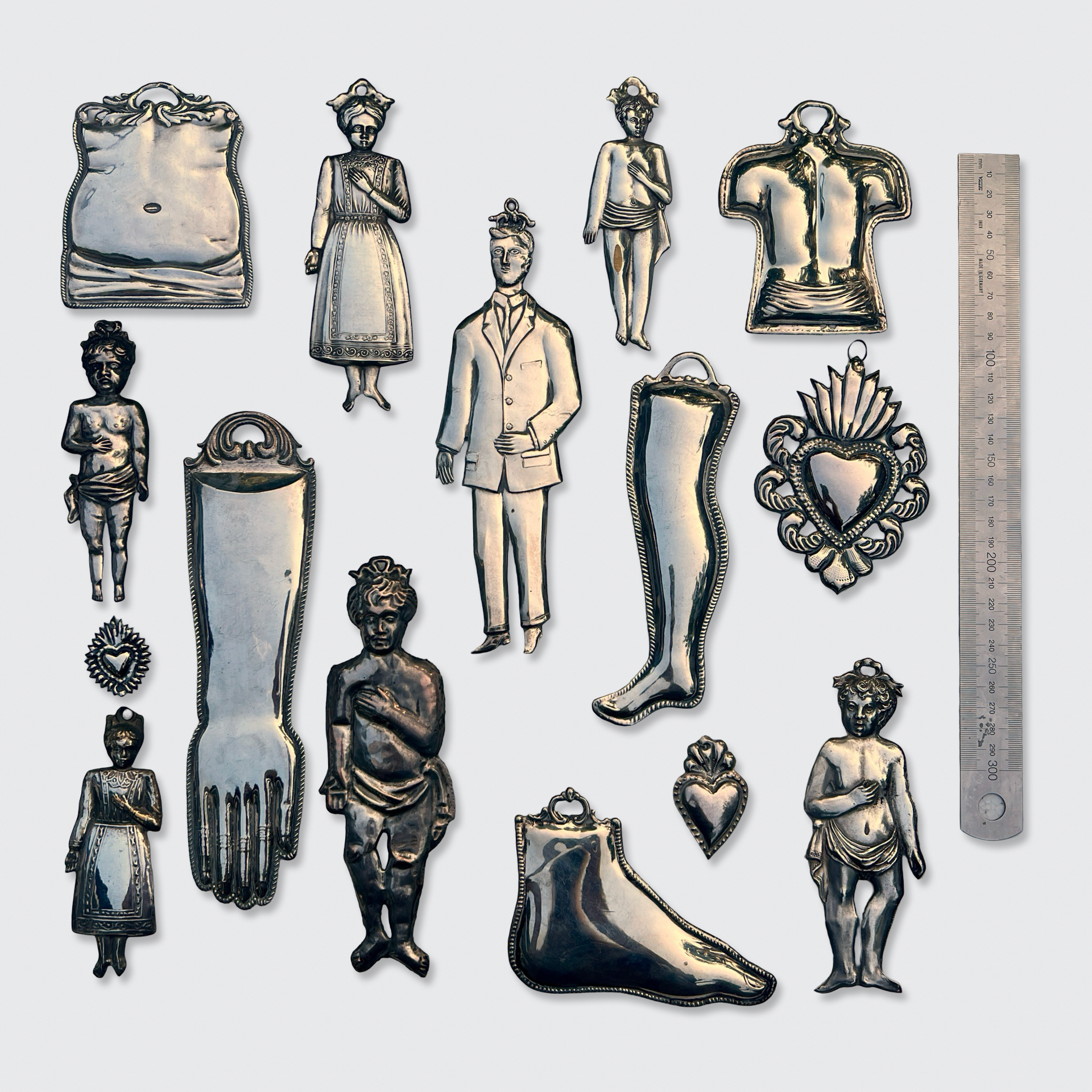 This collection of fifteen silver and silver-plated ex-votos, also known as milagros, originates from southern Italy, particularly around Naples. Traditionally, these small devotional offerings were left in churches as expressions of gratitude for healing or answered prayers.