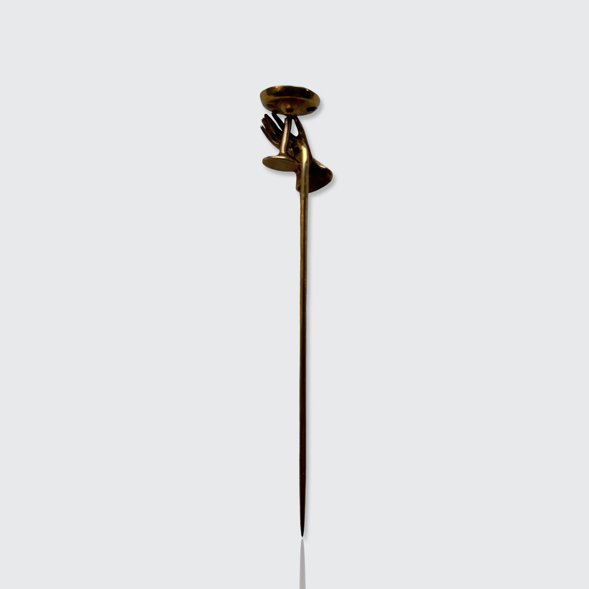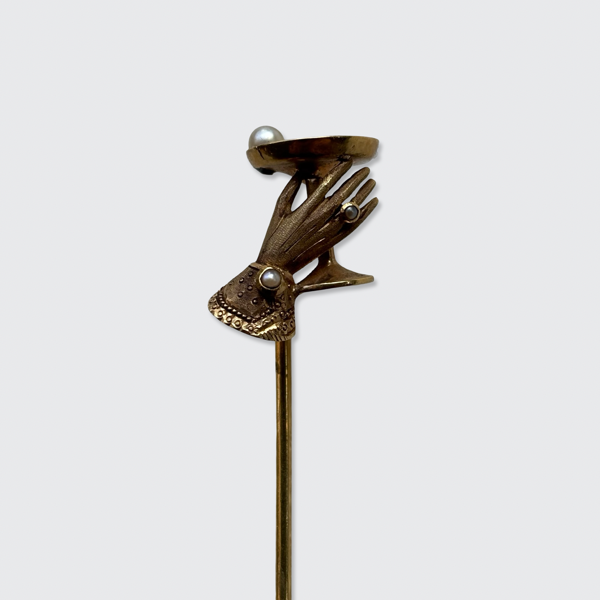 This 18k yellow gold stickpin was originally worn in a man's cravat, the predecessor of the necktie. It is shaped like a hand holding a cocktail glass, with three seed pearls set in its cuff, ring, and as a playful bubble in the glass.