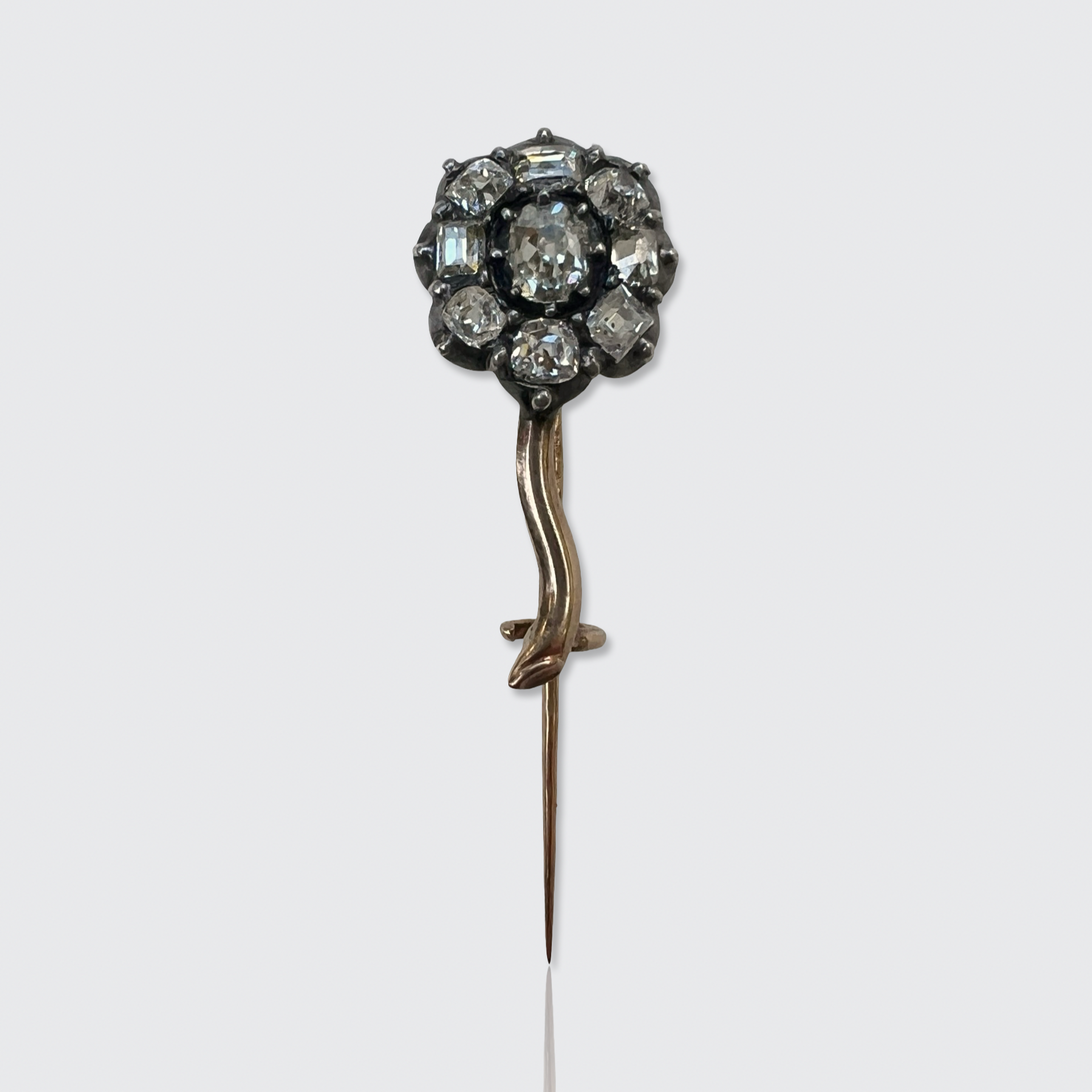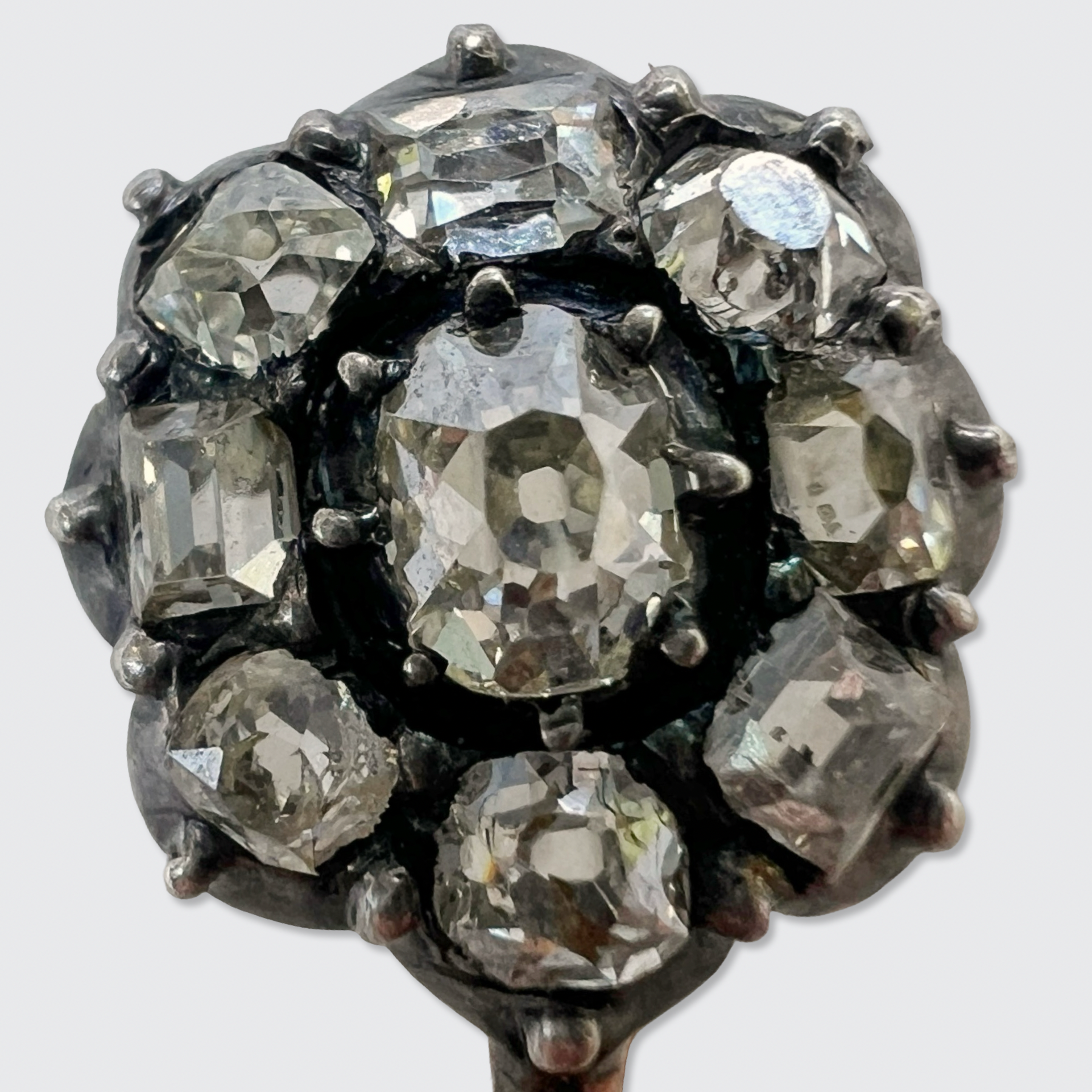 The flower is set with a mix of nine antique table-cut and cushion-cut diamonds, with a combined estimated weight of 0.75 ct. They have a nice and bright colour (H-I colour) and some of the diamonds have small inclusions (SI to pique quality). All diamonds are set in open settings, allowing light to pass through the stones.