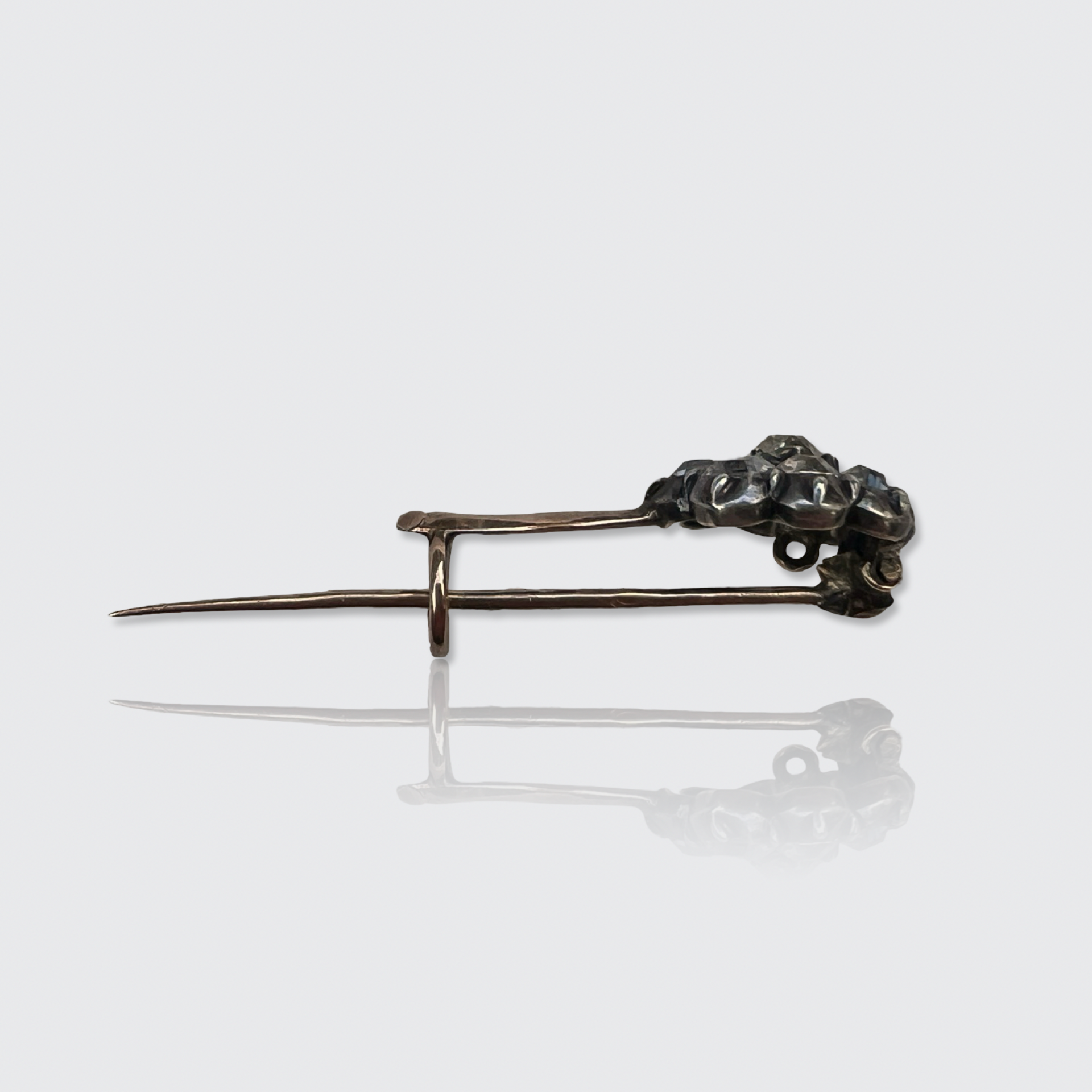 The brooch is fitted with a c-clasp and a pin that is longer than the brooch itself. This is very typical for brooches of this period and was done so that the end of the pin can be stuck inside the fabric, preventing it from falling off.