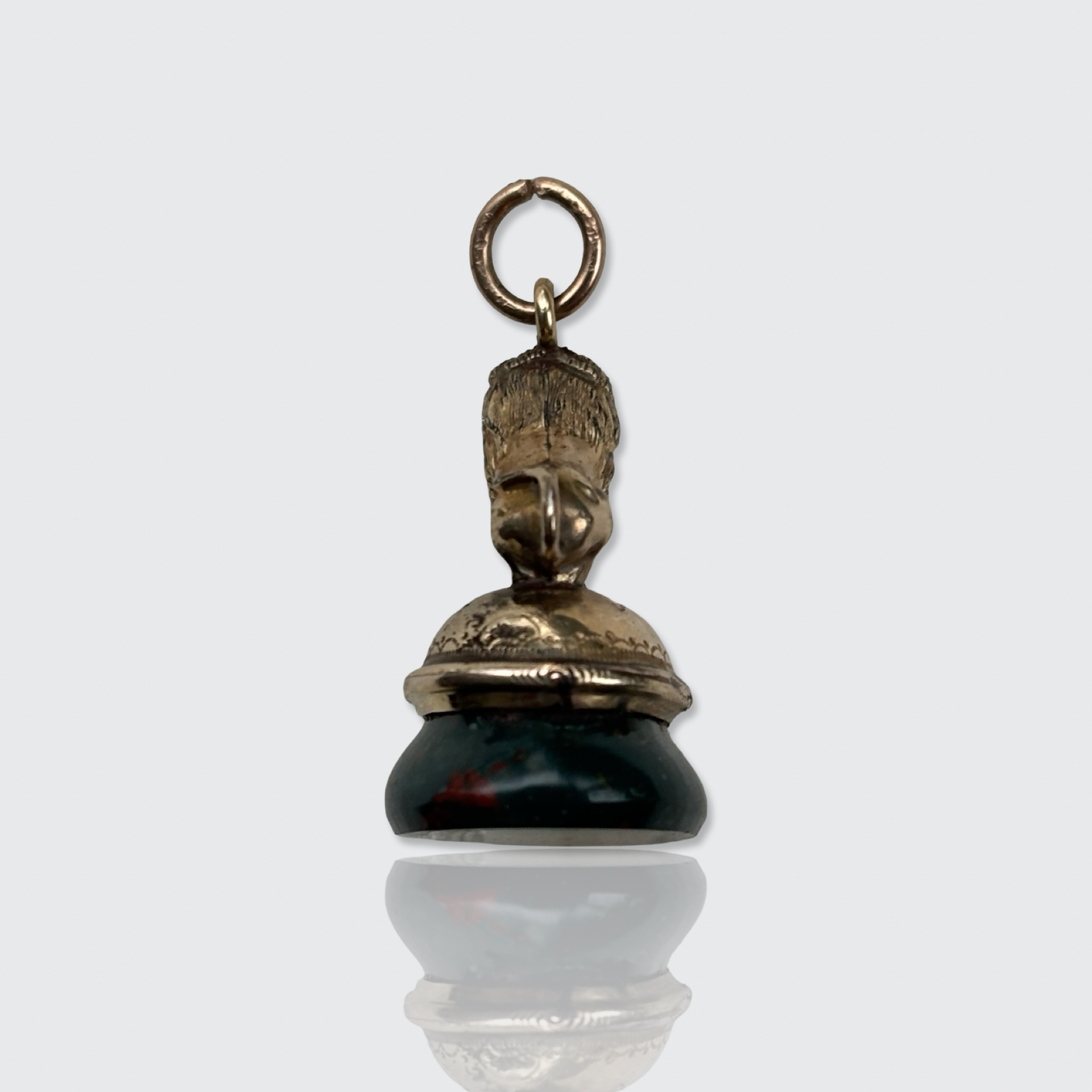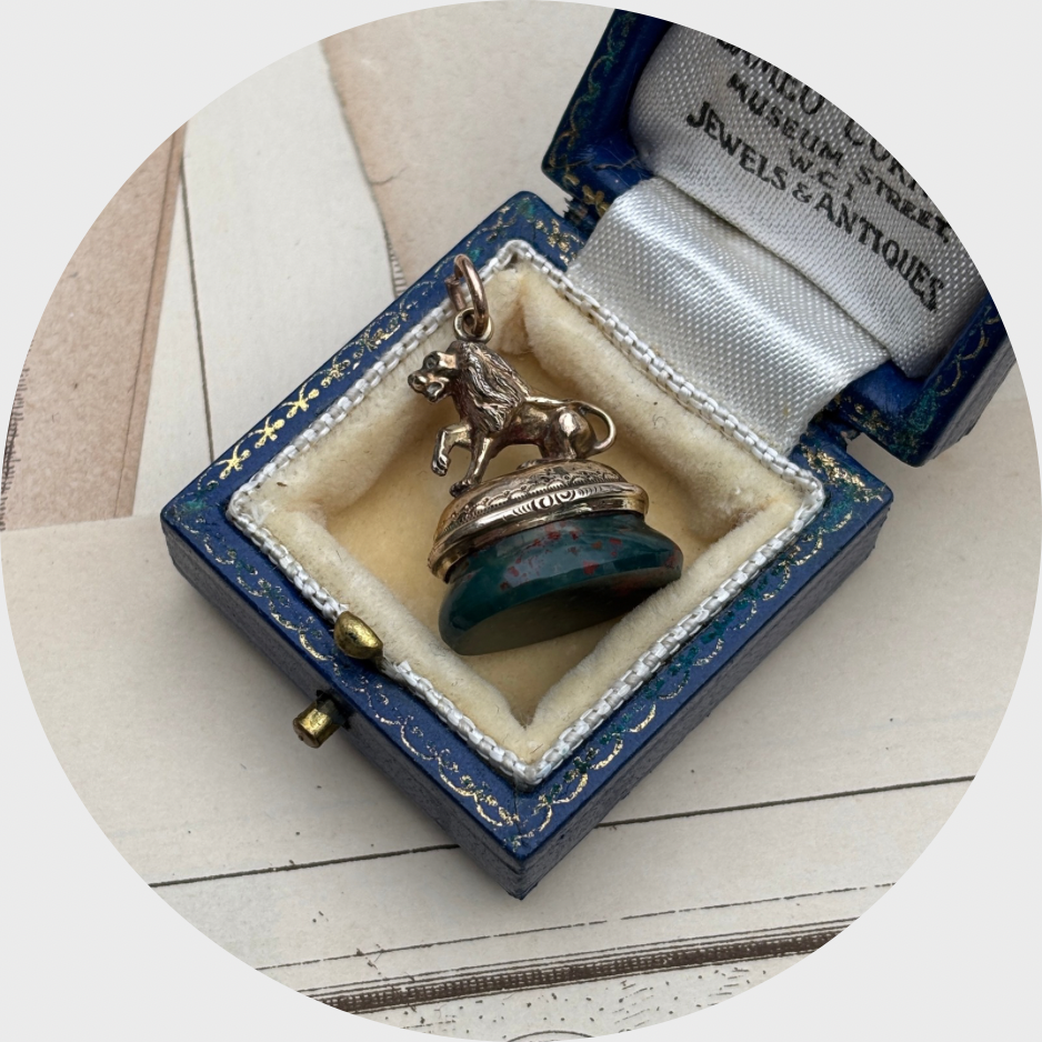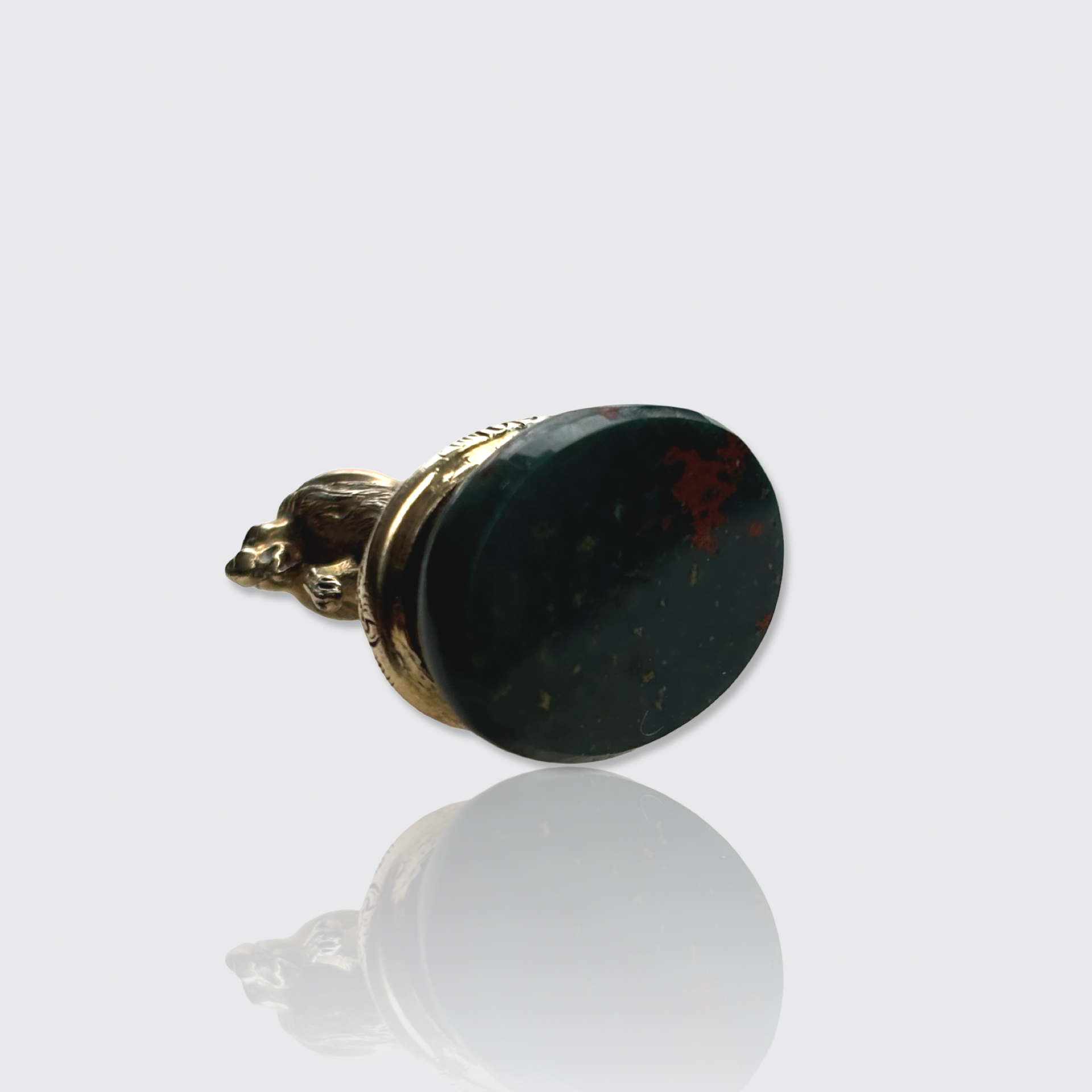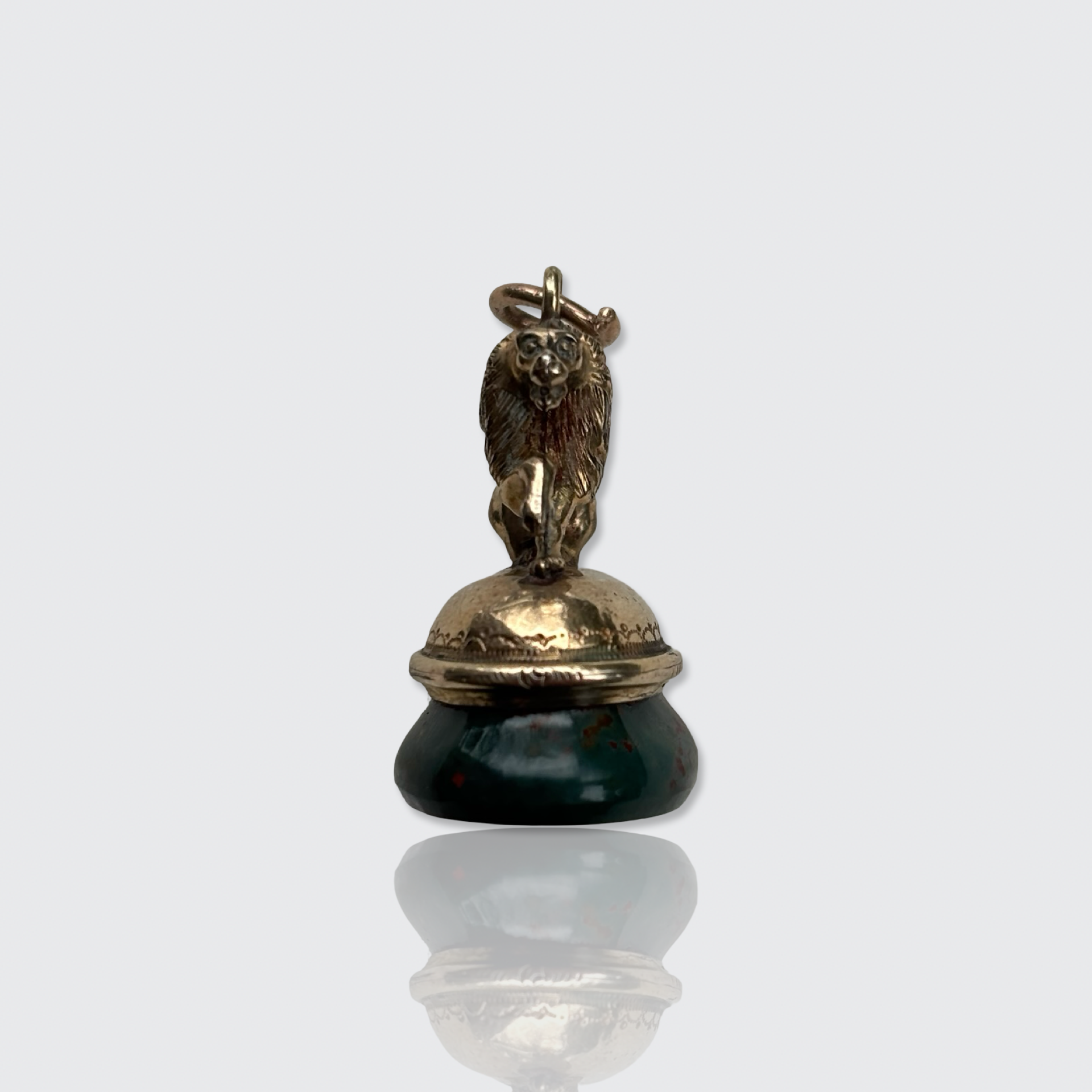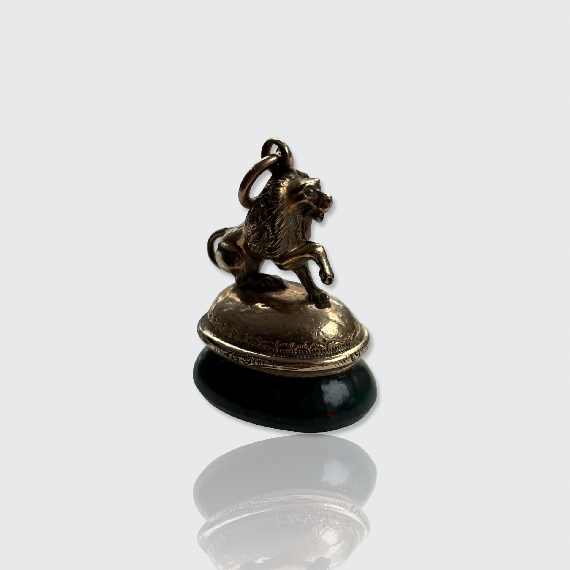 This Victorian watch fob is decorated with a little standing gold lion, on an unengraved bloodstone seal.