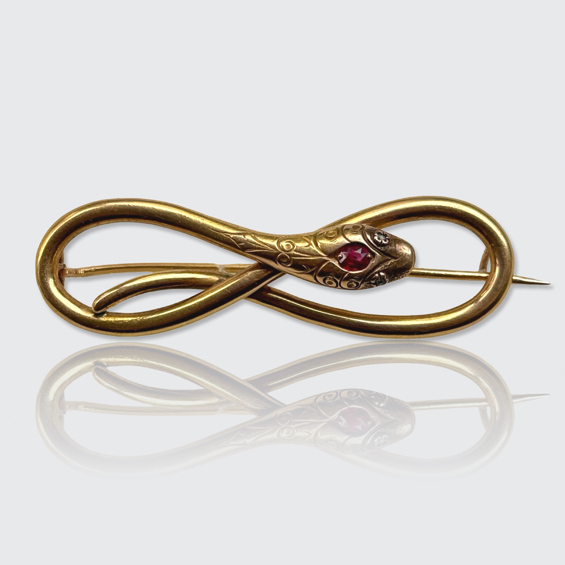 This 18k yellow gold snake brooch is set with an oval-cut, natural ruby in its head, and two tiny rose-cut diamonds in his eyes. His body is coiled in the shape of the infinity symbol or lemniscate, which is a reference to the historic symbolism of this sinister animal.