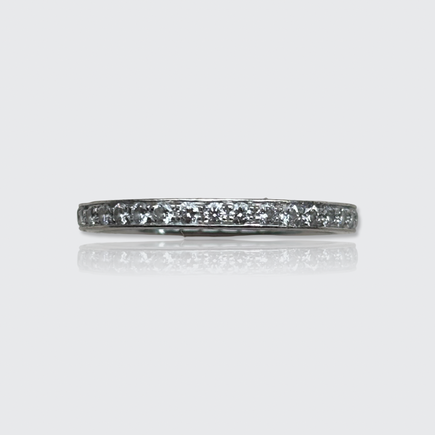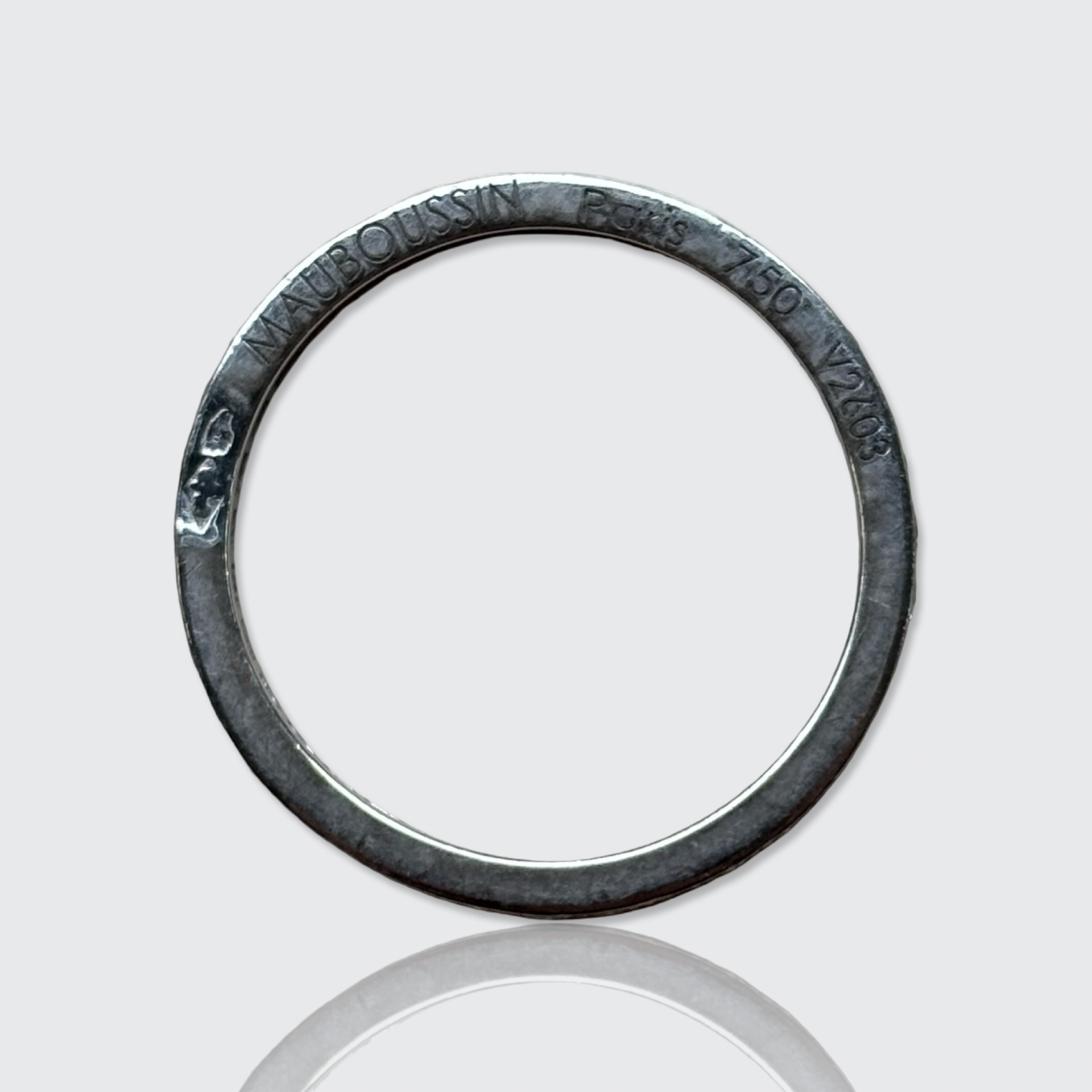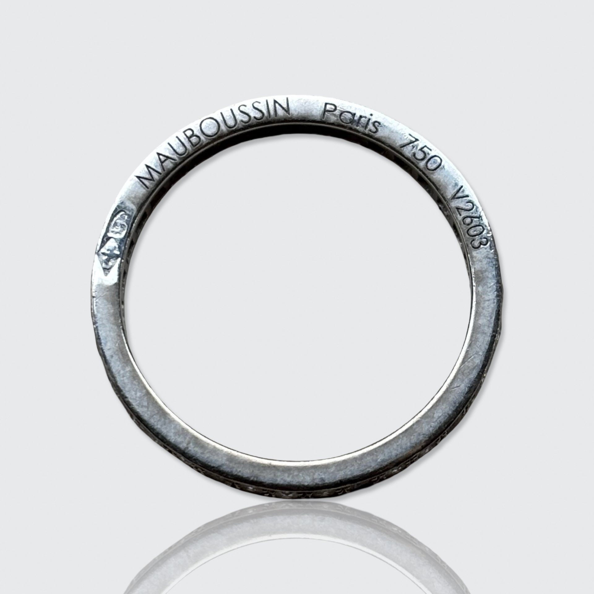 This elegant 18k white gold eternity ring by jeweler Mauboussin, known as the 'Lovisisime' design, is set with an uninterrupted row of brilliant cut diamonds.