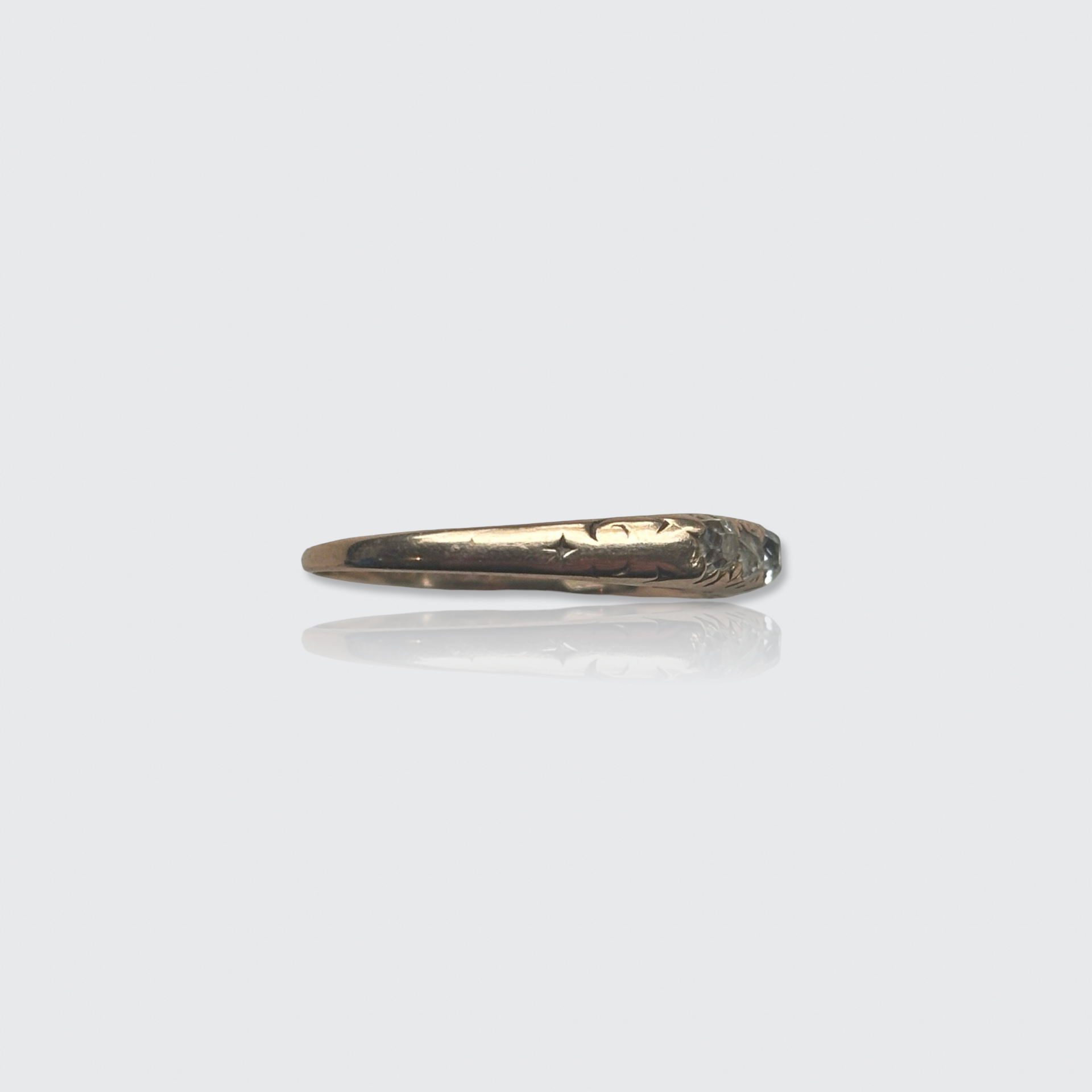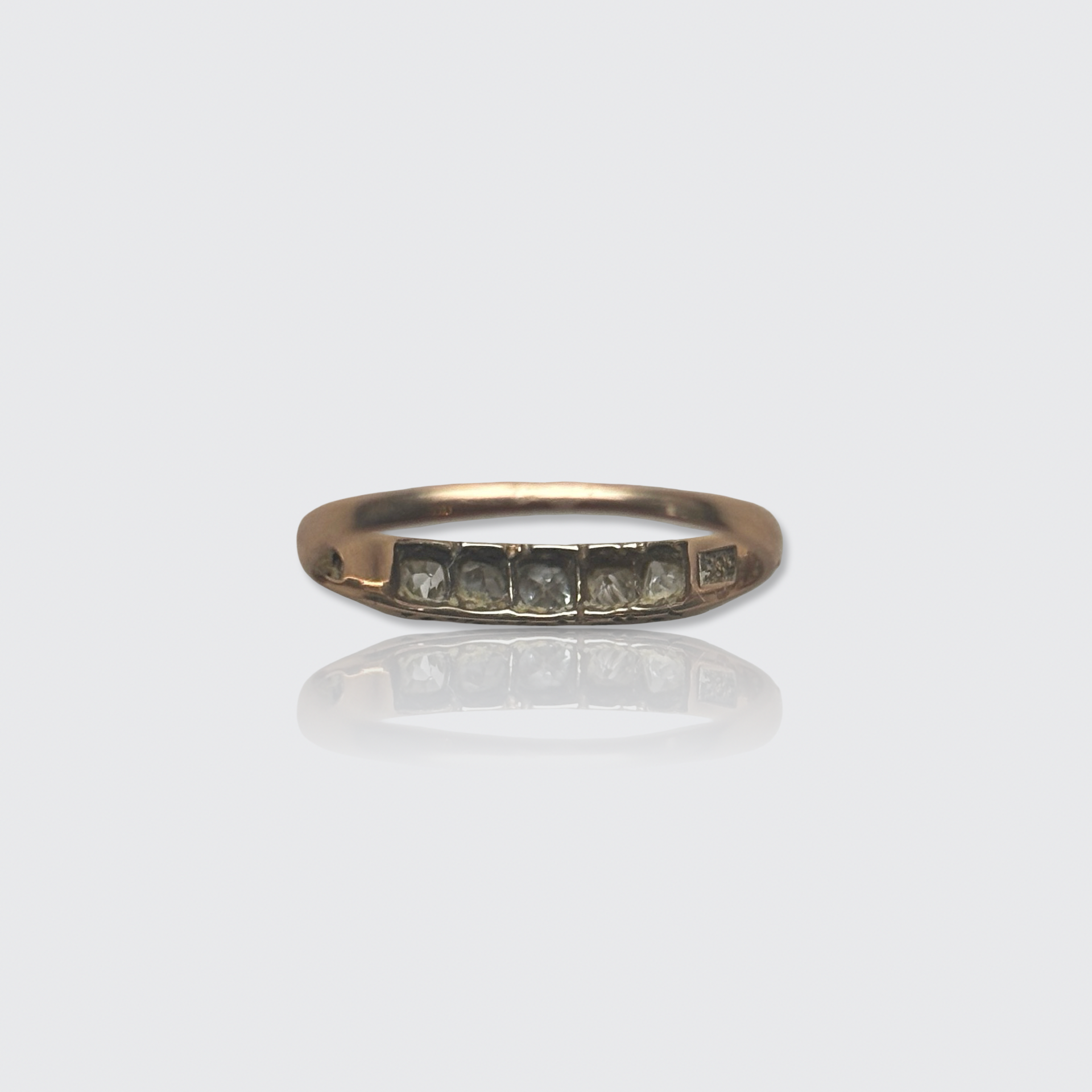 This dainty 14k gold ring is set with a row of five old mine-cut diamonds, with a combined estimated weight of 0.20 carats (circa 0.04 carats each).