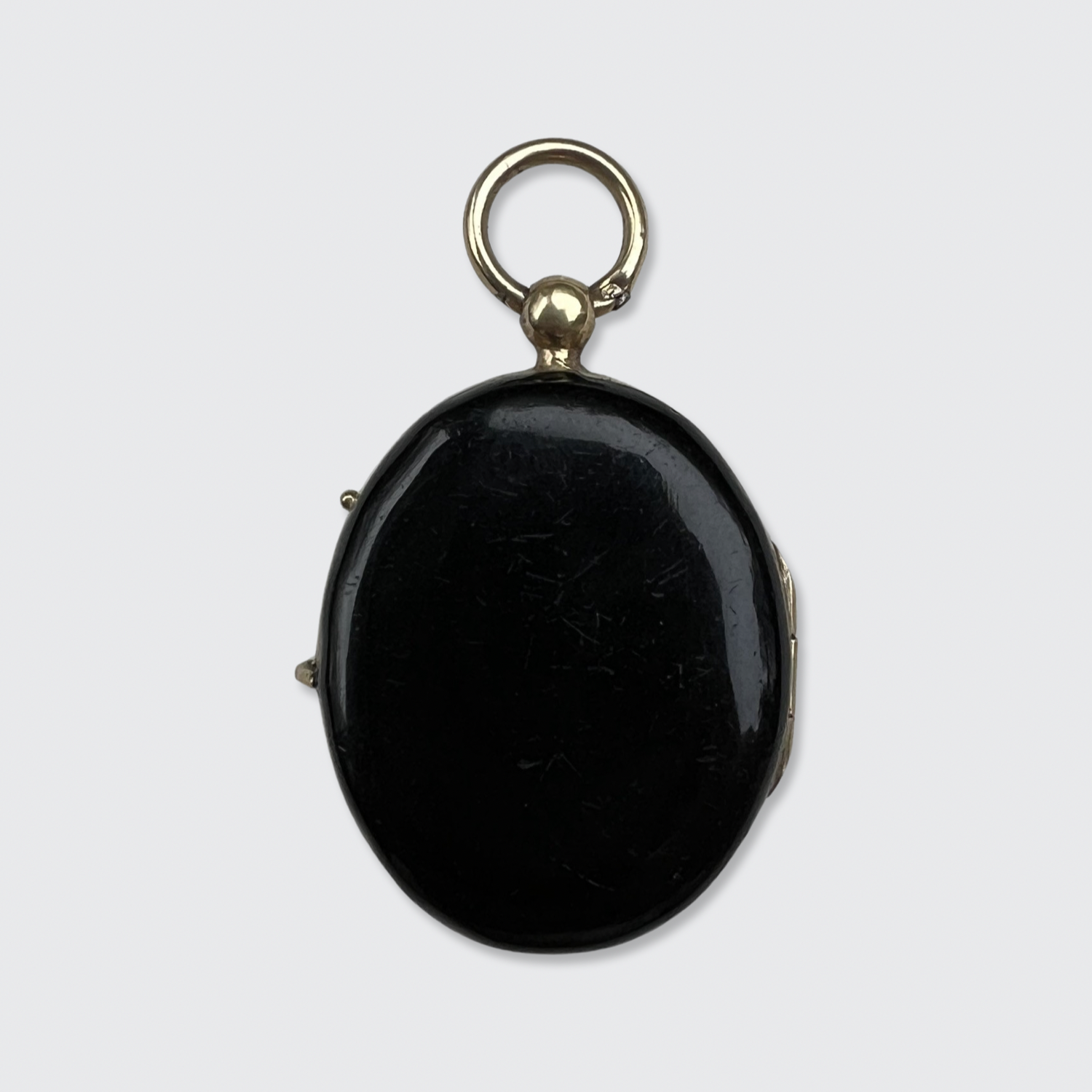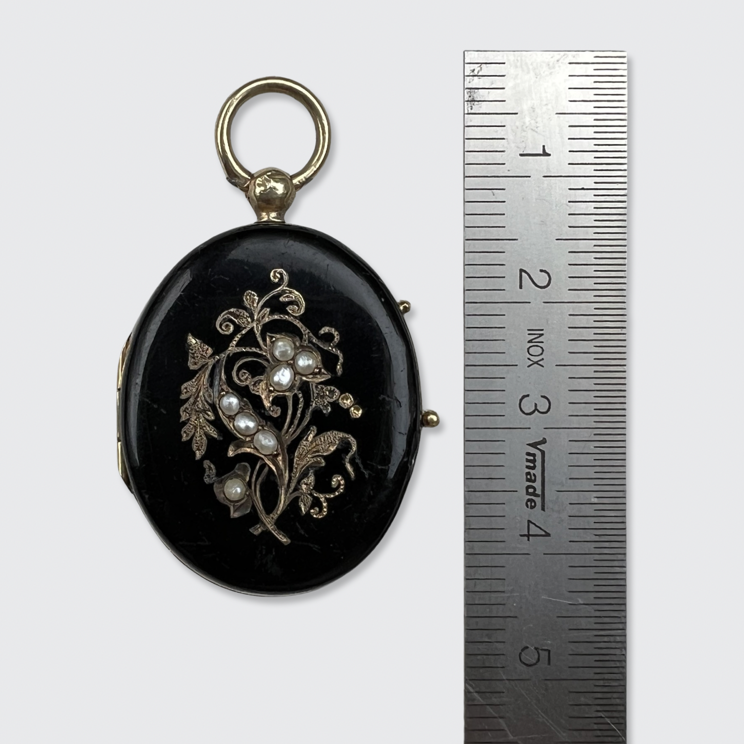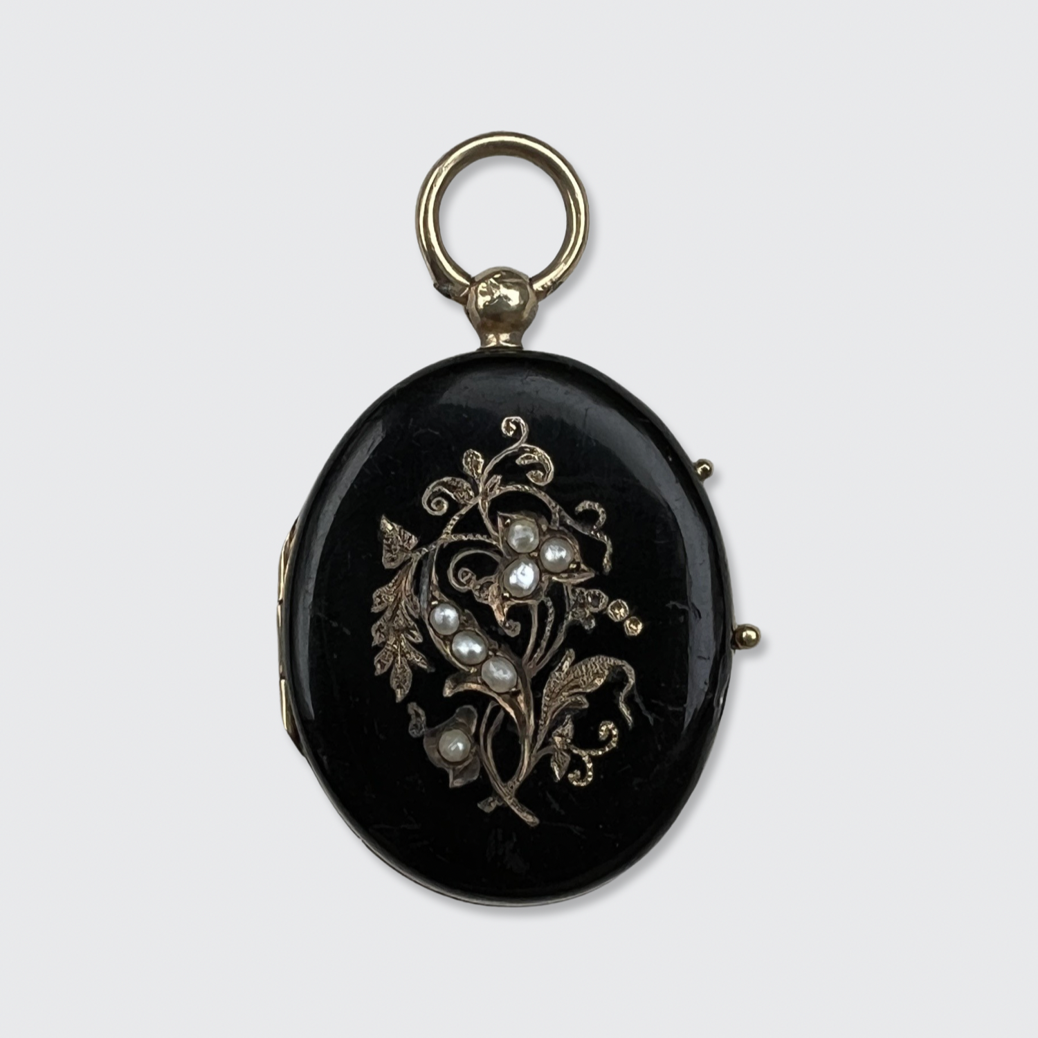 This 14k yellow gold locket is decorated with black enamel, and was likely worn as a mourning jewel. The front is decorated with an engraved floral branch, studded with natural seed pearls.
