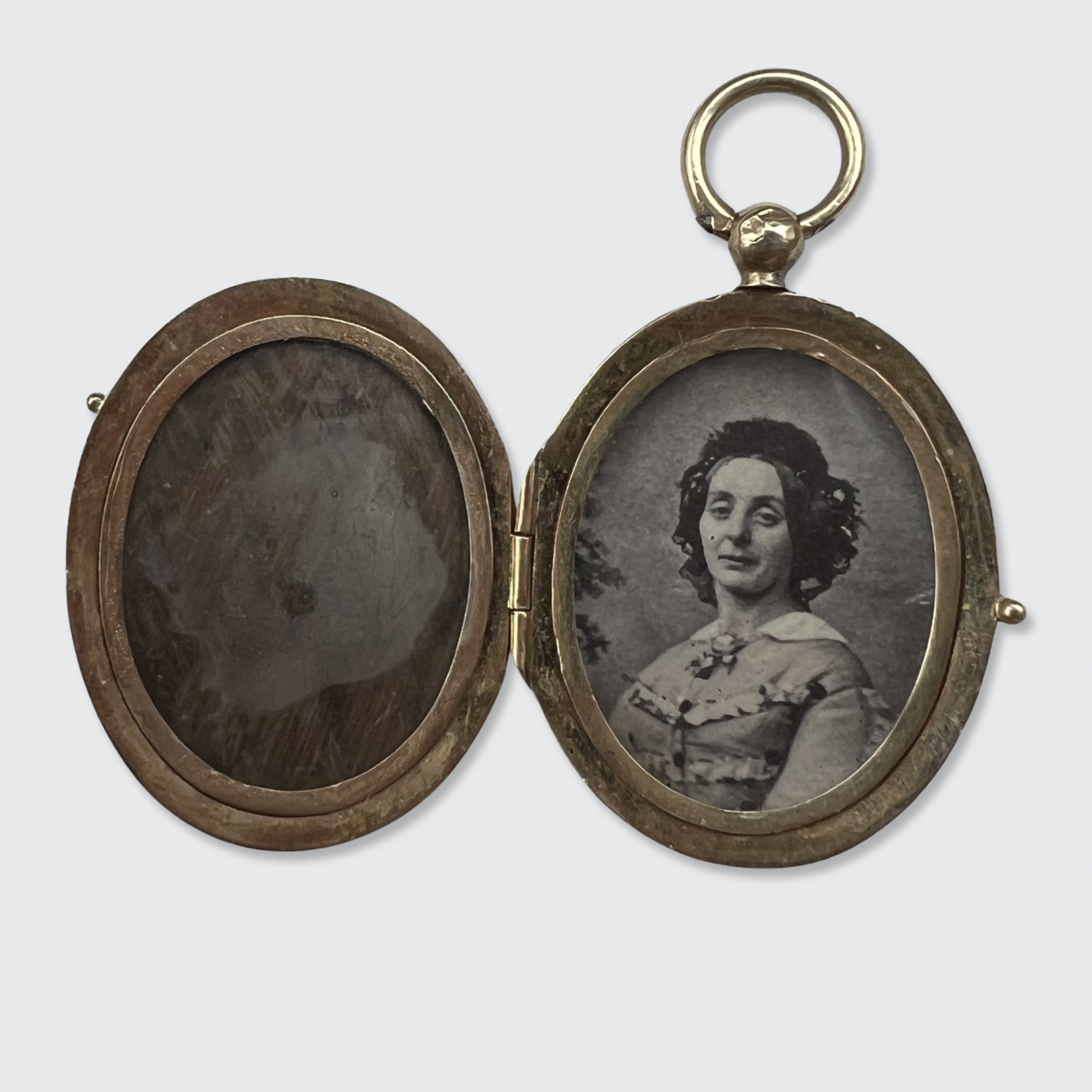 Inside the locket is still a picture of a 19th Century lady on one side, and a piece of woven hair at the other. If desired, the original content can be removed.