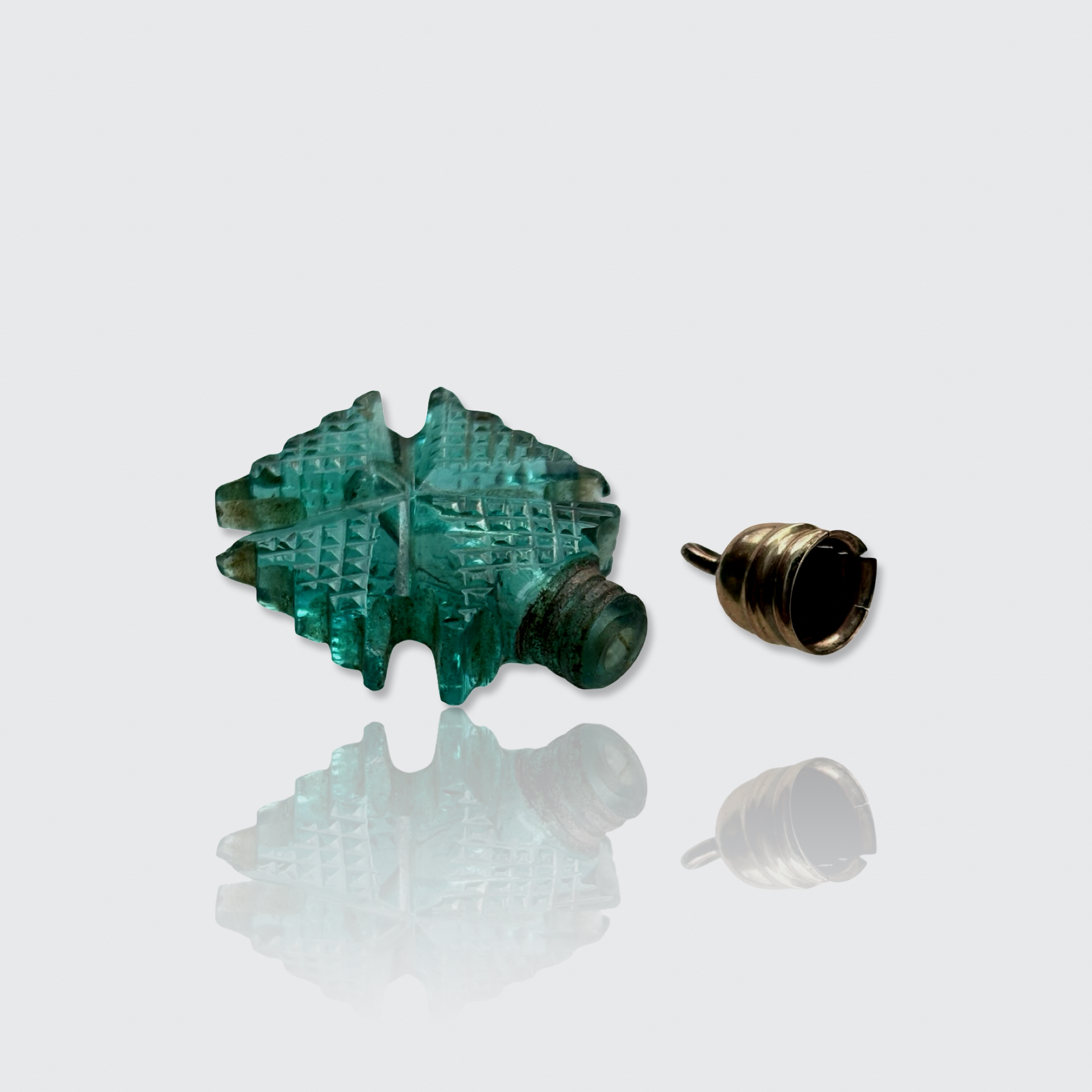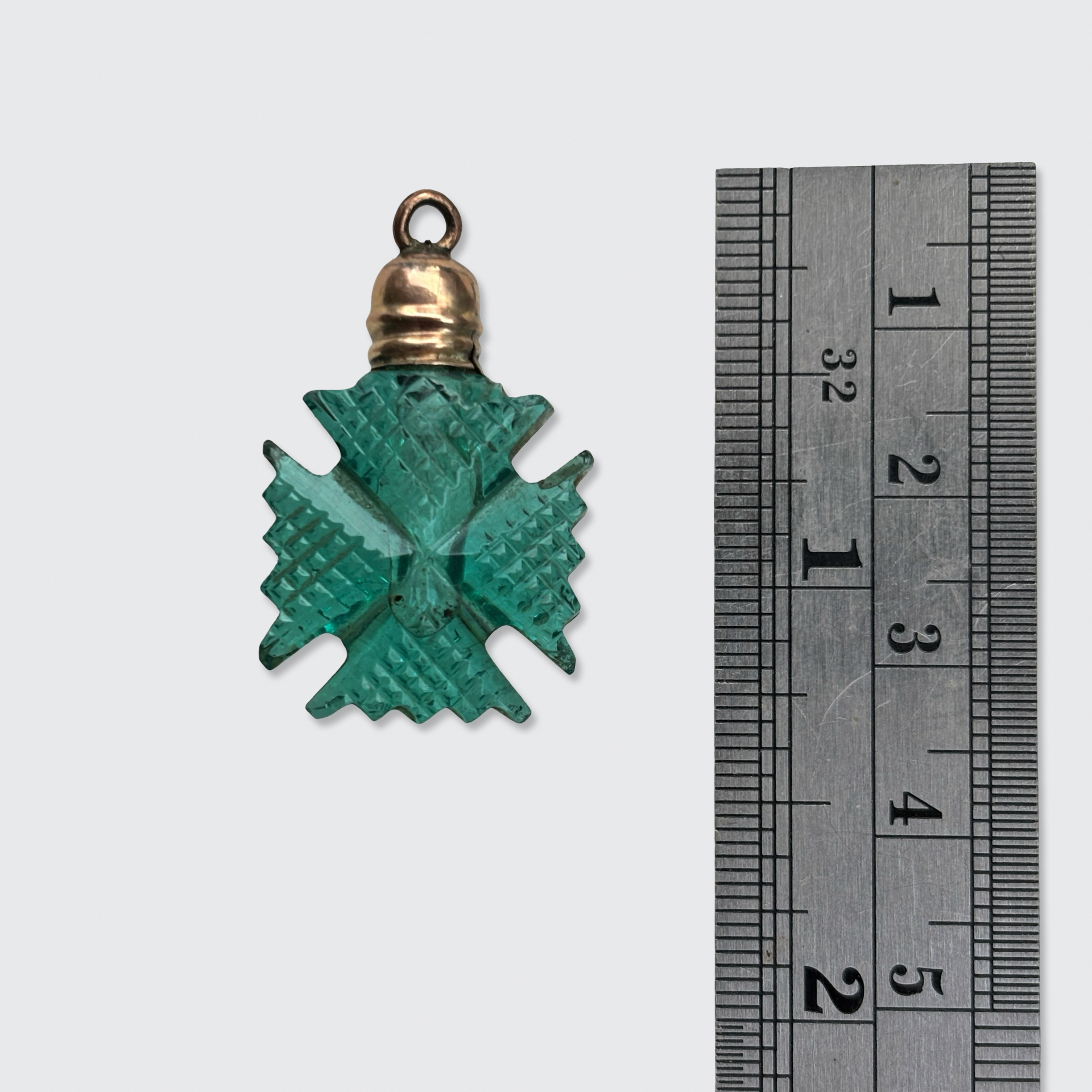 This green glass perfume bottle is shaped like a Maltese cross, and is closed off with a little 10k gold cap which is fitted with a bale, making it wearable as a pendant.