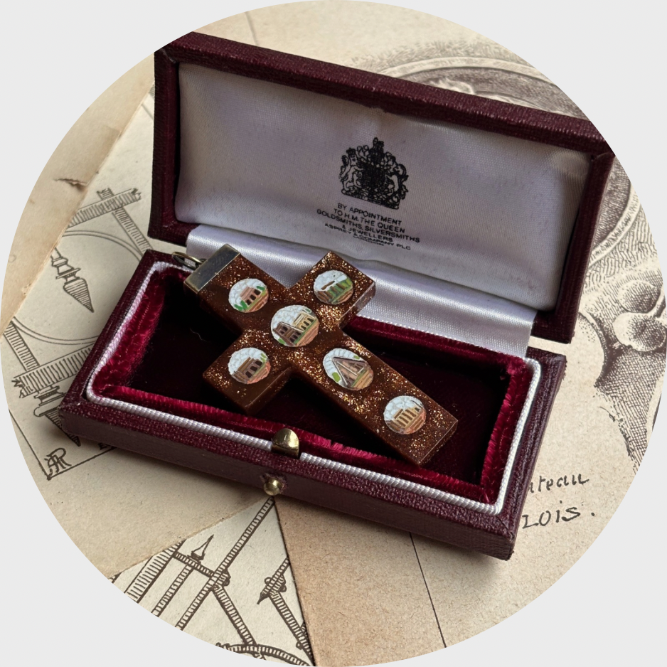This goldstone cross was likely bought as a souvenir during a 19th-century' Grand Tour' through Italy. It is decorated with six micro mosaic panels, which depict ancient monuments in Rome, made from tiny glass tesserae.