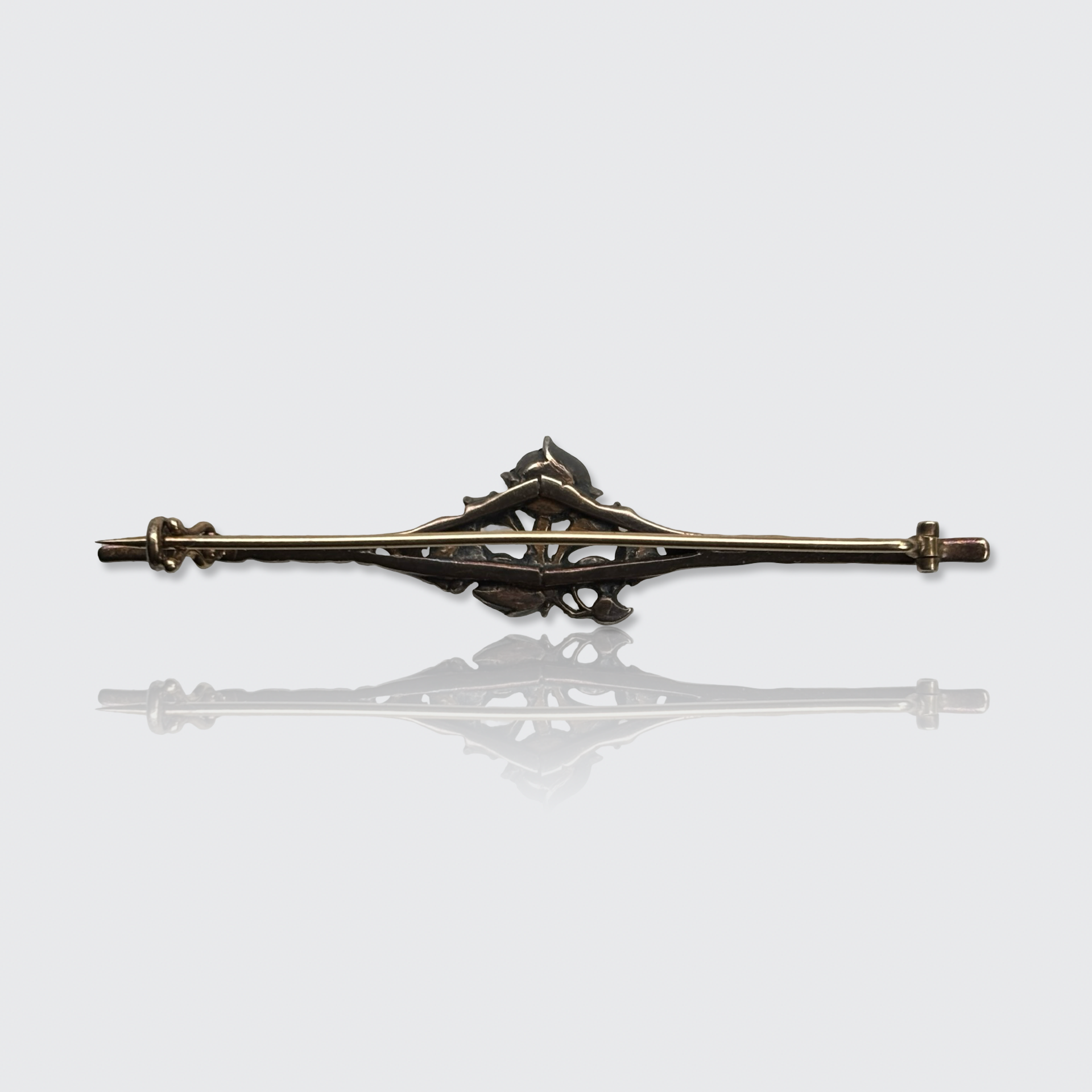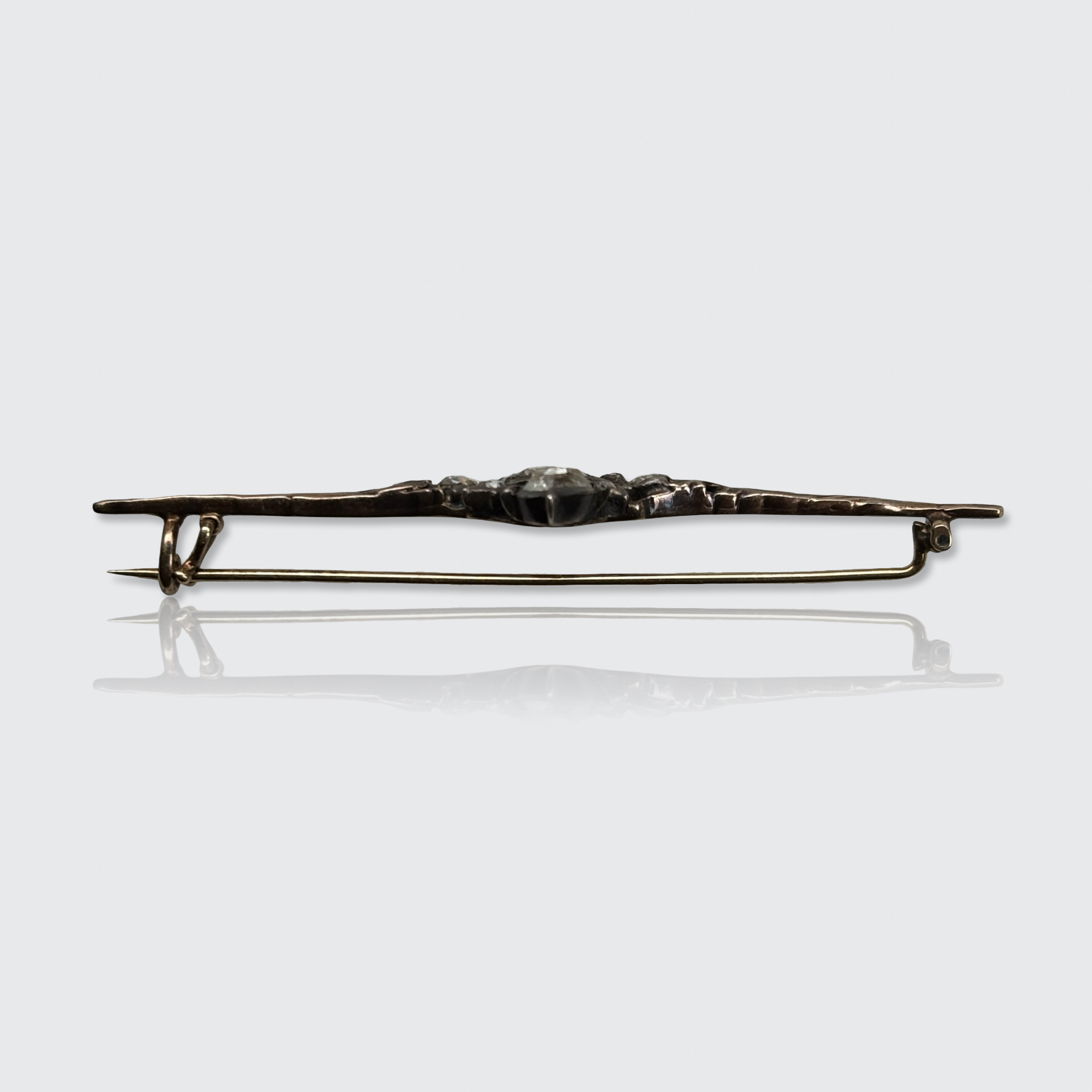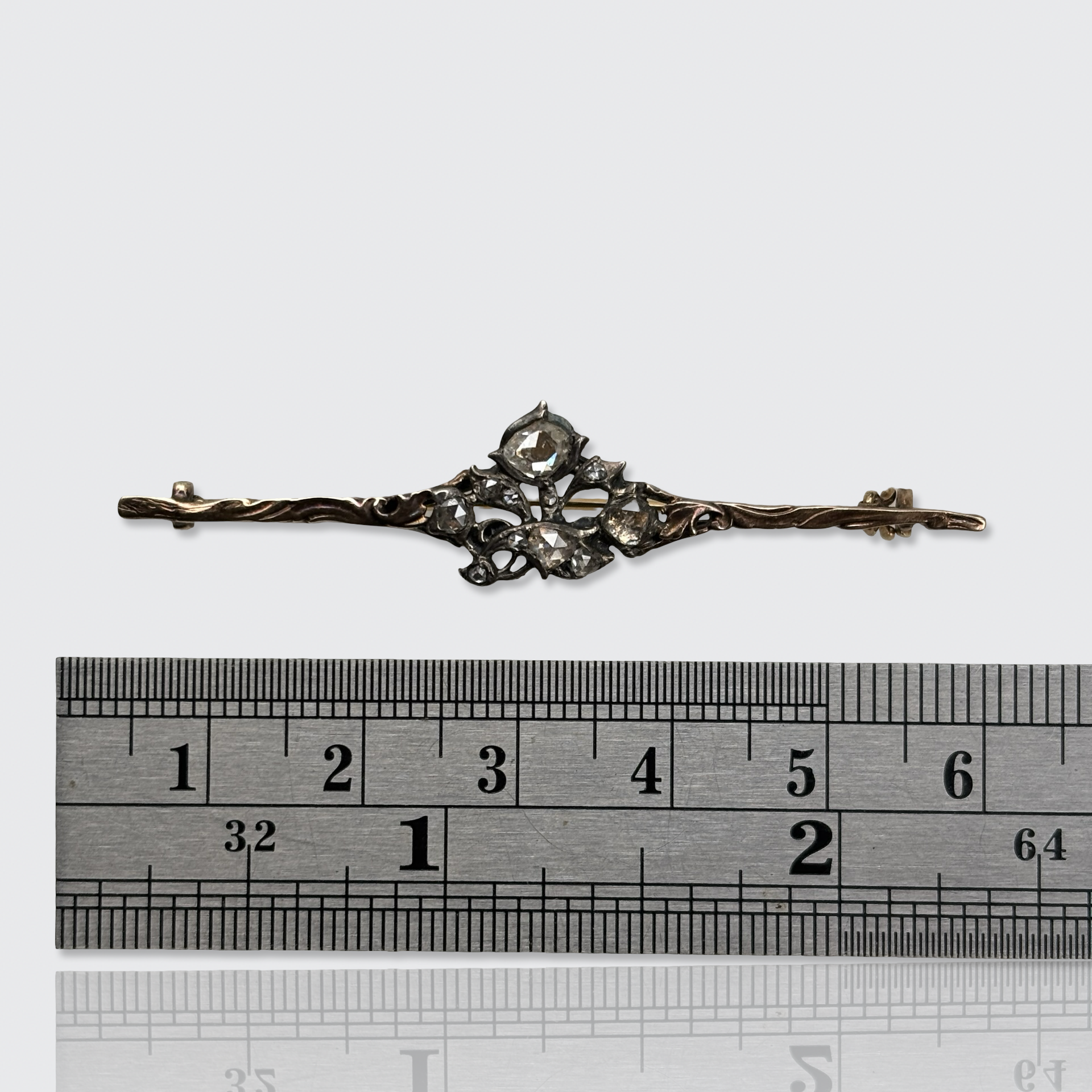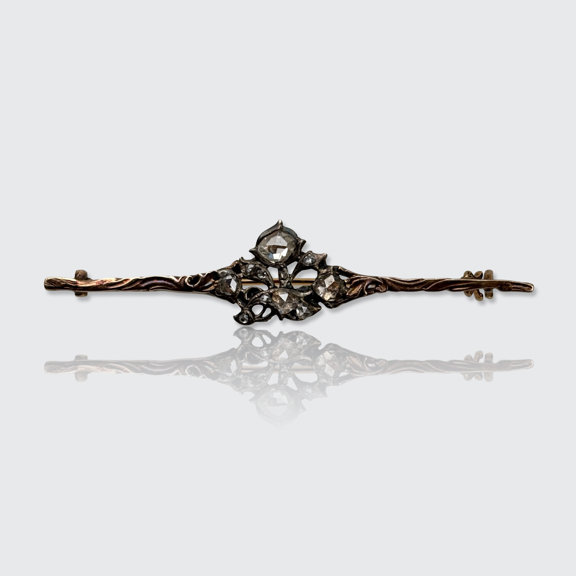 This 18k yellow gold bar brooch is centered by a silver ornament, which is studded with ten rose-cut diamonds of various shapes and sizes.