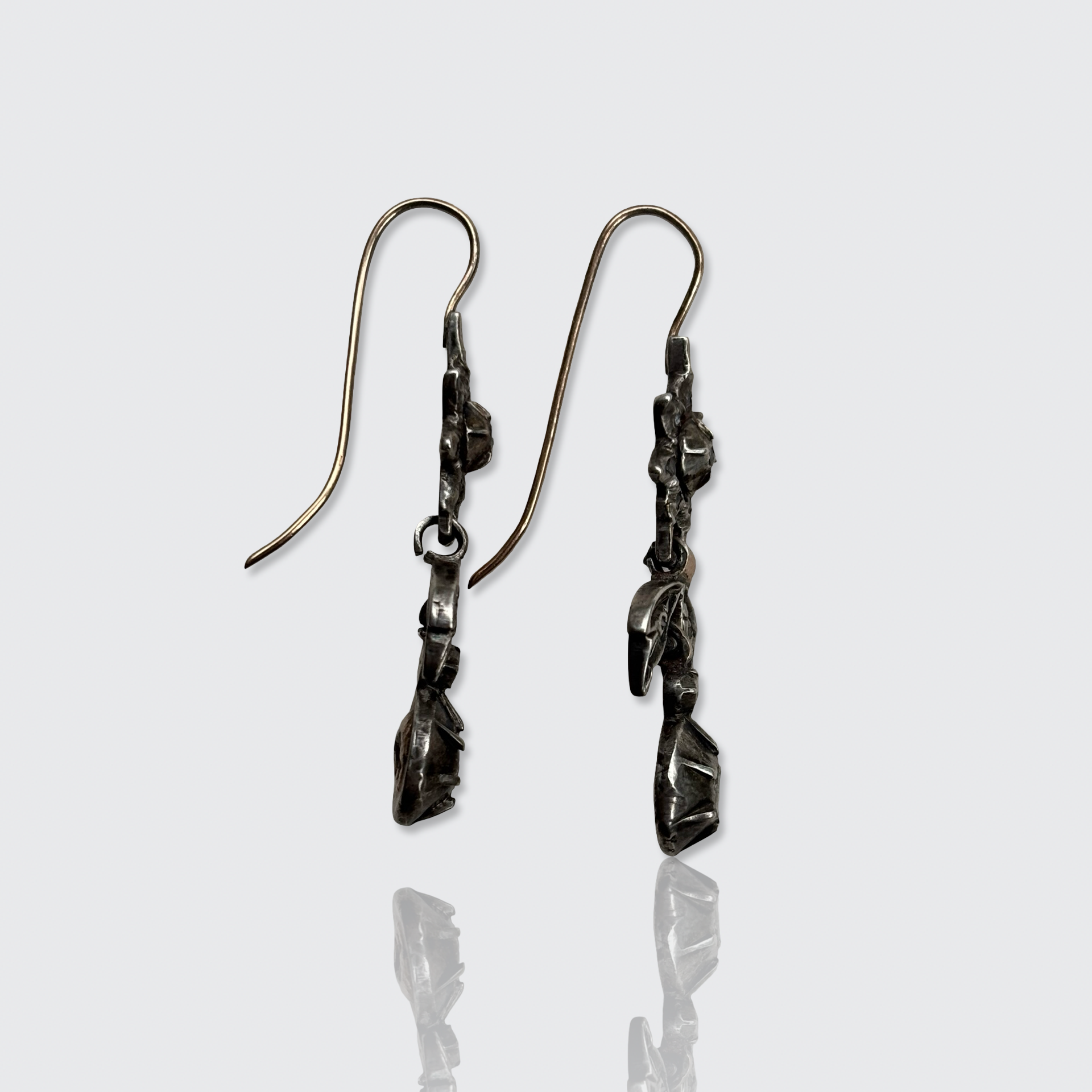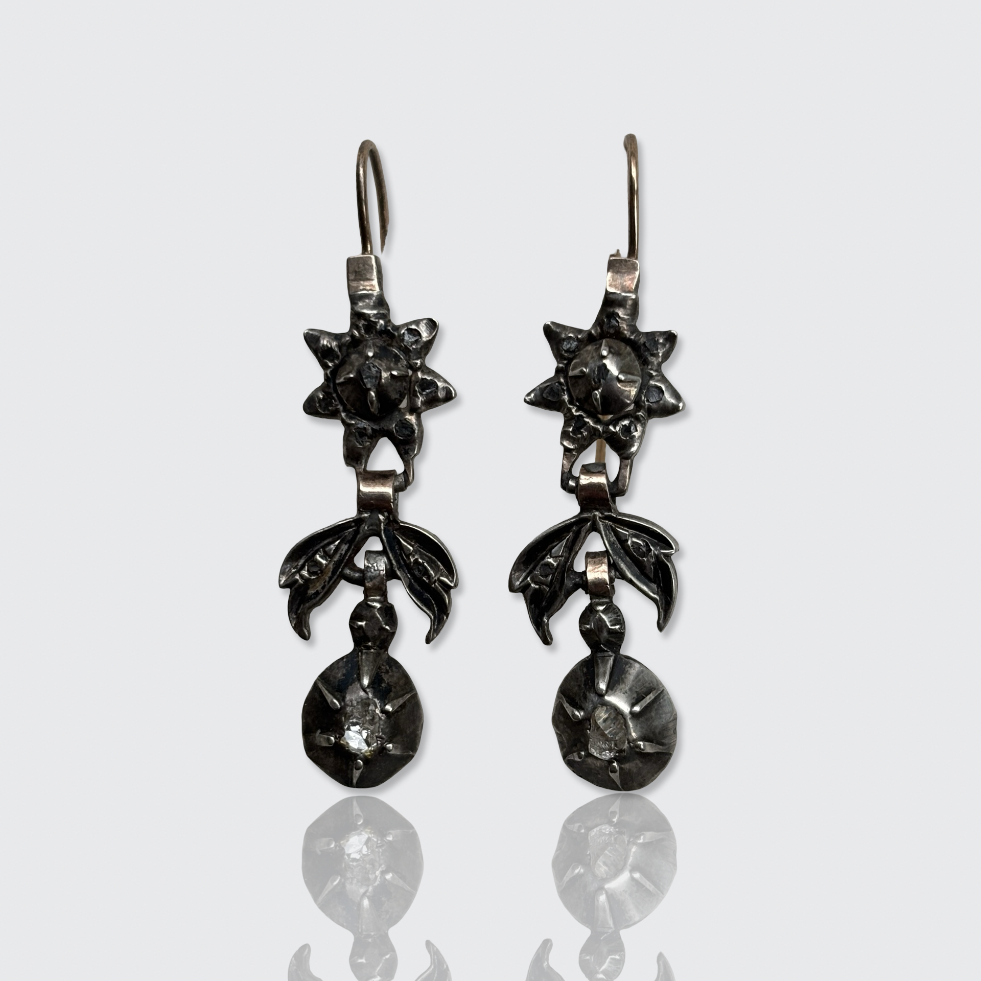 These 14k gold and silver drop earrings are each set with eleven rose-cut diamonds in closed, silver settings. Traditionally, this combination of metals was used because the silver optimizes the diamond's colour and brilliance, while the gold hooks were more durable and would not tarnish, like silver can, giving the risk of staining skin or clothing.