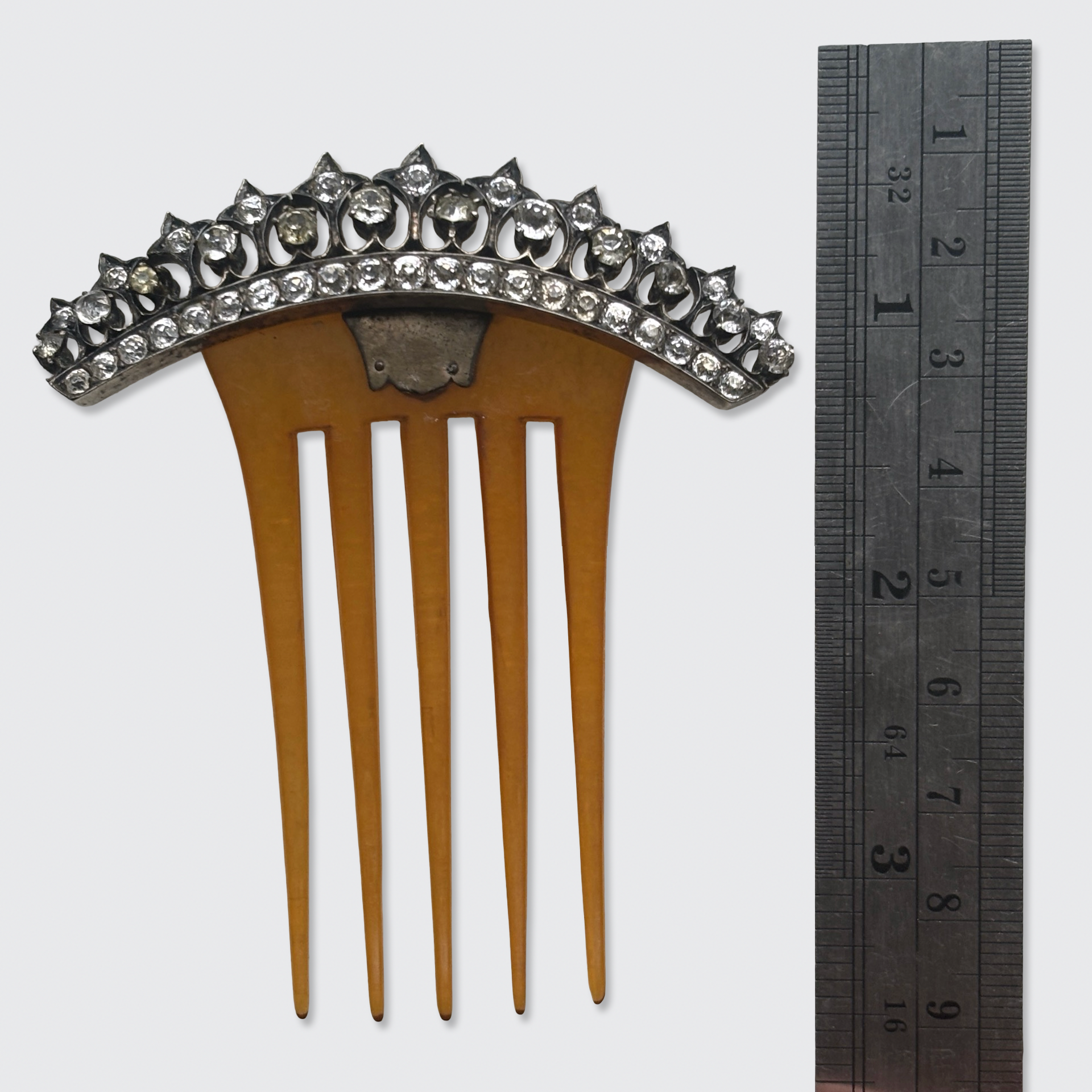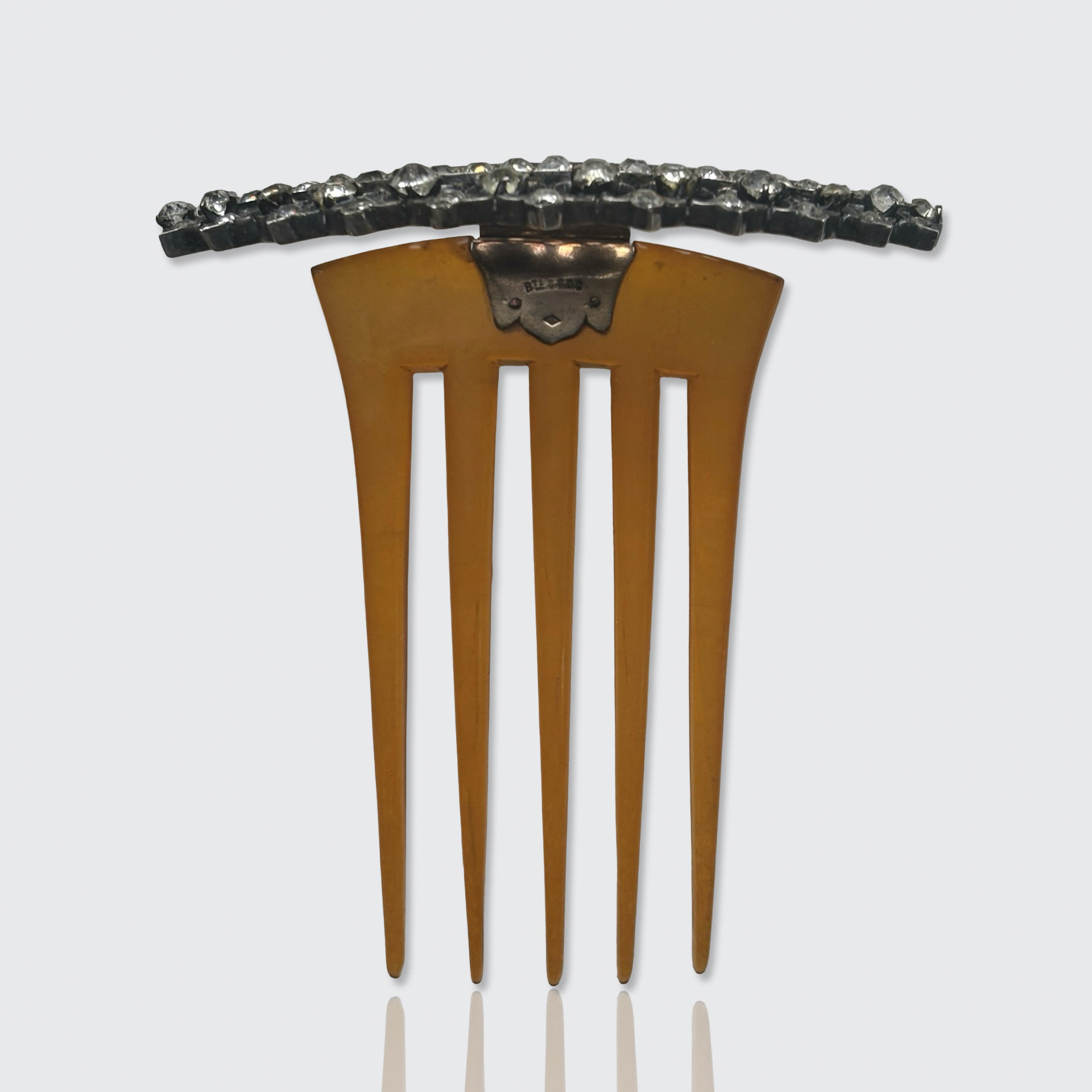 This hair comb has a hinged crown-shaped ornament, which can be positioned into your hair to create a romantic look. The crown is shaped with various paste gemstones.