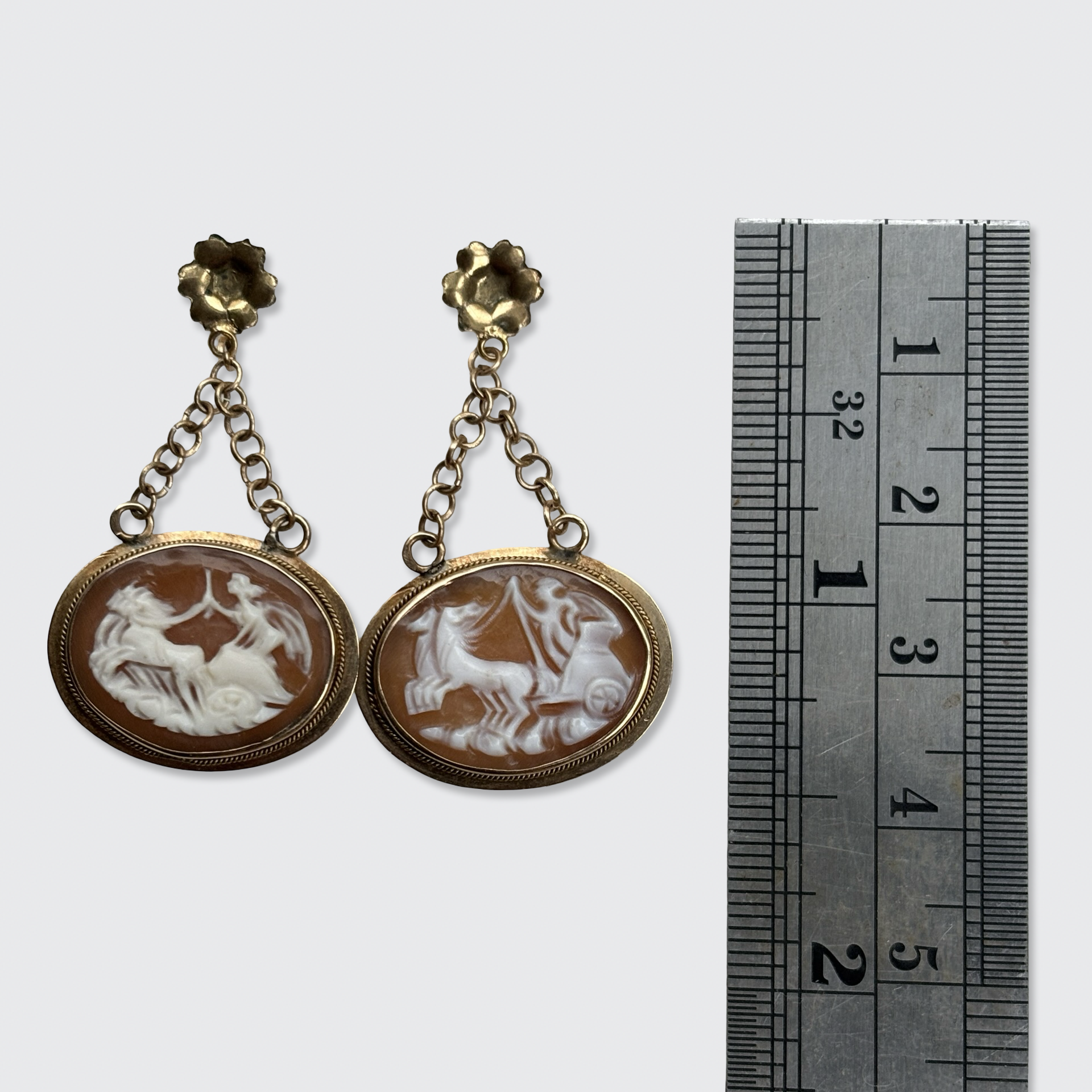 These charming 14k gold drop earrings are each set with a shell cameo that depicts a mythological scene. One earring shows a male and the other a female, both riding a chariot drawn by several horses.