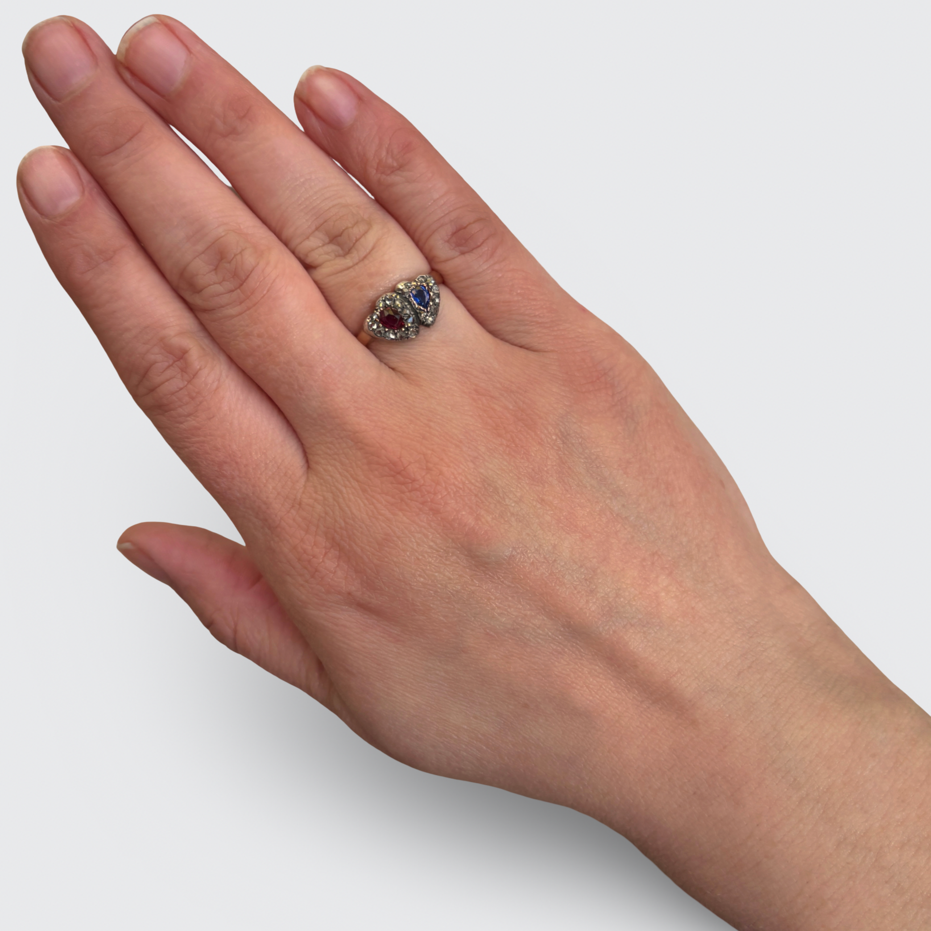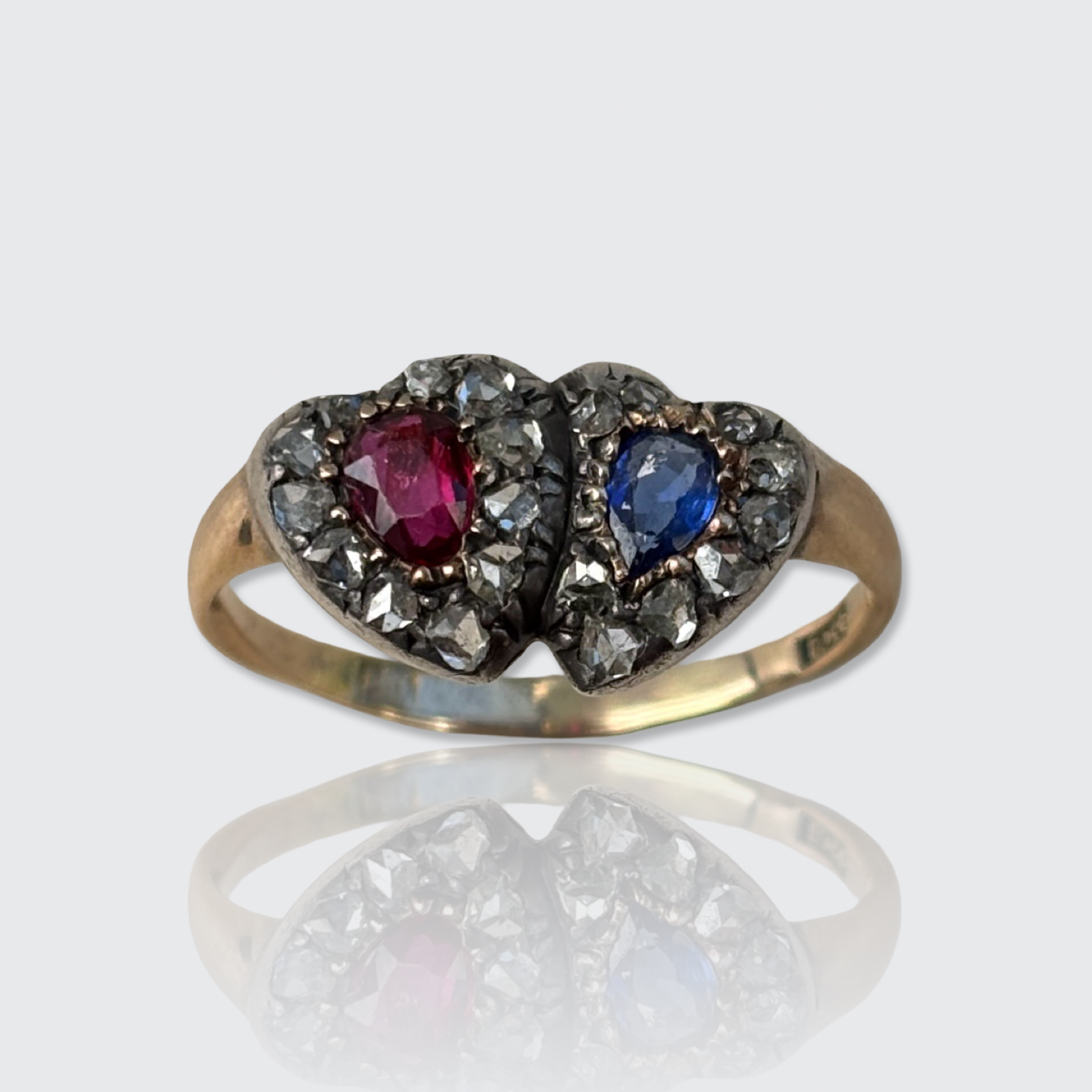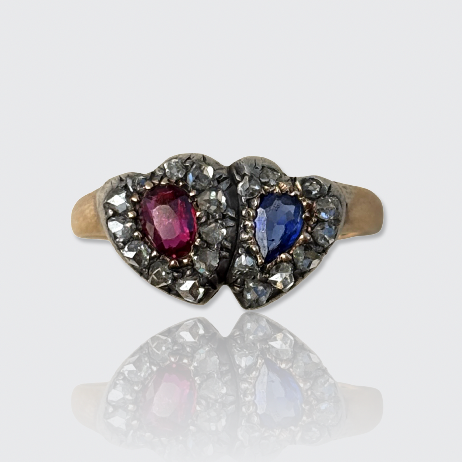 This sweet 15k yellow gold ring is decorated with two overlapping hearts. One is set with a pear-cut natural ruby, the other with a pear-cut natural sapphire, both encircled by a halo of rose-cut diamonds in silver settings. All gemstones have been placed in open settings, allowing light to pass through the stones.