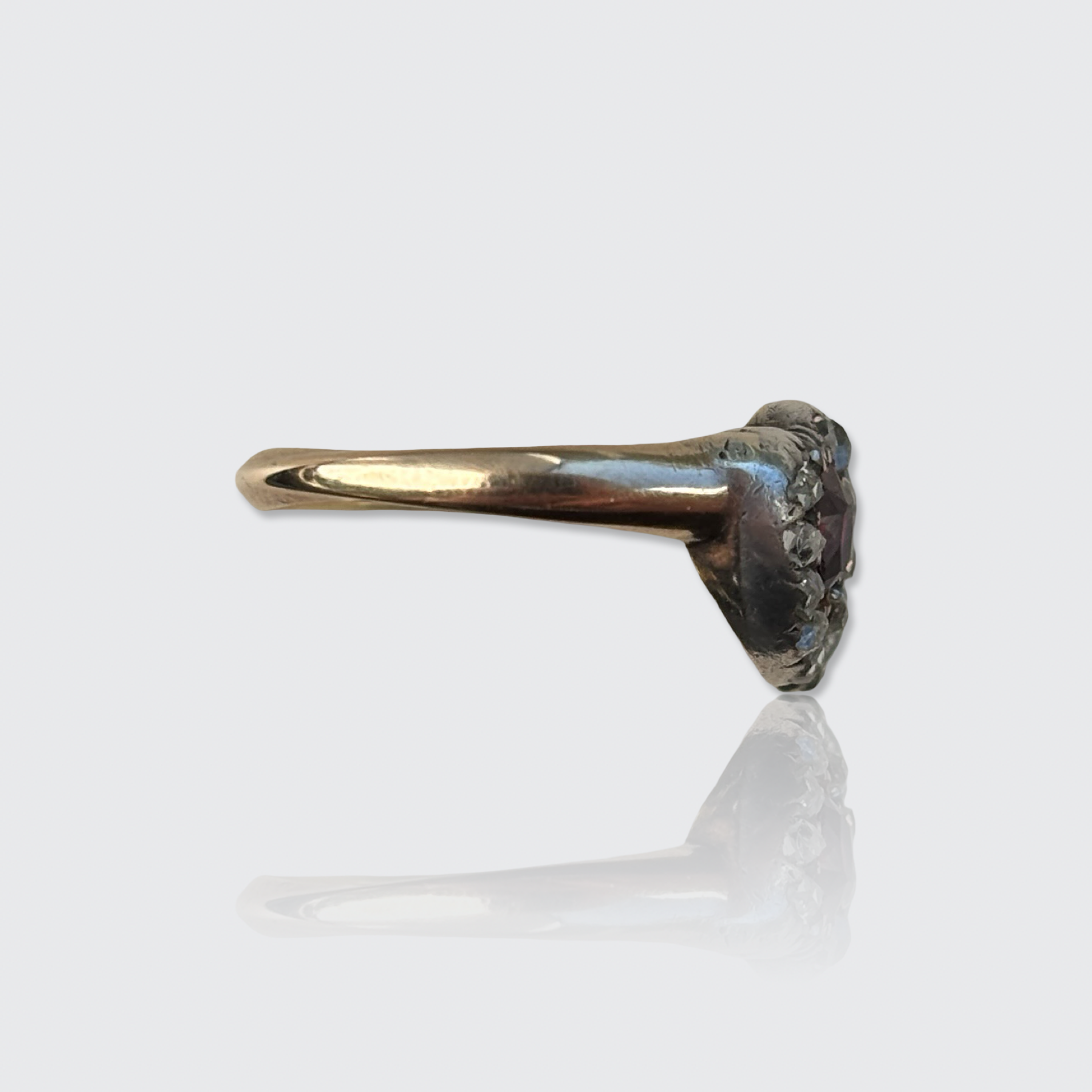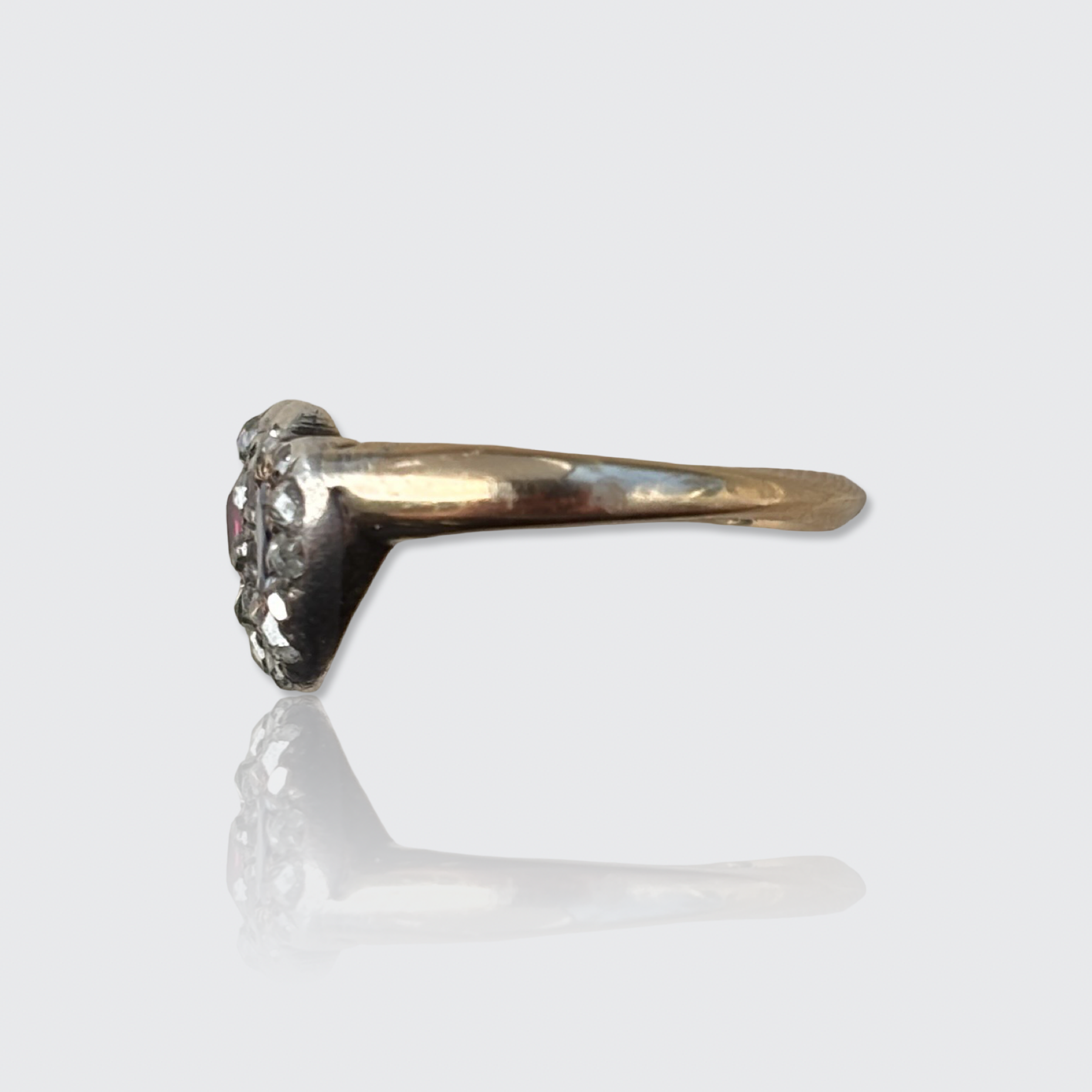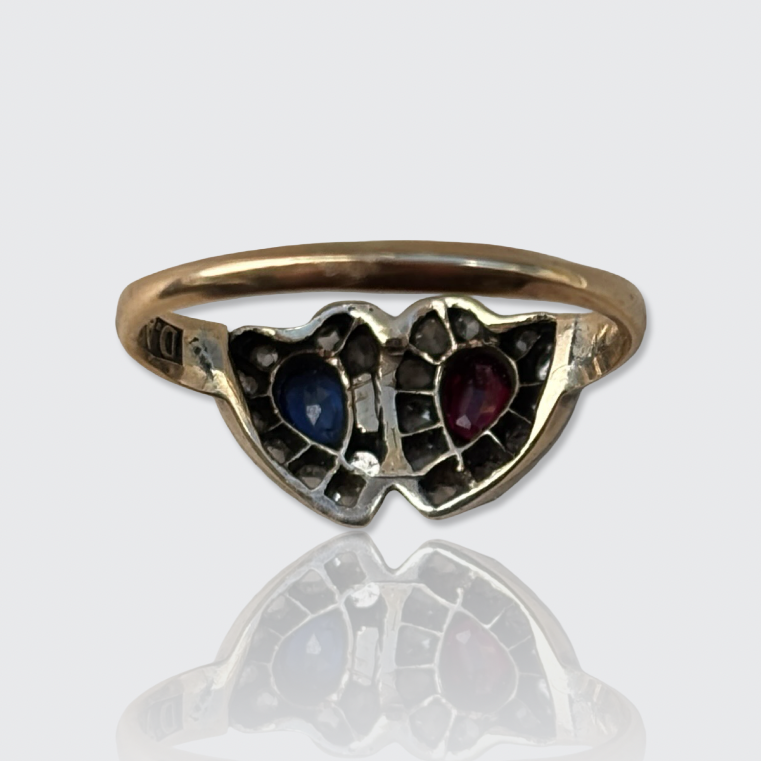 This sweet 15k yellow gold ring is decorated with two overlapping hearts. One is set with a pear-cut natural ruby, the other with a pear-cut natural sapphire, both encircled by a halo of rose-cut diamonds in silver settings. All gemstones have been placed in open settings, allowing light to pass through the stones.