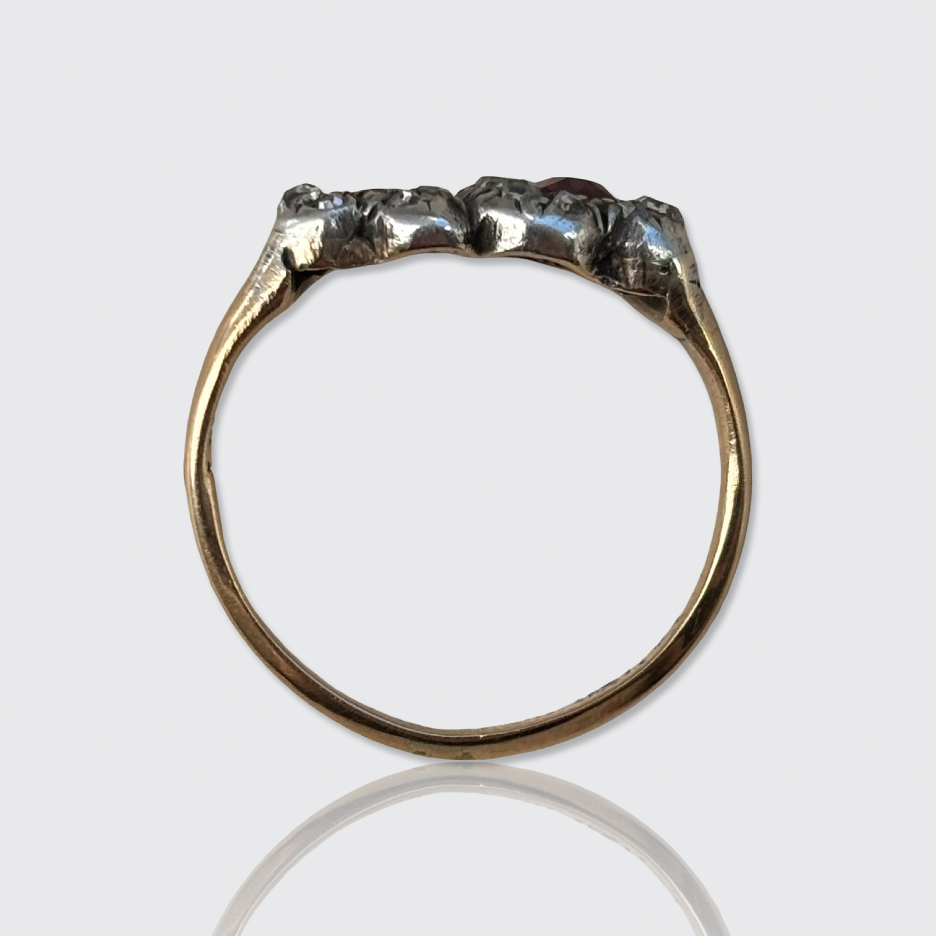 Material: Hallmarked and acid tested as being 15k gold and silver. The inside of the shank also carries the maker's mark 'D.A.J.', which I was not able to identify.