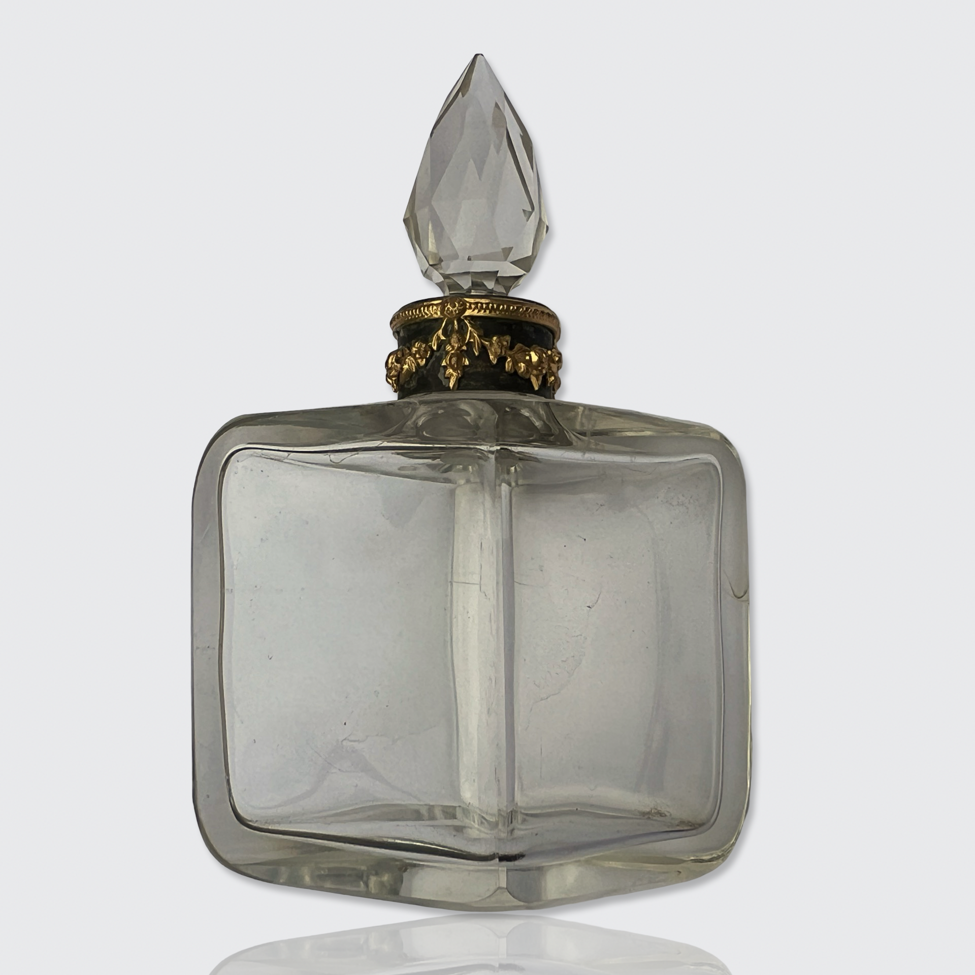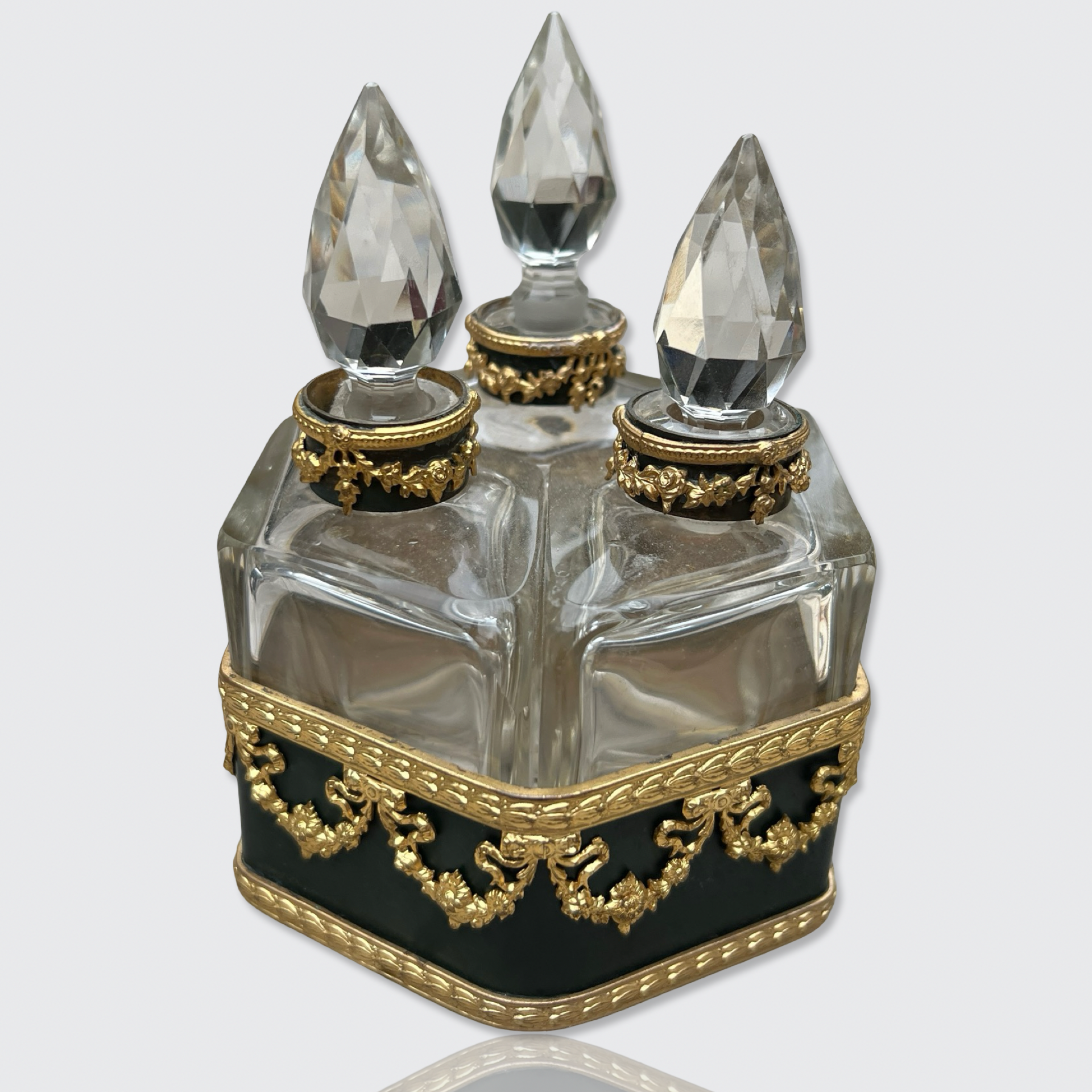 These three kite-shaped perfume bottles cleverly fit together as a set in a fitted hexagonal-shaped brass base, which is decorated with garlands on a green background.