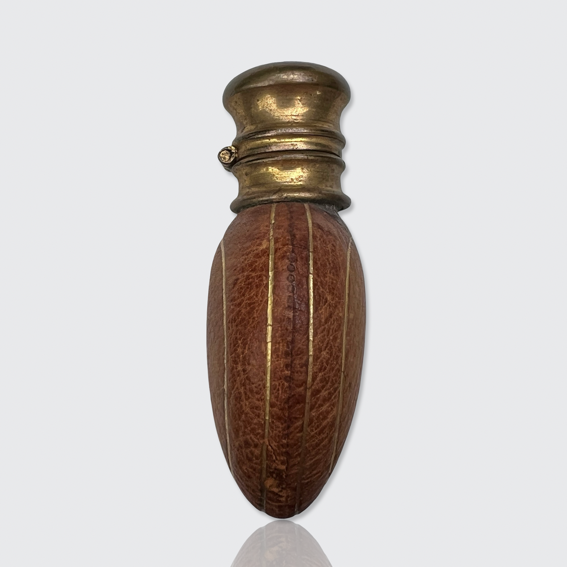 This heart-shaped glass perfume bottle is fitted in a non-removable leather case. It still has its original, glass stopper.