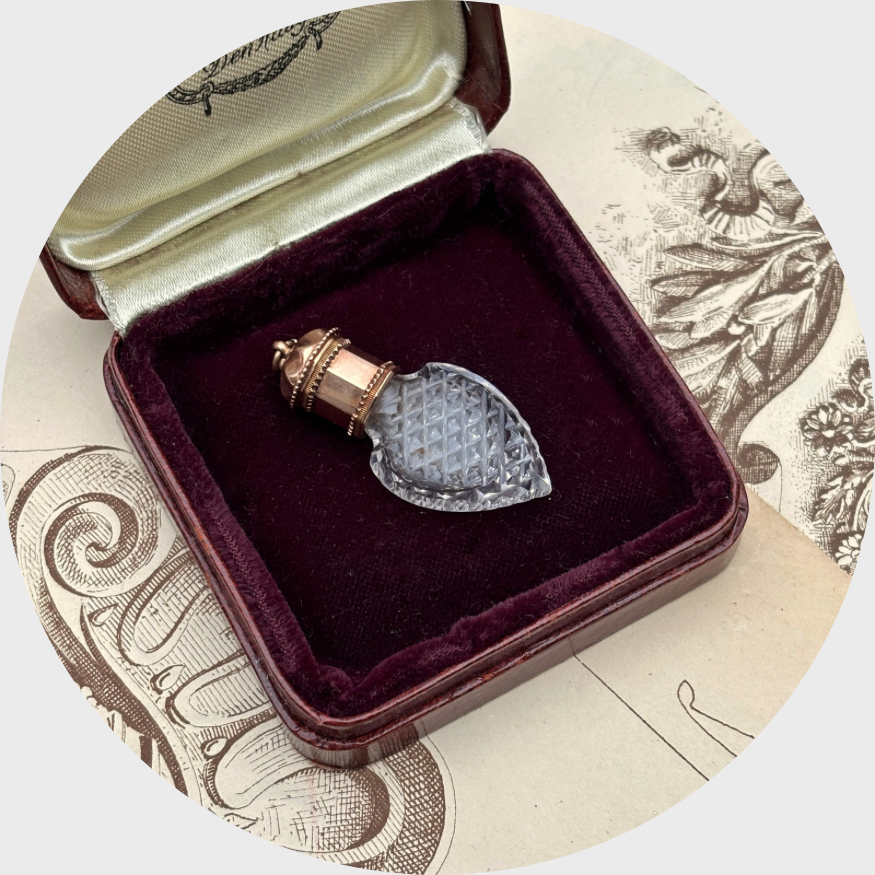 This crystal heart-shaped perfume flask is fitted with a hexogonal-shaped gold cap.