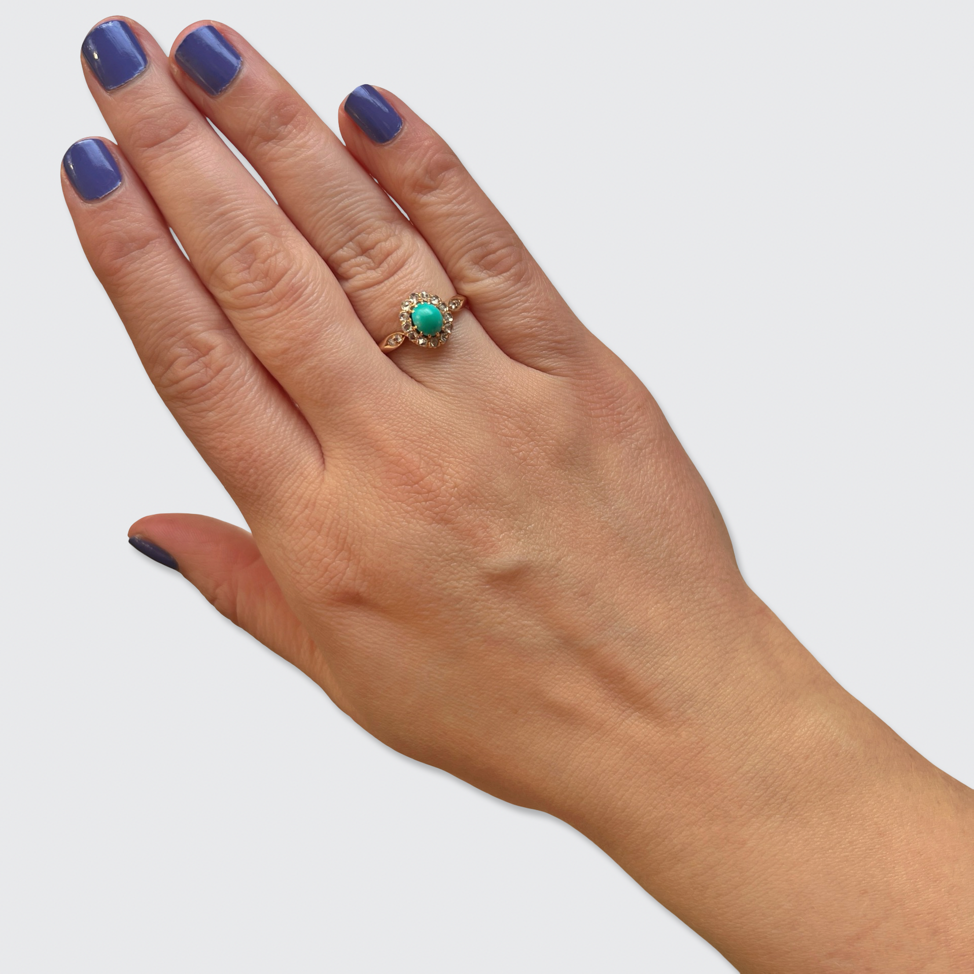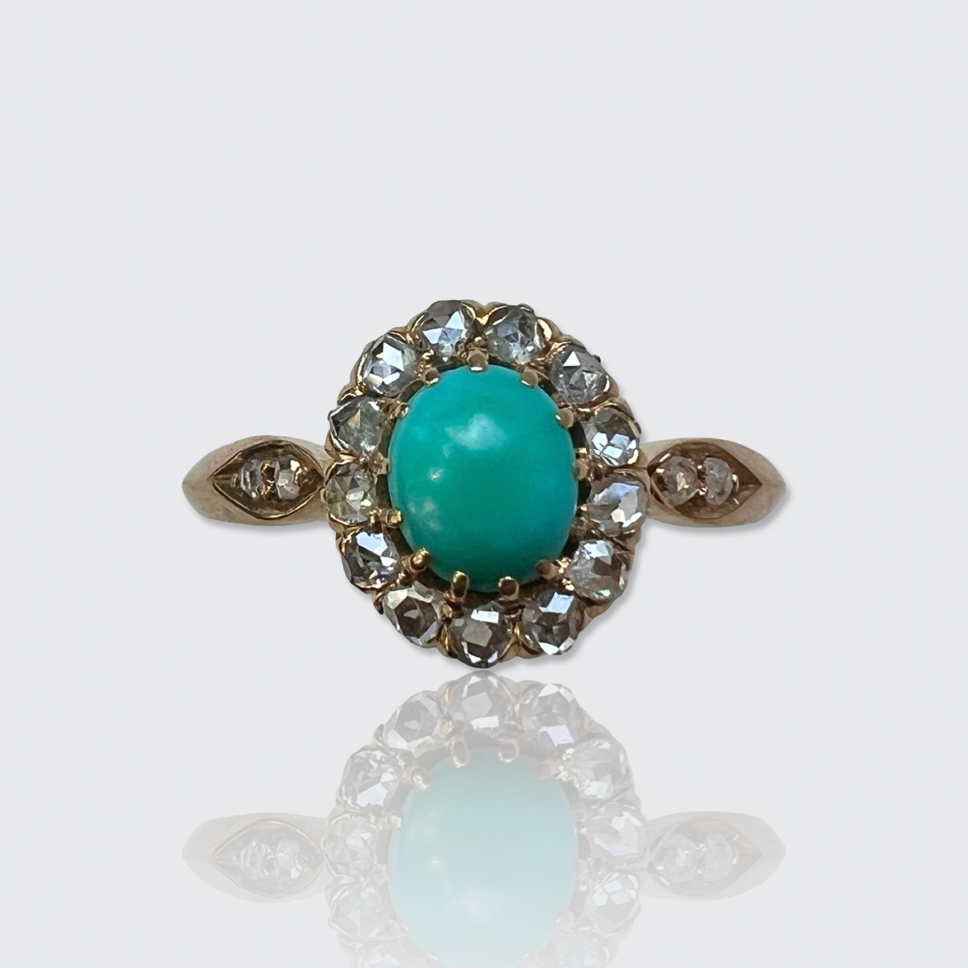 This 18k yellow gold ring is centered by an oval, cabochon-cut turquoise, which is encircled by a halo of rose-cut diamonds. The shoulders of the ring are also studded with small rose-cut diamonds.