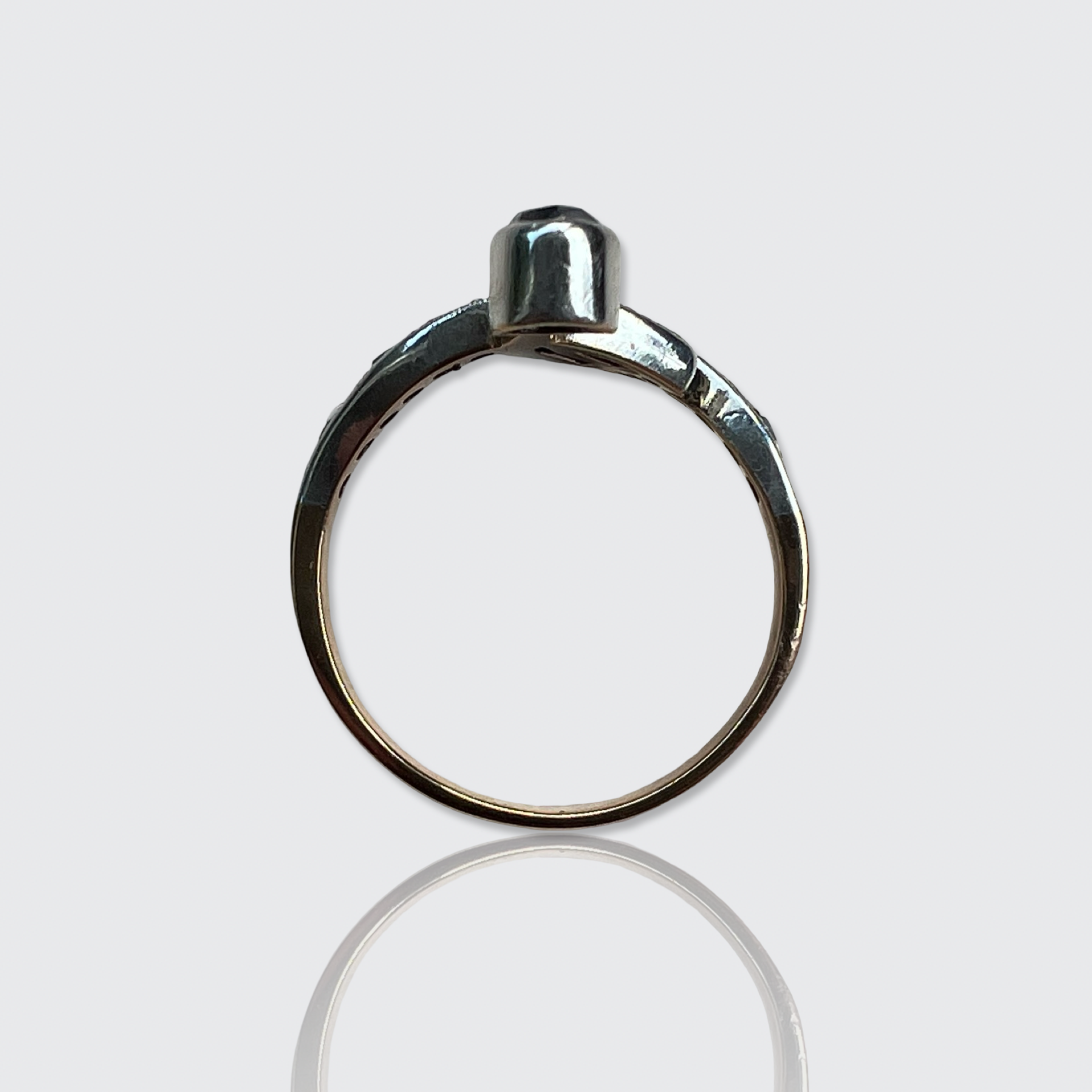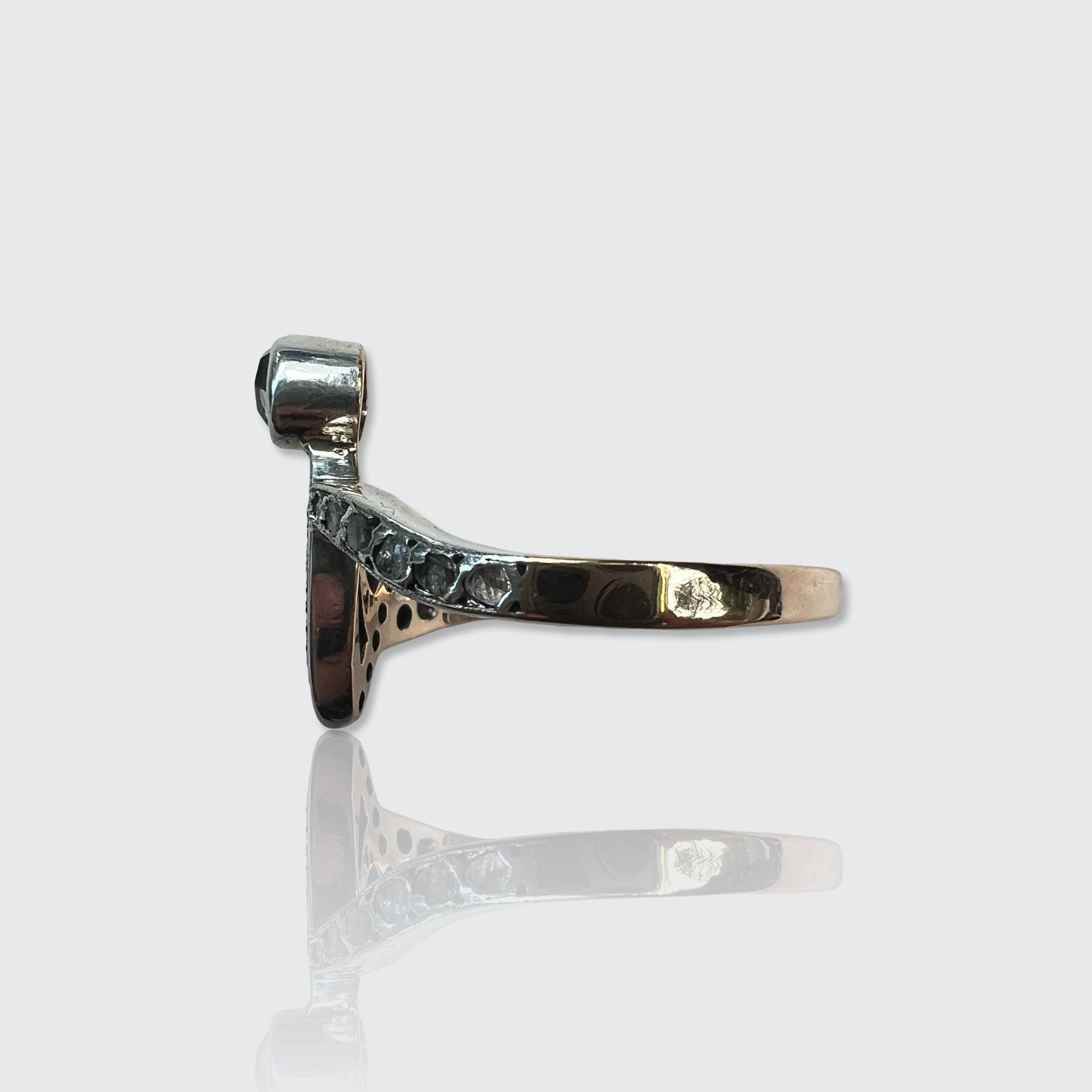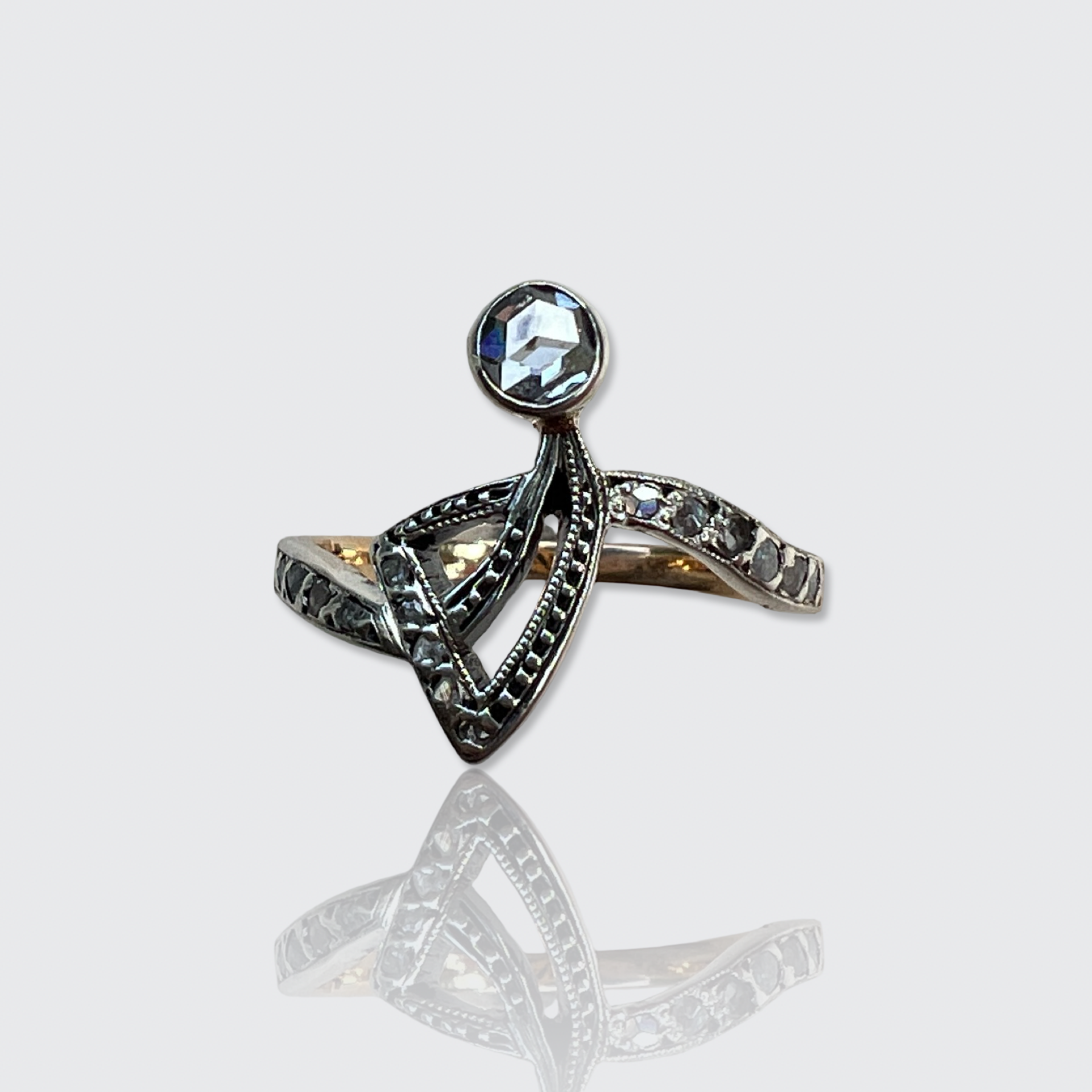 The design of this 18k gold and silver ring is typical for the era that predates the Art Deco period, which we now call the 'Belle Epoque'. The front is shaped in a curling shape, reminiscent of a swirl or bow, studded with rose-cut diamonds. The straight lines in this design are a precursor of the Art Deco fashions that would follow in the 1920s.