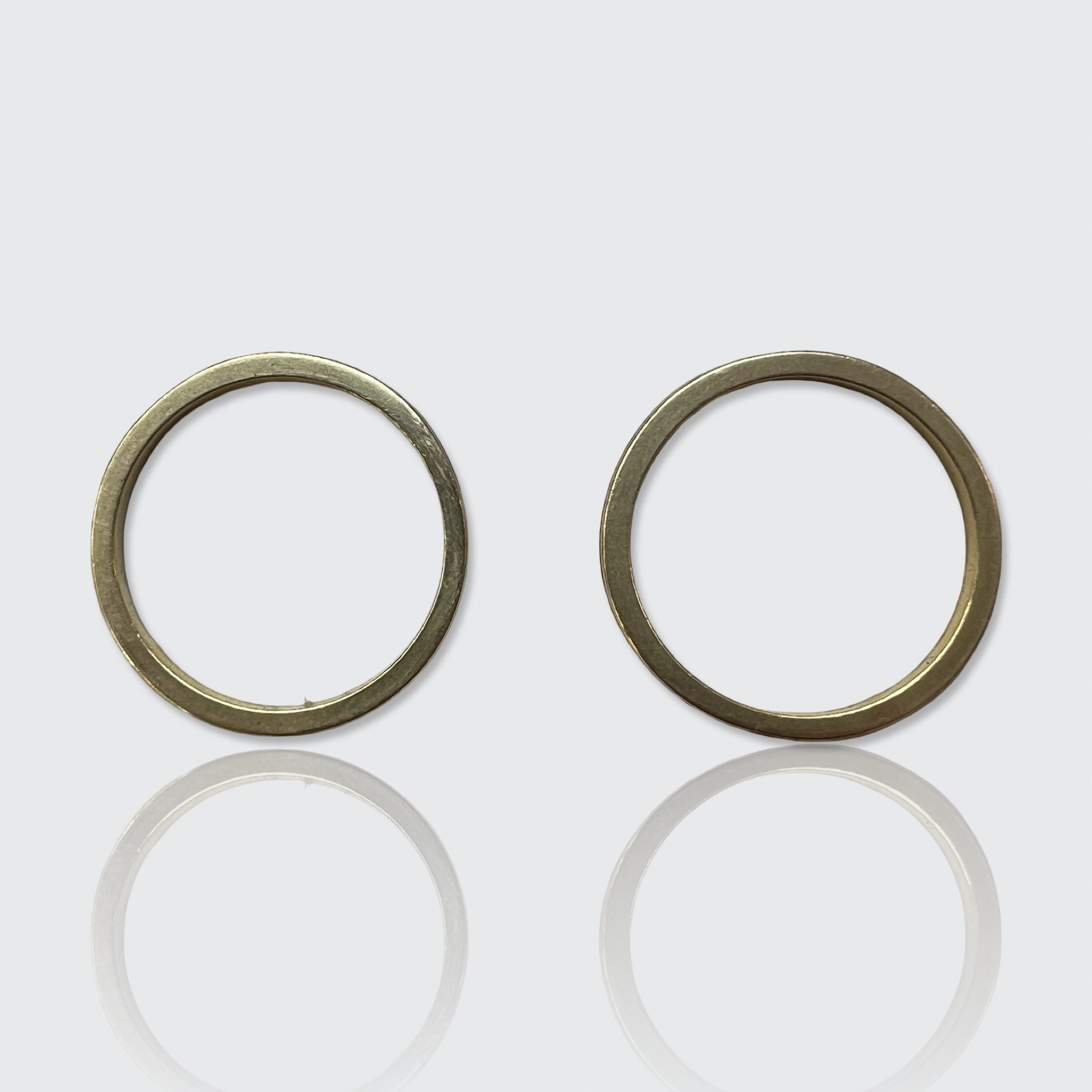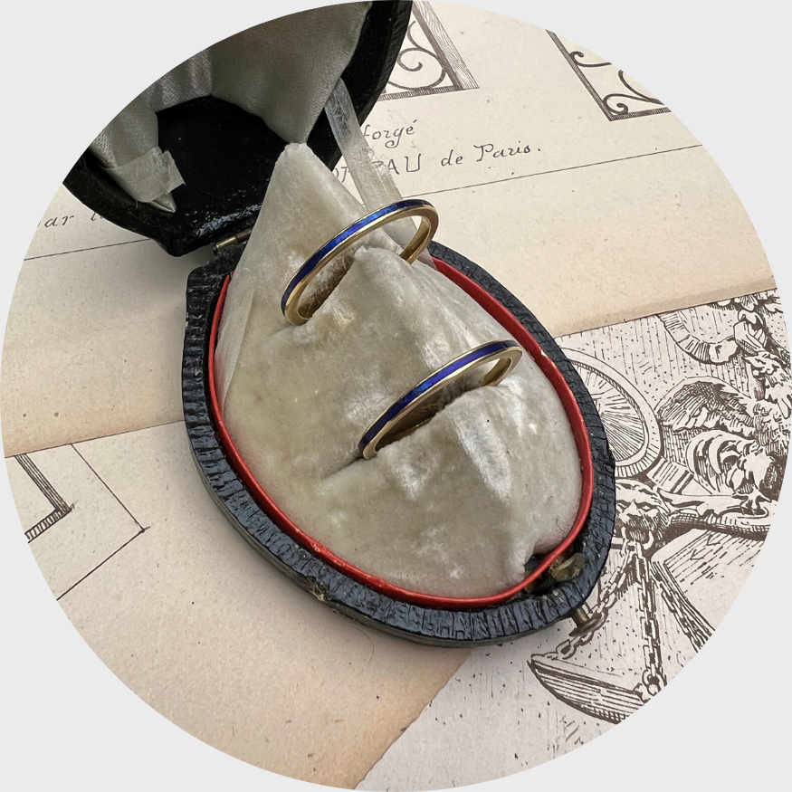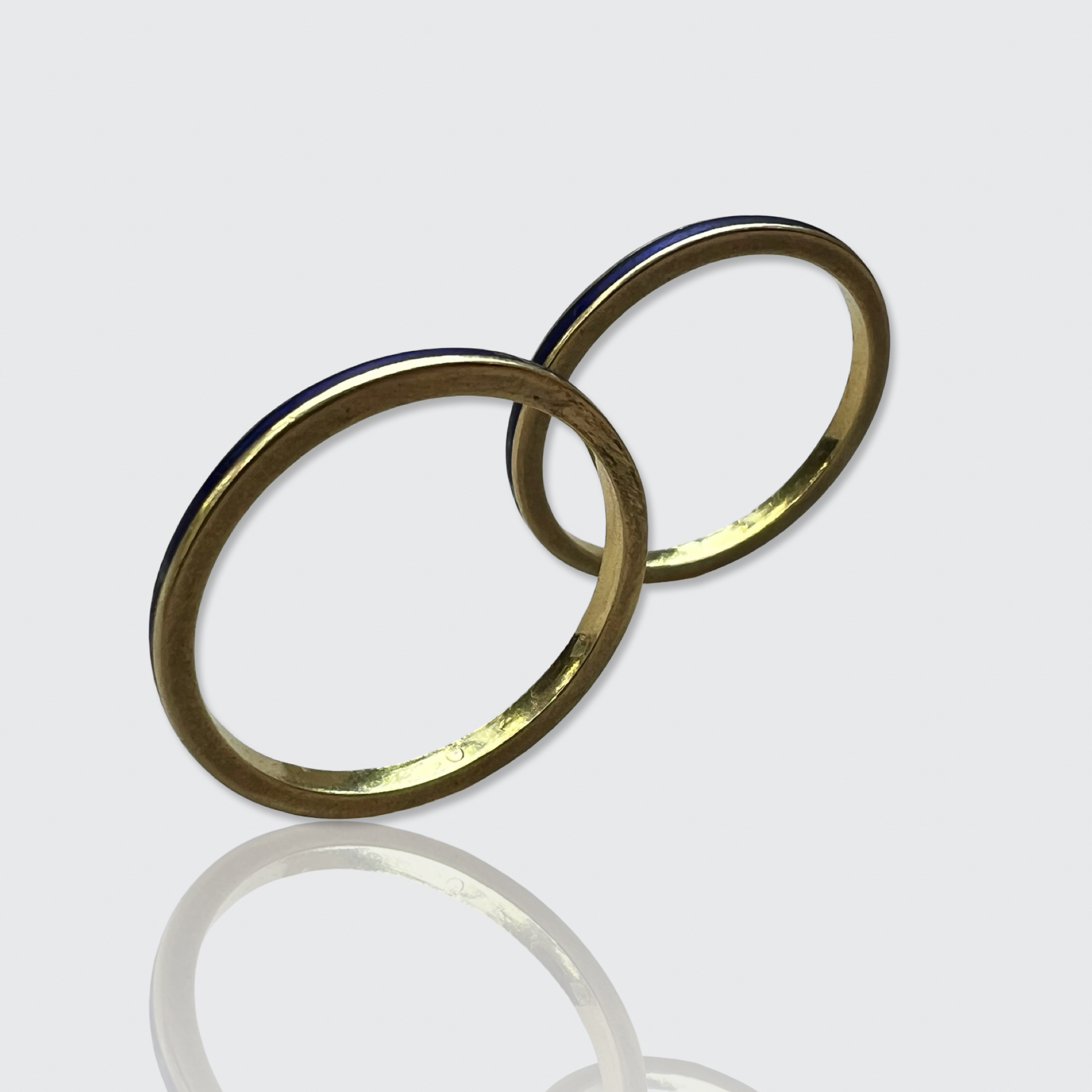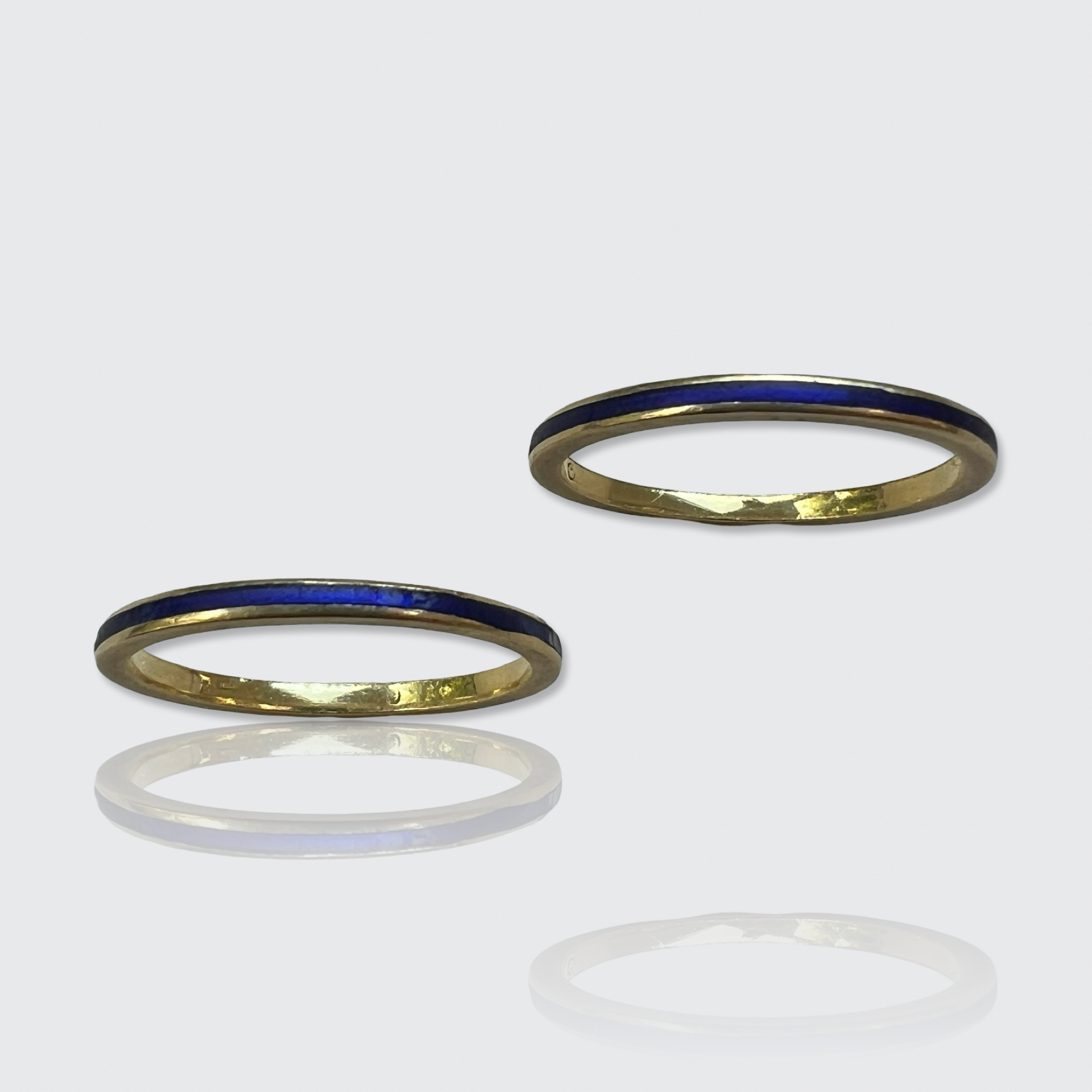 These two 18k yellow gold bands are each decorated with a line of royal blue enamel. They could be worn seperately as friendship rings, but also look great stacked together, or worn to 'frame' a third ring, as I am doing in the last picture.