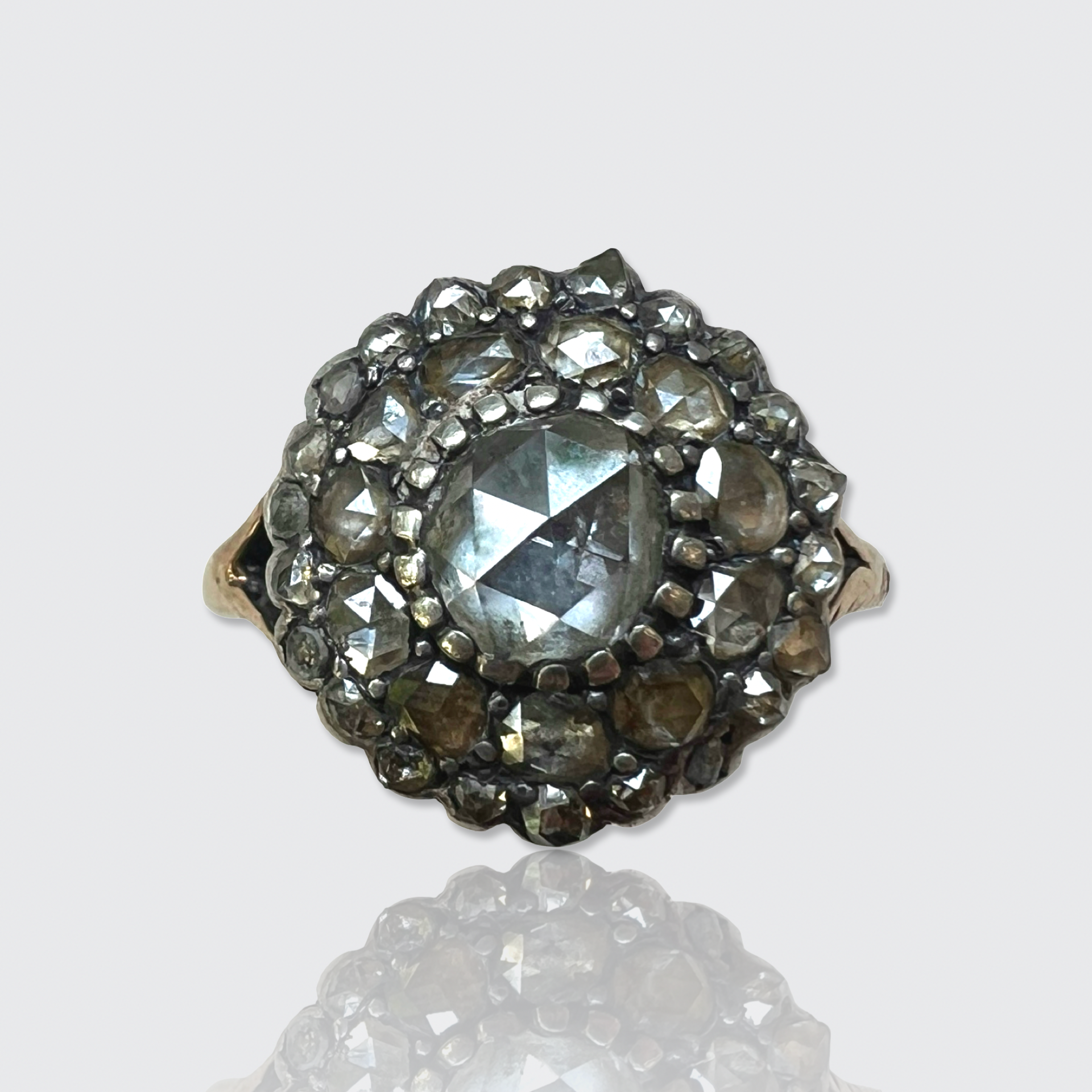 This 14k yellow gold ring is centered by a rose-cut diamond with a diameter of 5.3 mm, which is encircled by two haloes of smaller, irregularly hand-cut rose-cut diamonds.