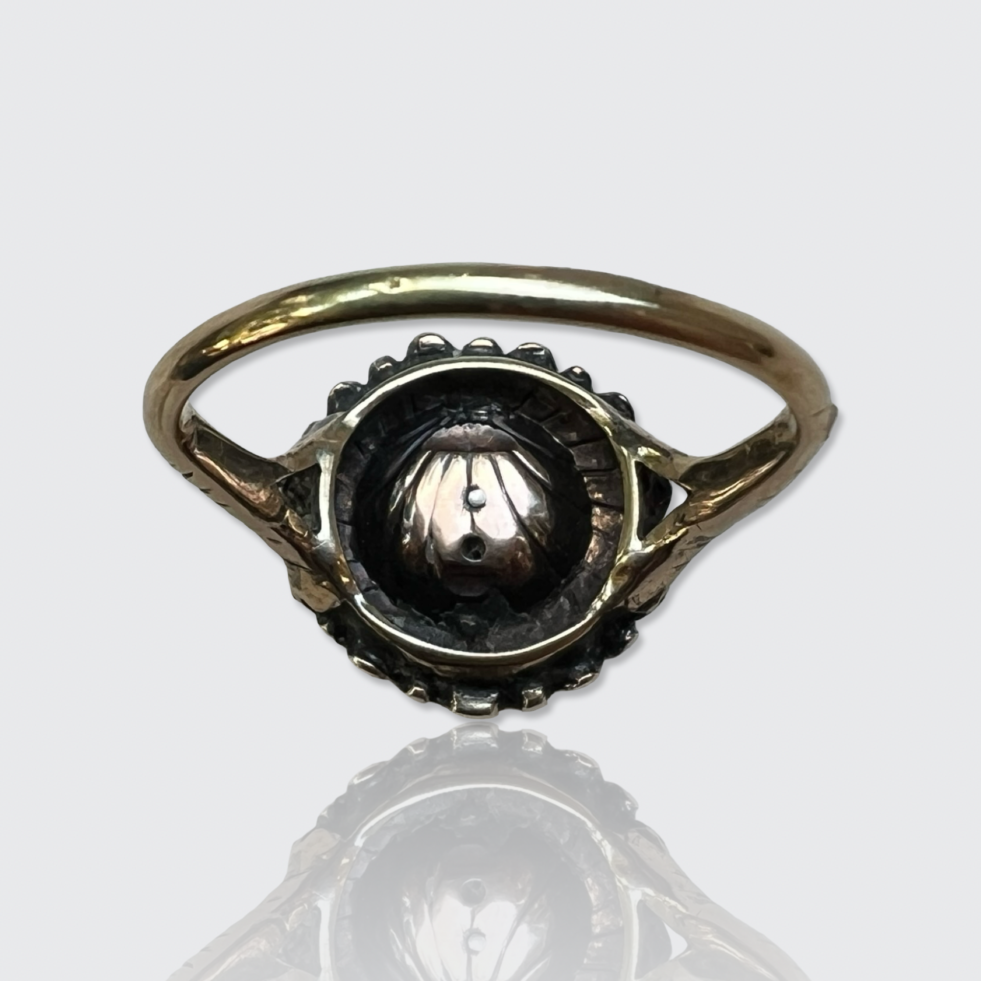 Condition: In good antique condition with minor wear, consistent with its age. Two small rose-cut diamond in the outer halo were missing and have been replaced. The design on the outside of the shank has faded with wear over time. The inside of the front setting has two small rivets, likely caused by the ring being worn next to a wedding band for many years.