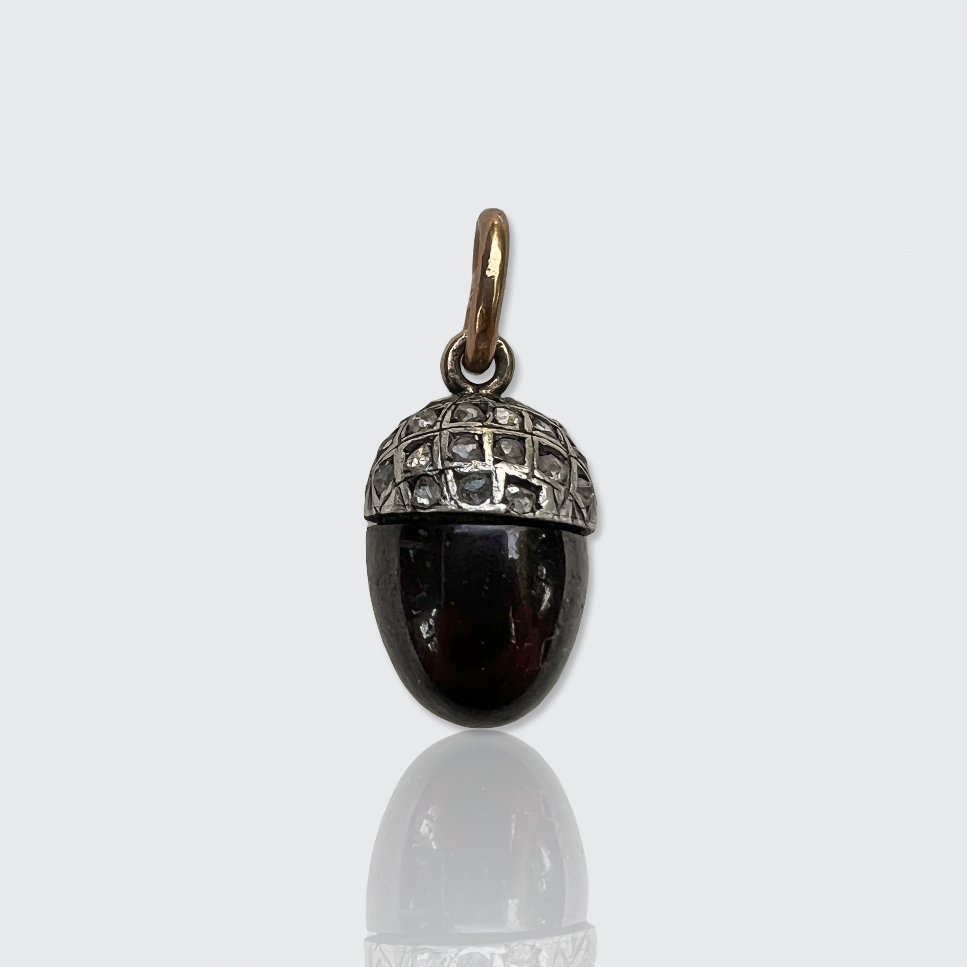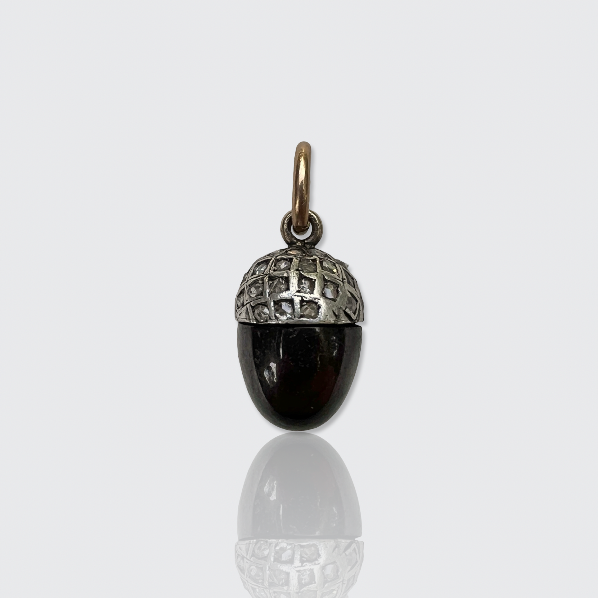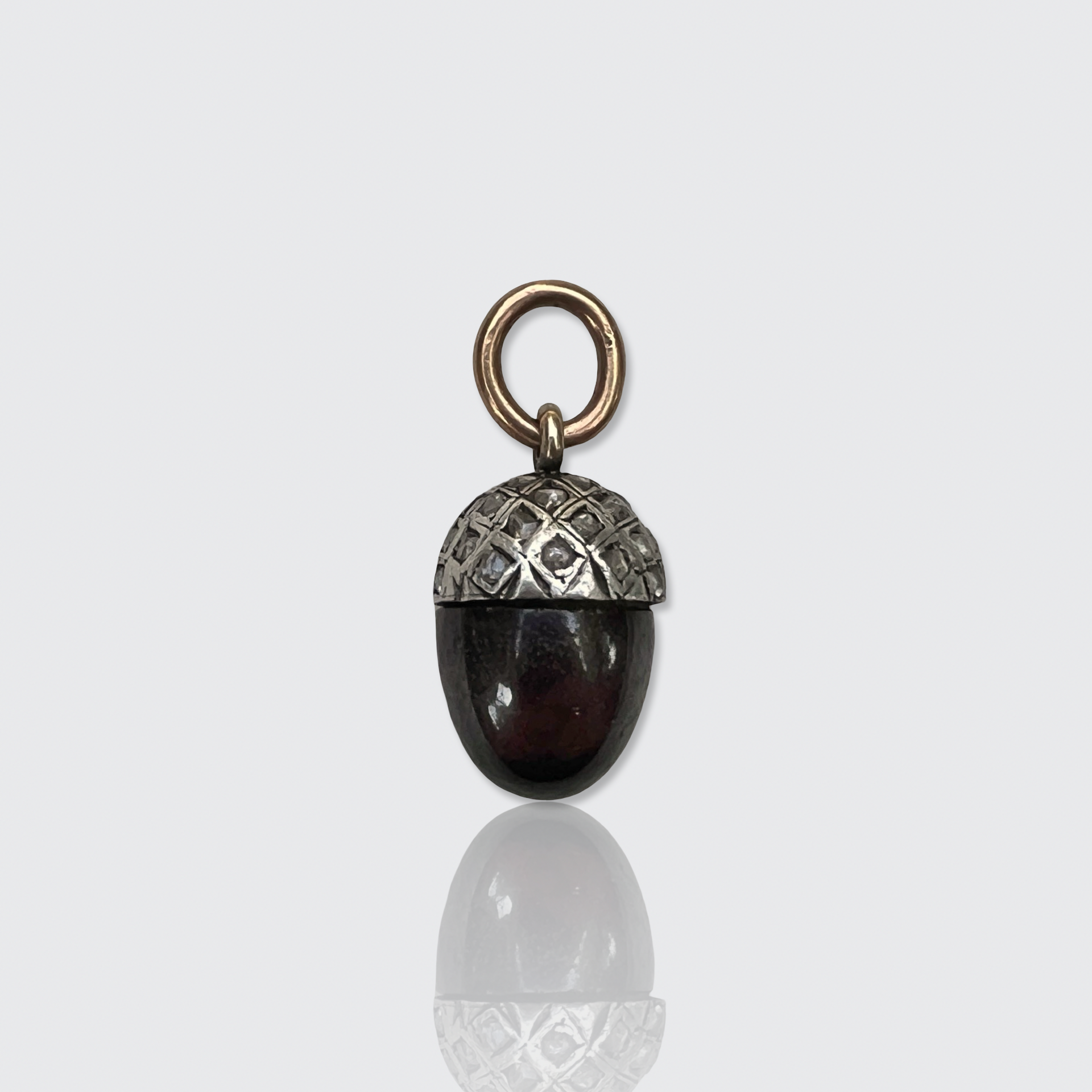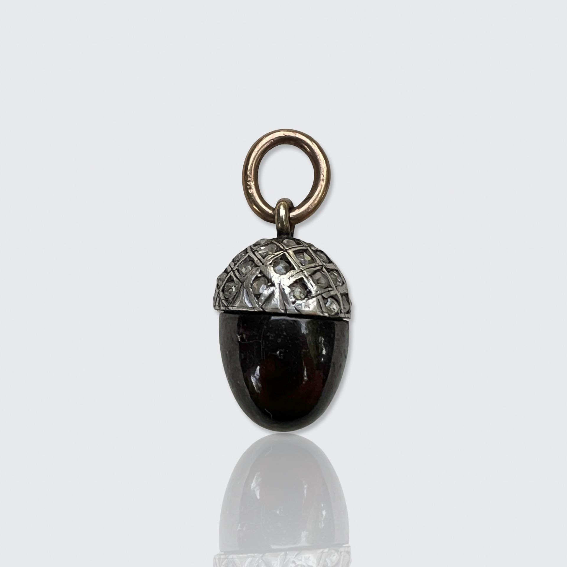 This 19th-century pendant is shaped like a tiny acorn, with the nut made from a cabochon-cut dark red garnet and the cap made from silver, studded with rose-cut diamonds.