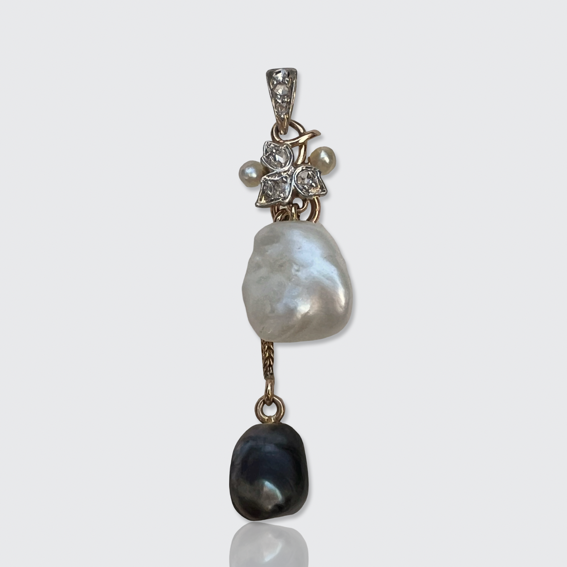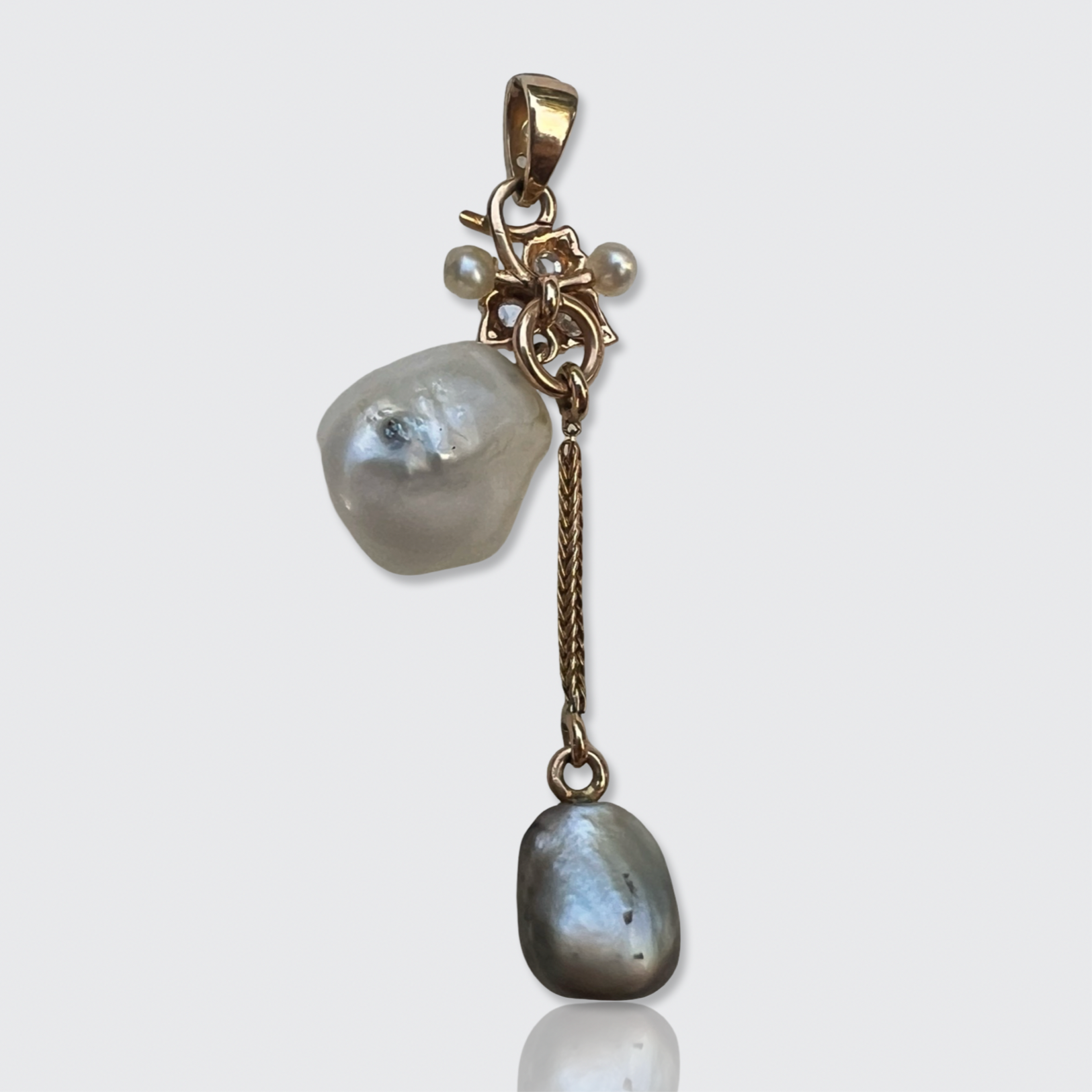 This 14k yellow gold pendant is centered by a leaf-shaped element with two small seed pearls on each side. Below this leaf dangle two natural freshwater pearls: one larger cream-colour baroque-shaped pearl, and a smaller grey-coloured baroque-shaped pearl, which dangles from a gold wheat-link chain. Both the leaf and the jump ring are studded with rose-cut diamonds in platinum settings.