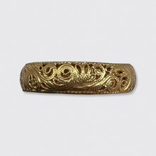 Its design is made from two gold bands: one forming the inner band, and one concave band, which is completely made from gold wire, a technique known as filigree.