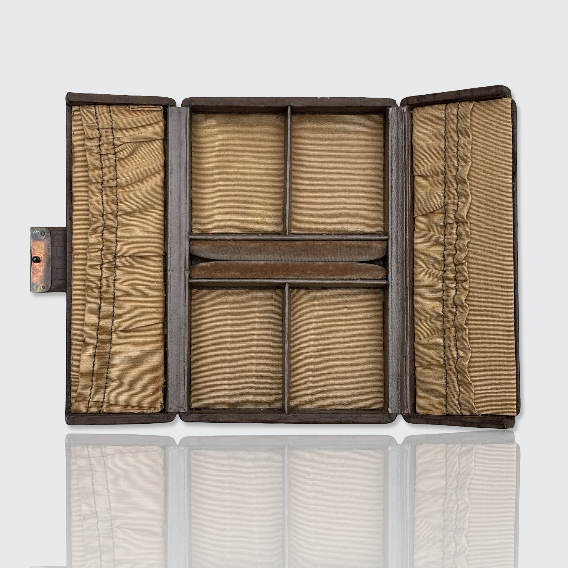 The box is lined with a brown leather lining that has been embossed to appear to be woven. The yellow satin interior opens into two sides, each containing a compartment to store items. The bottom has a ring slot that will fit about 6 rings, and four seperate compartments.