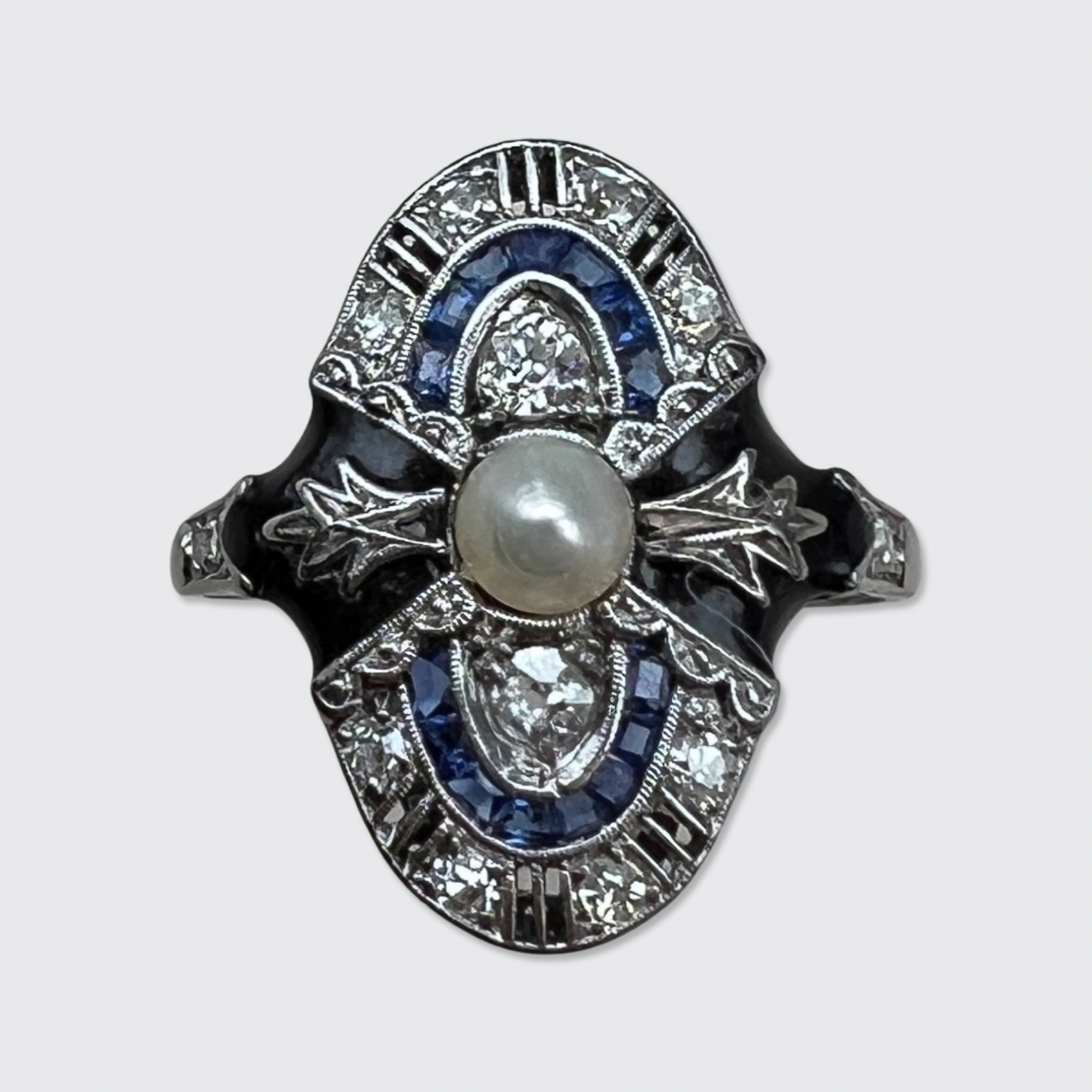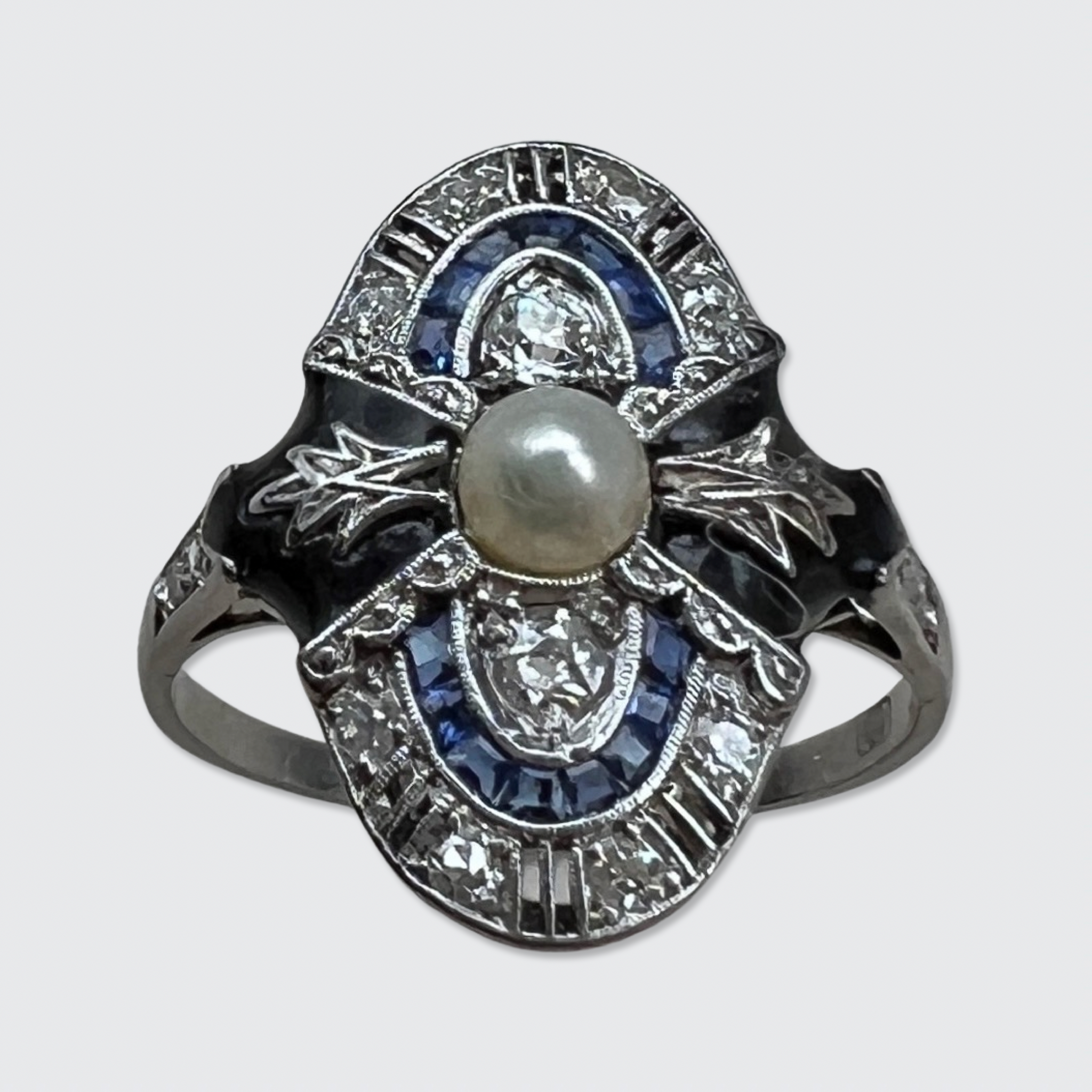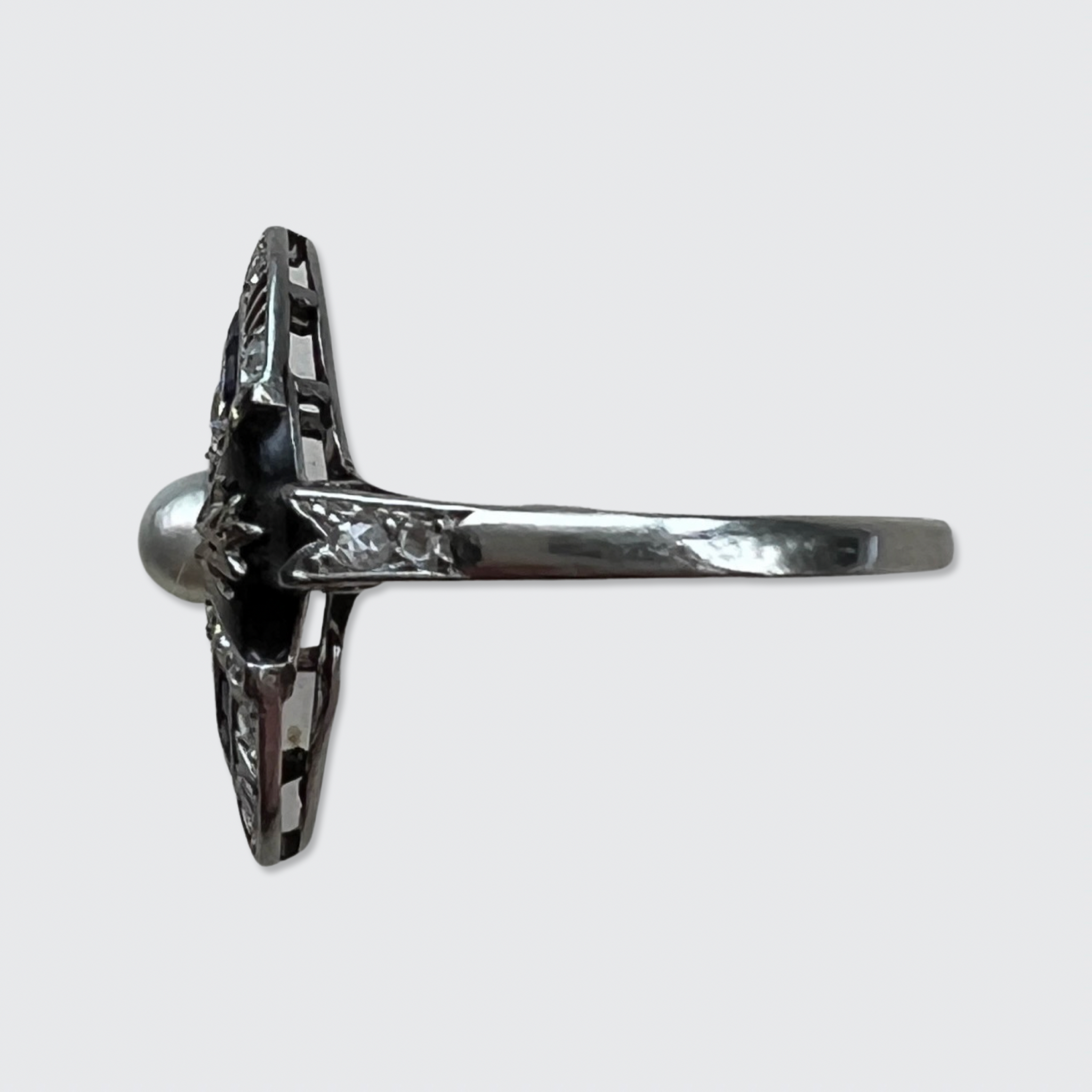 The centre is set with a small cream coloured pearl. Each side is decorated with black enamel, which creates a bold colour contrast with the pale platinum. The ring is further set with two rows of calibrated natural sapphires, two old mine-cut diamonds, and eight rose-cut diamonds.