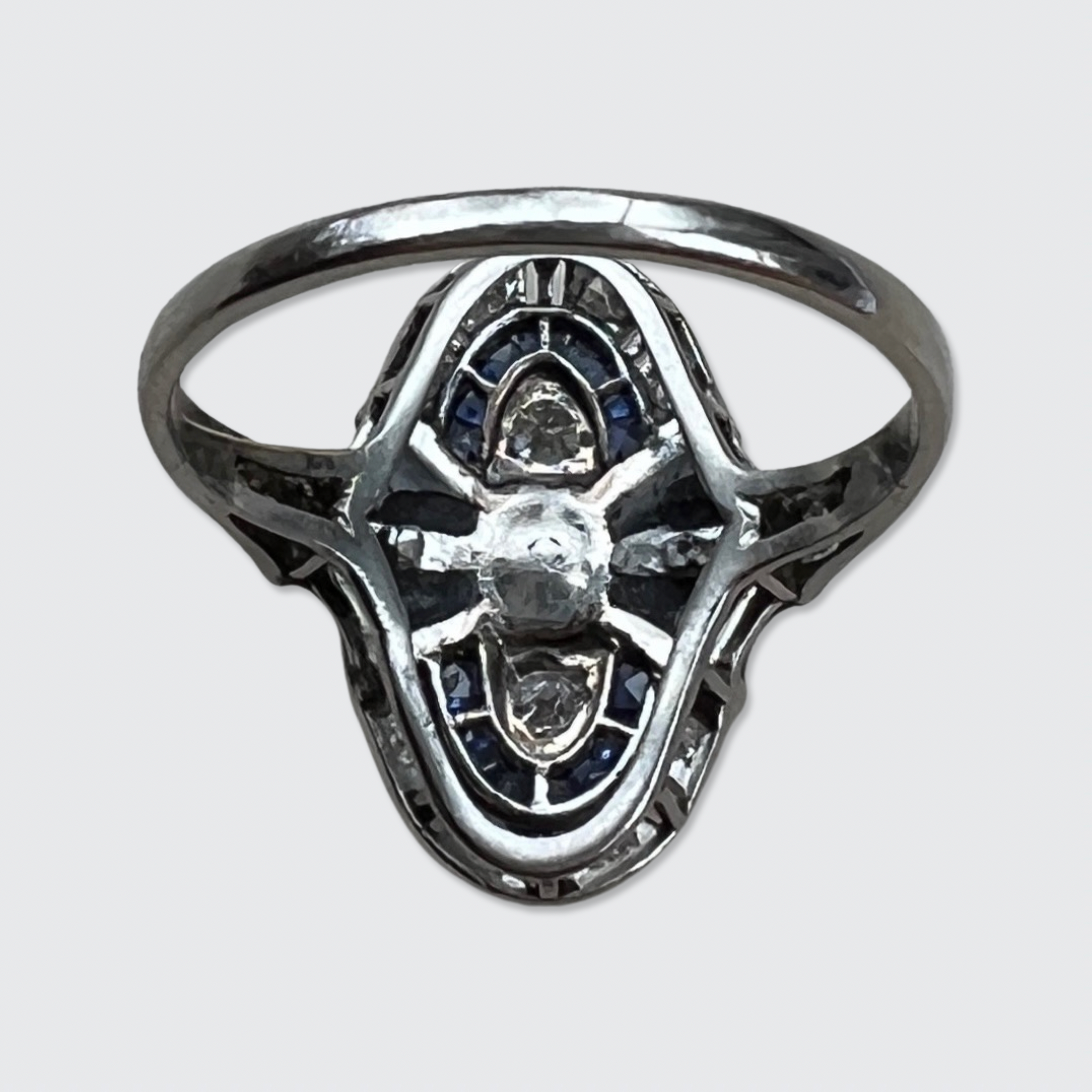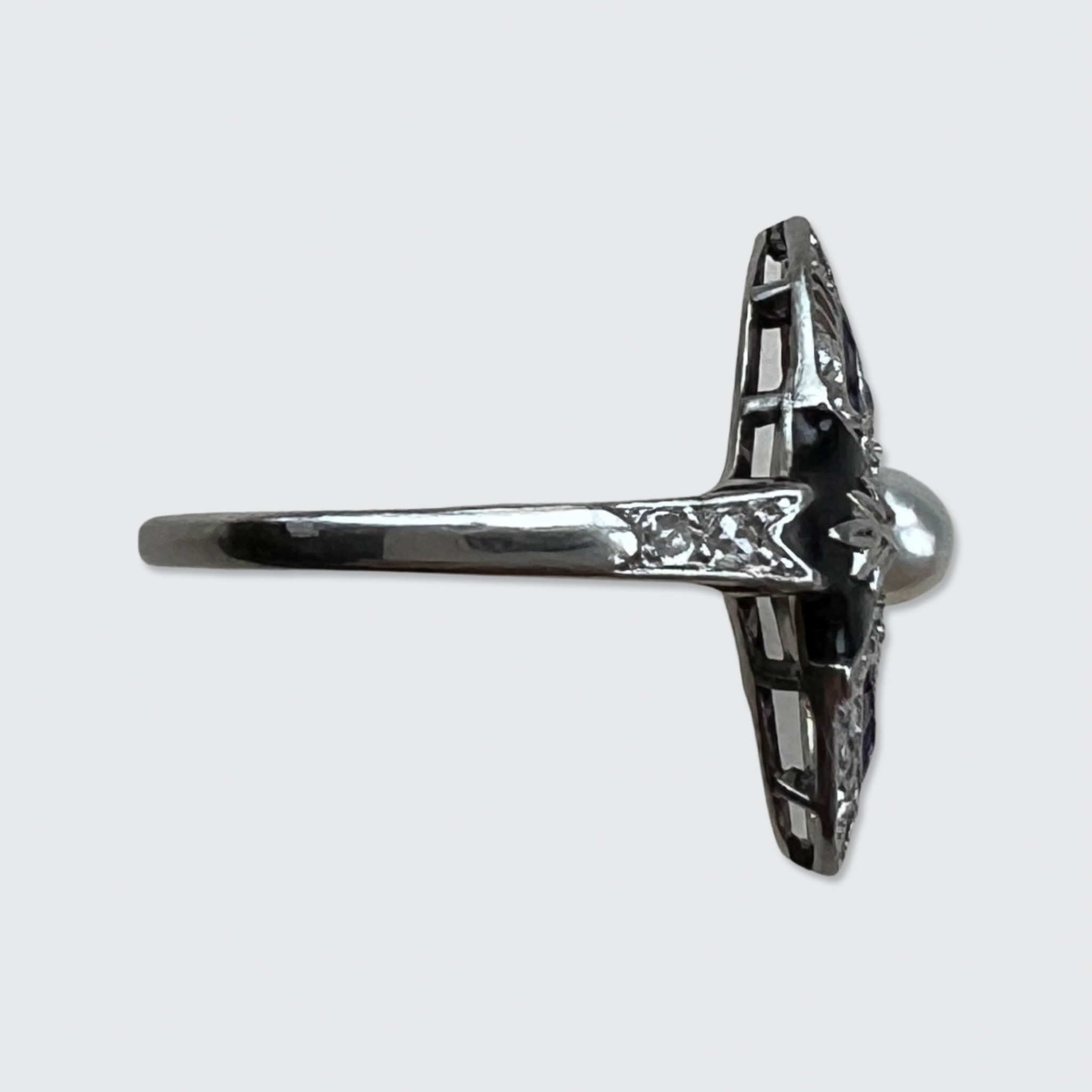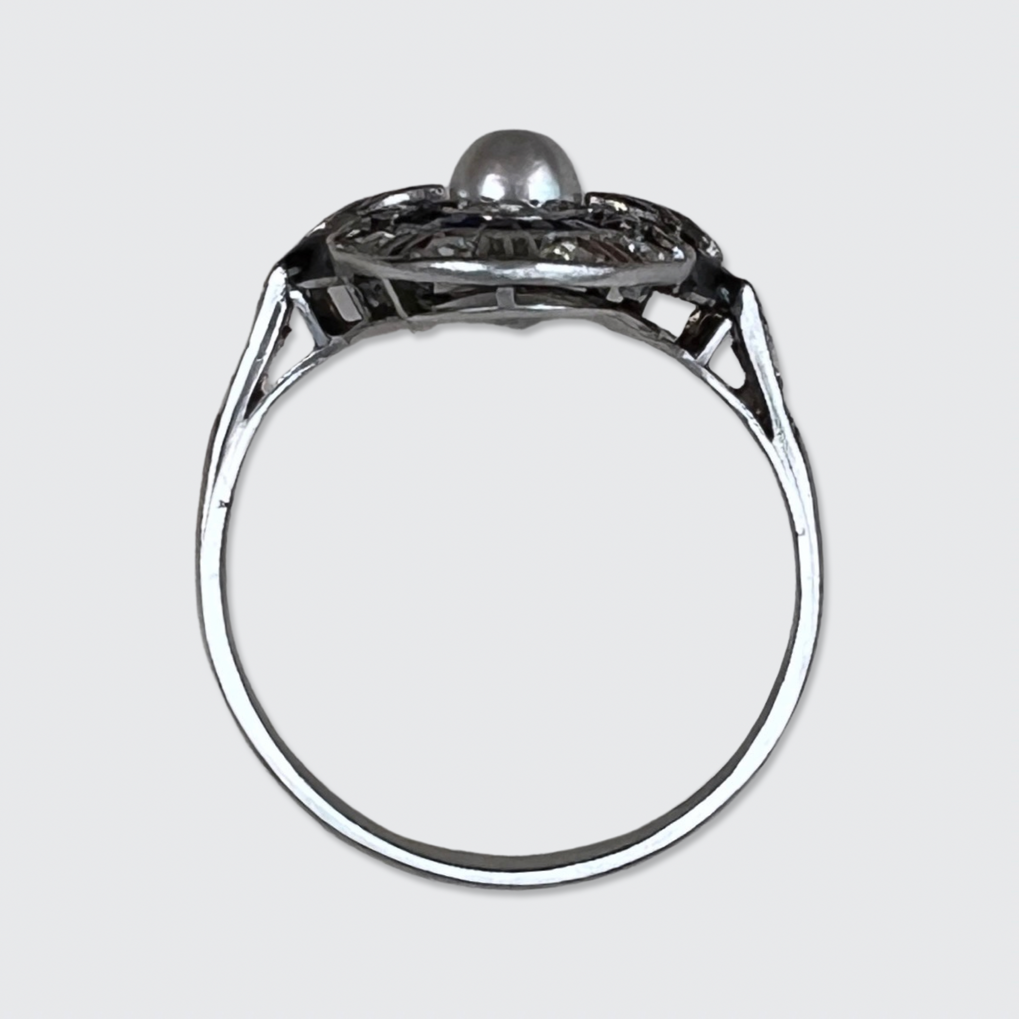 The centre is set with a small cream coloured pearl. Each side is decorated with black enamel, which creates a bold colour contrast with the pale platinum. The ring is further set with two rows of calibrated natural sapphires, two old mine-cut diamonds, and eight rose-cut diamonds.