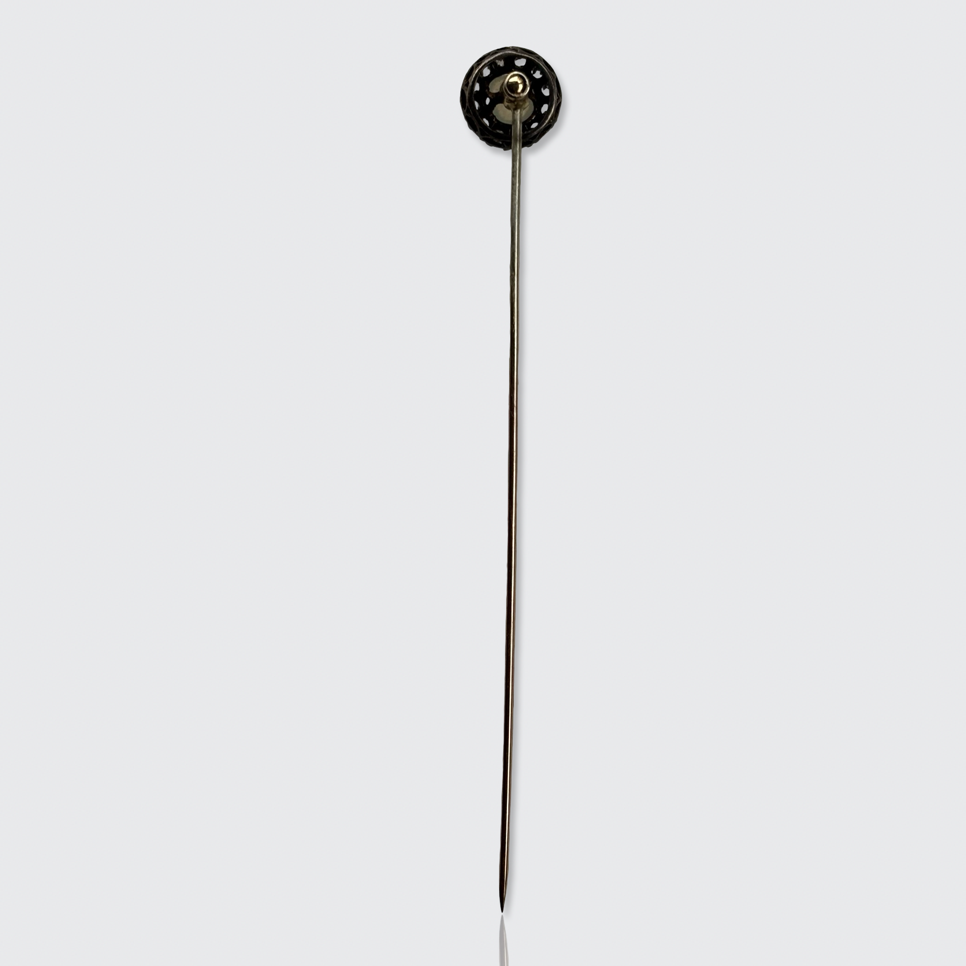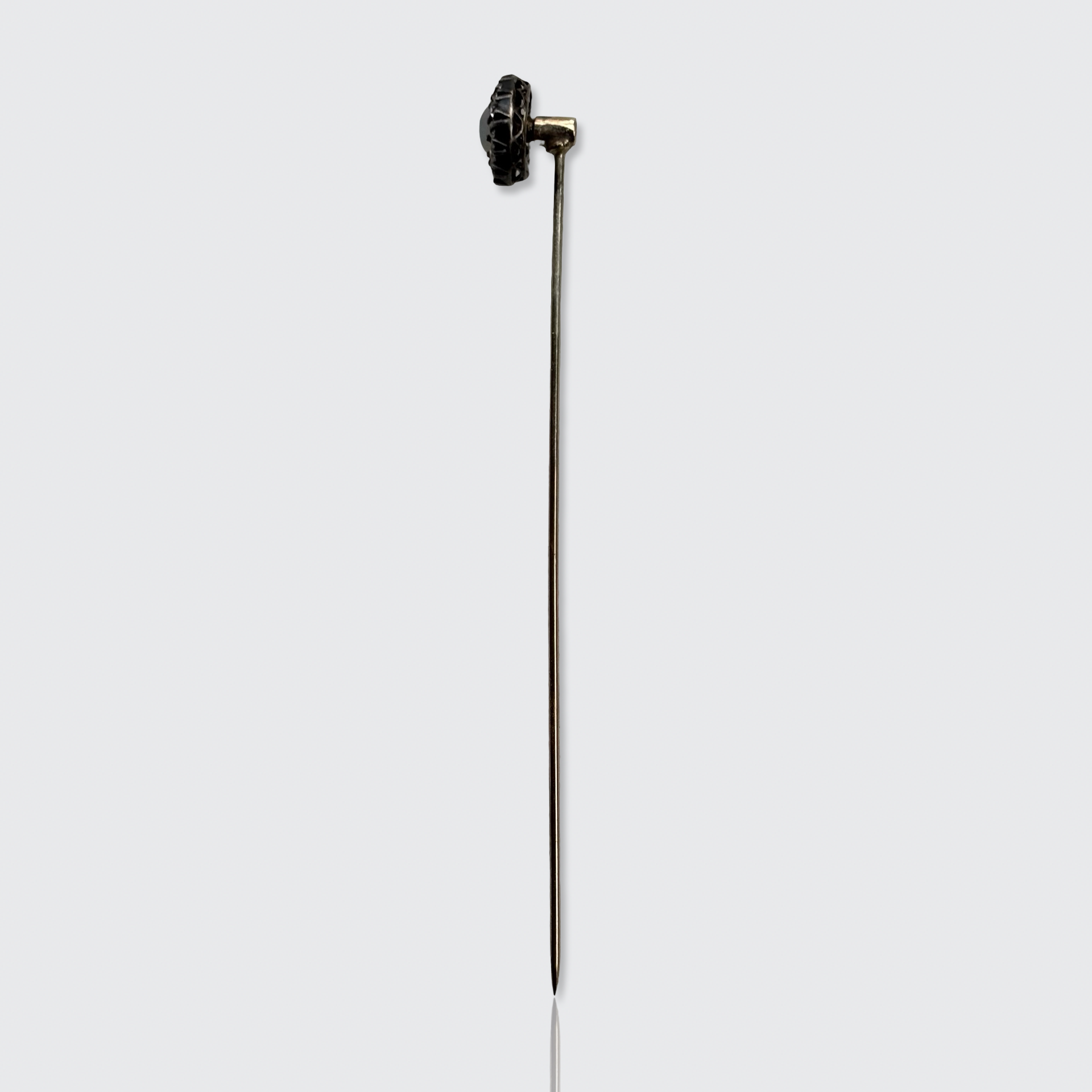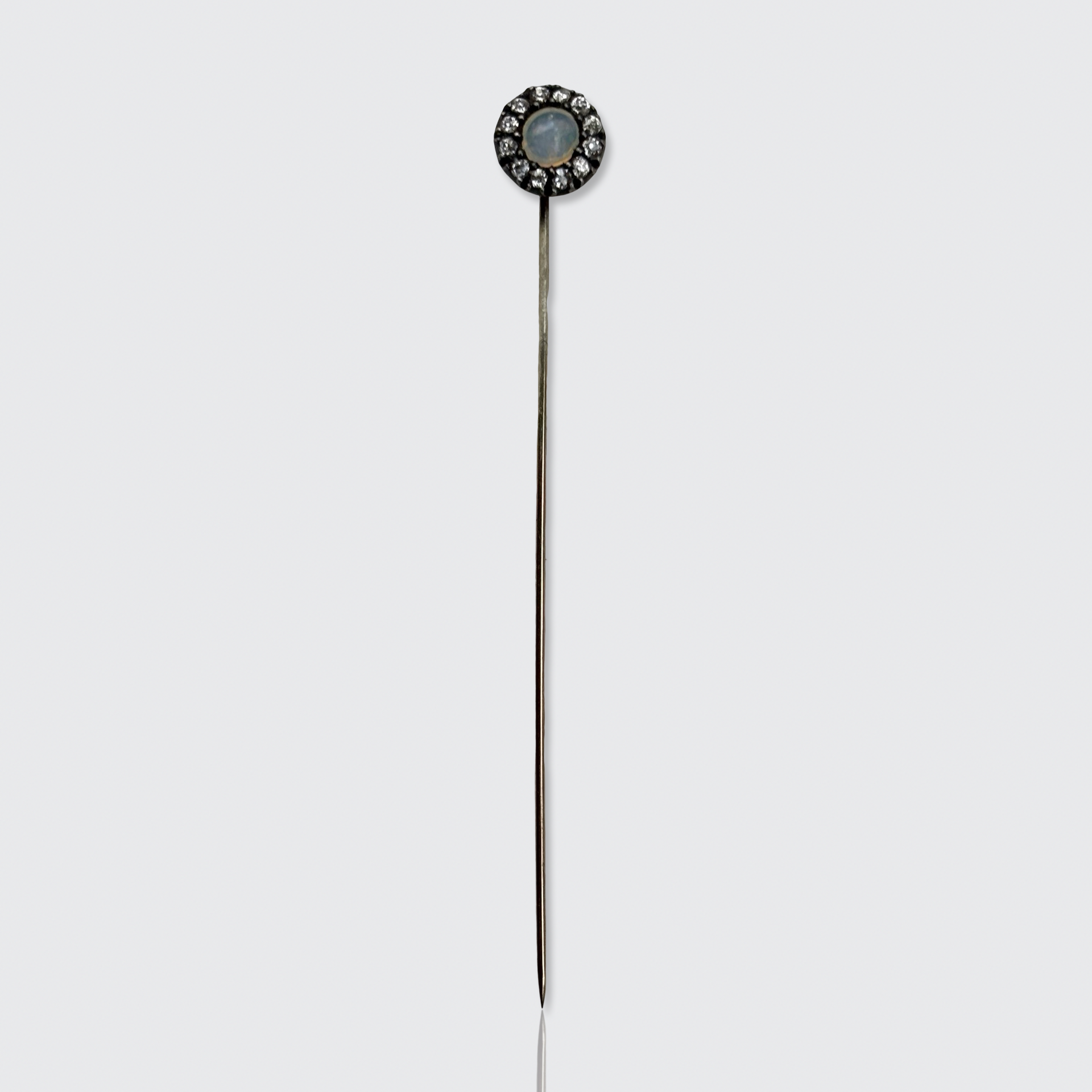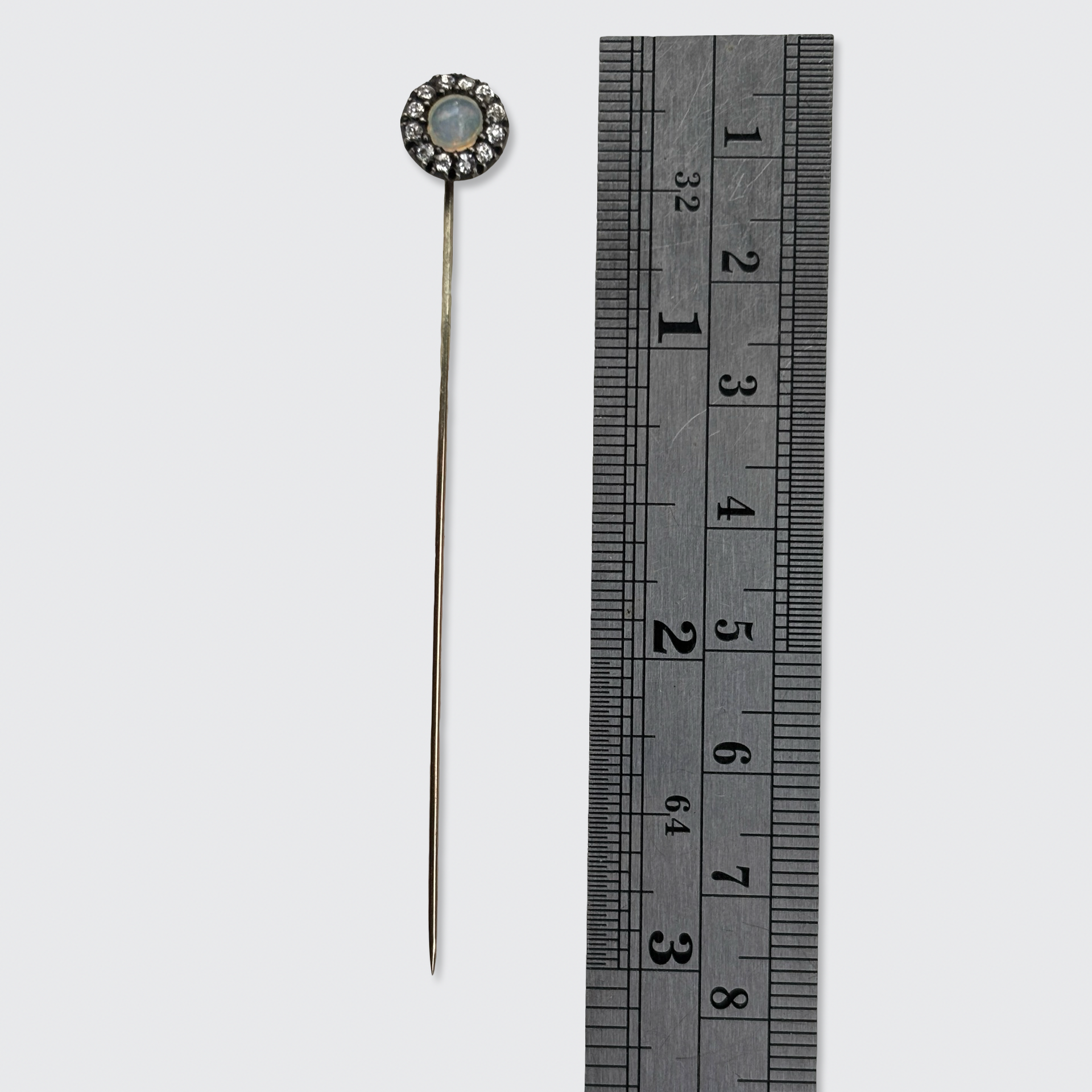 This antique stickpin would have originally been worn in a gentleman's cravat, the predecessor of the necktie. It is set with a round cabochon-cut opal, encircled by a border of tiny antique-cut diamonds.