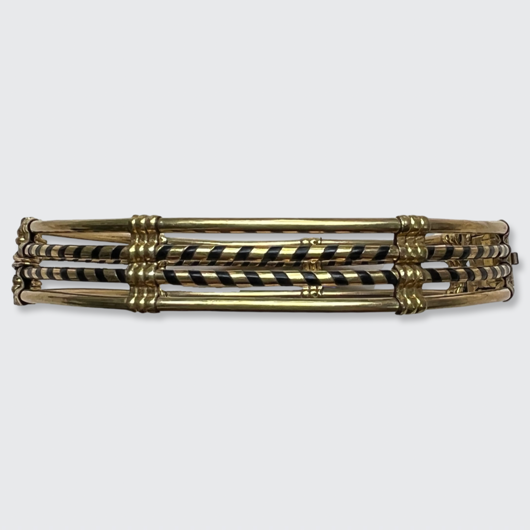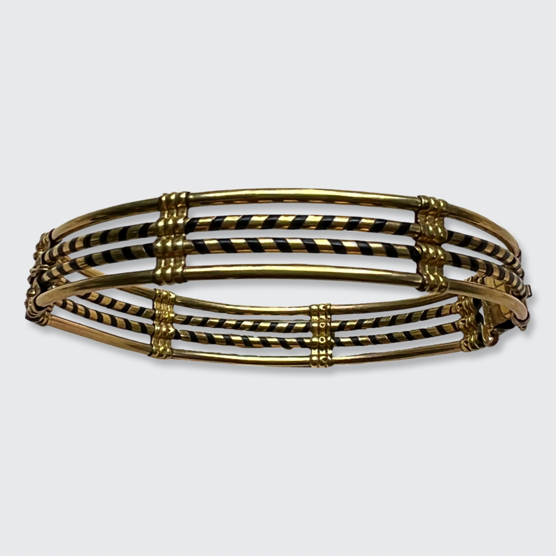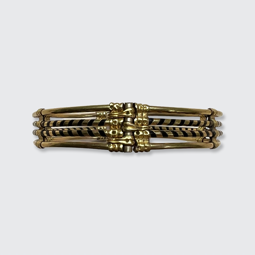 This unique bracelet was likely bought as a safari souvenir in the late 19th Century. It is intricately made from elephant hair and a gold plated metal.