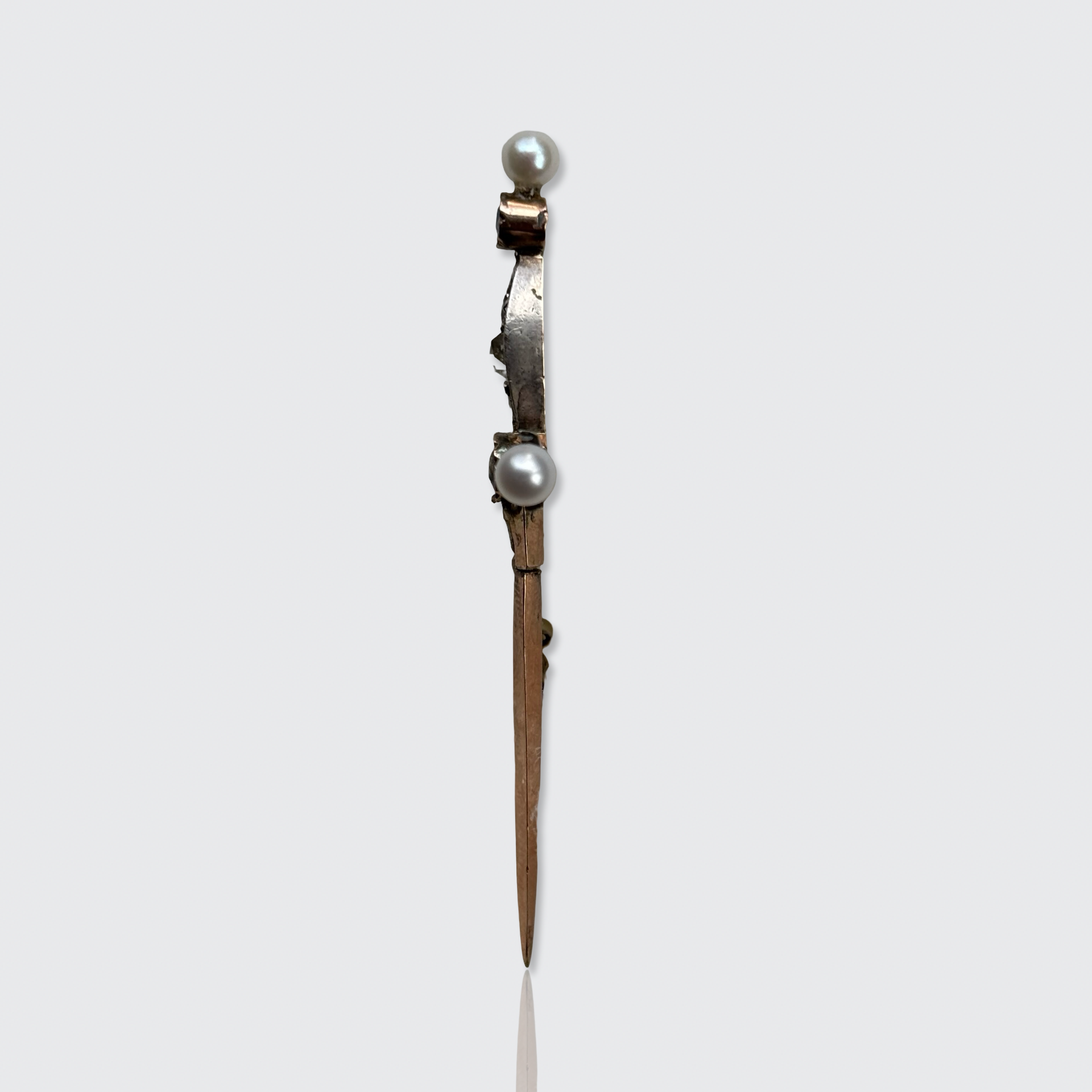 This sword-shaped jabot pin is set with two natural sapphires, rose-cut diamonds, and cultured pearls. The safety chain contains two drilled natural seed pearls.